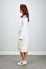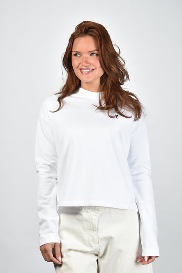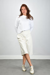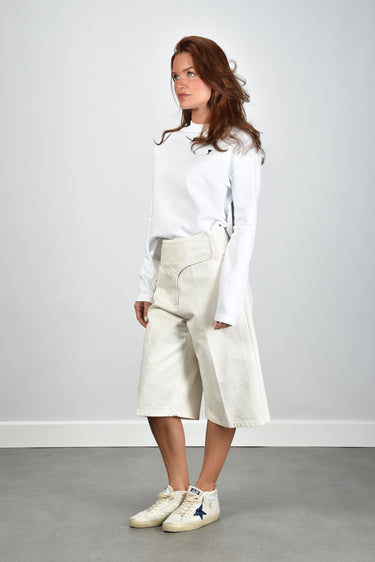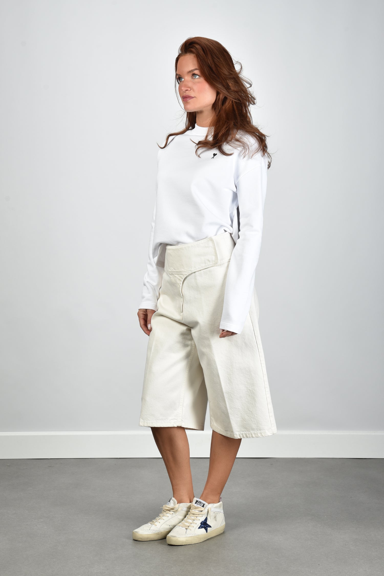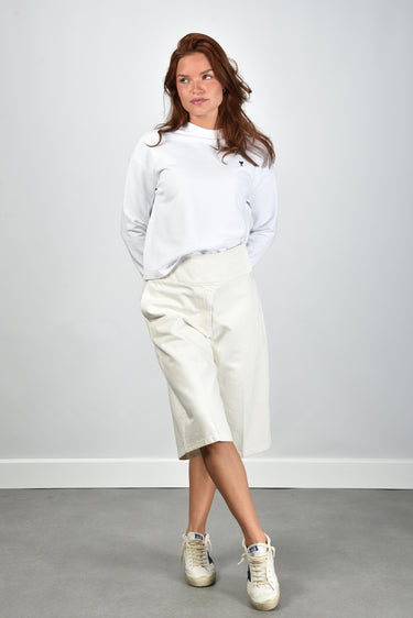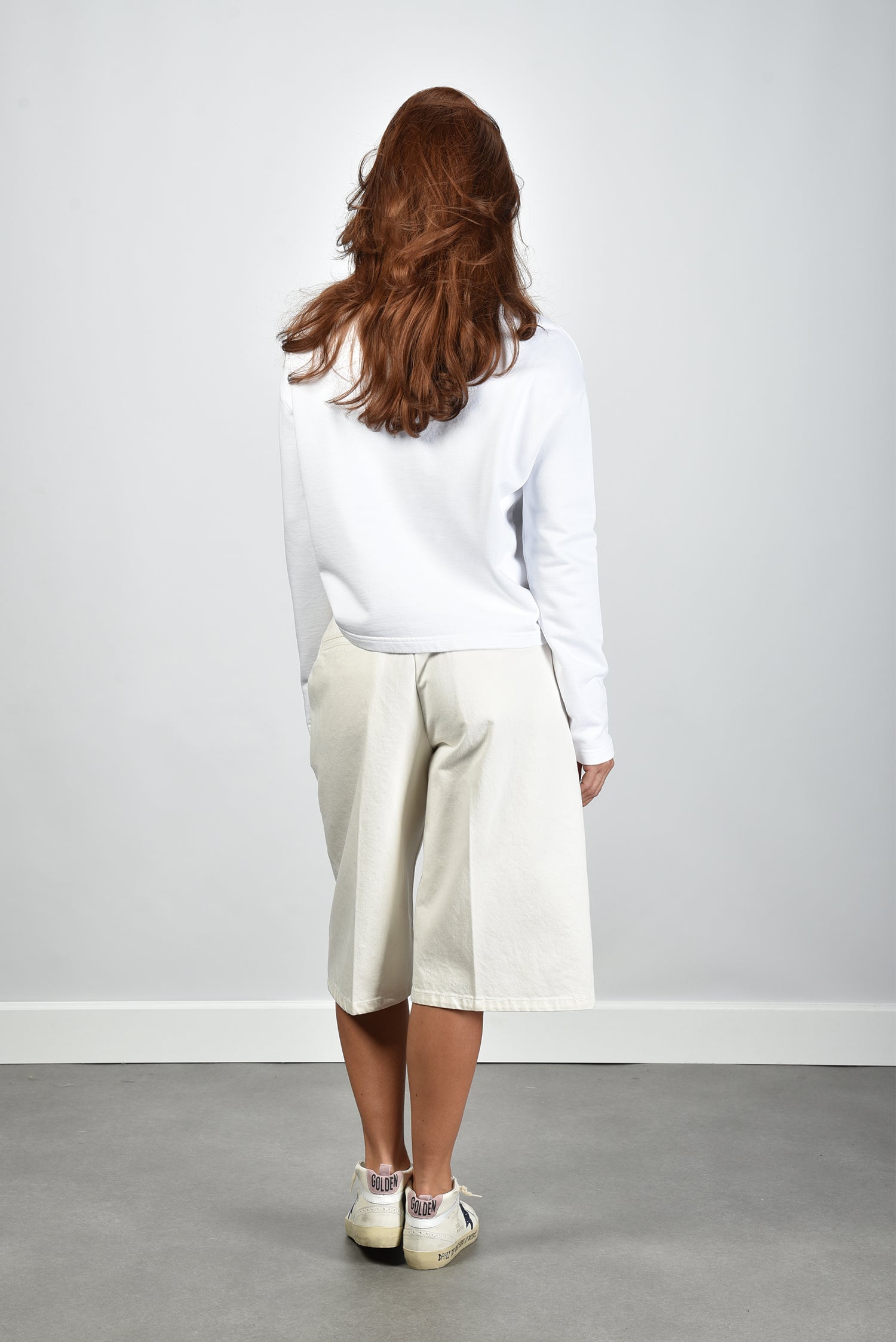Dit is de cropped trui met ronde hals in wit van Ami Paris. Het korte silhouet geeft het model een duidelijke lijn, met een strakke ronde hals die mooi hoog aansluit. Het katoen voelt stevig en glad aan, passend voor wie een wat compactere knit zoekt. Op de borst staat een kleine zwarte vogelprint die het ontwerp subtiel benadrukt. De mouwen vallen recht zonder zichtbare boorden, waardoor de vorm rustig blijft. De kleur blanc houdt het geheel helder en fris. Deze trui valt normaal op maat, dus je eigen maat werkt hier het best. Ami Paris staat bekend om heldere ontwerpen met een minimalistische signatuur, wat in deze trui duidelijk terugkomt.