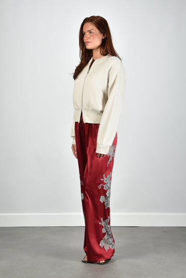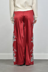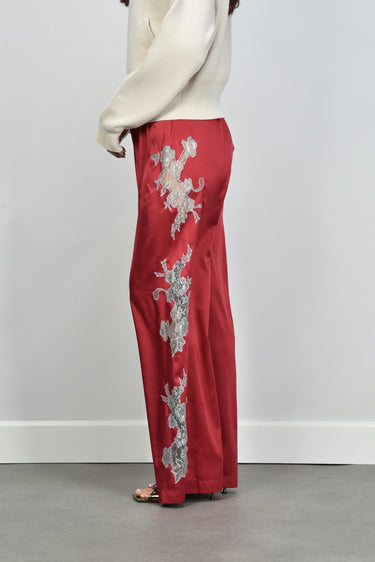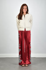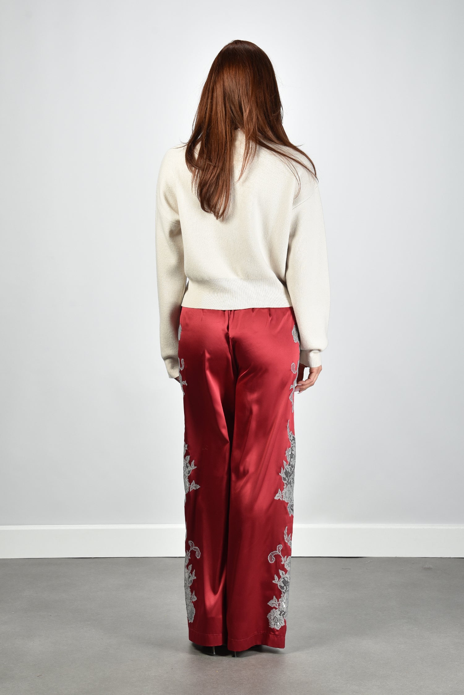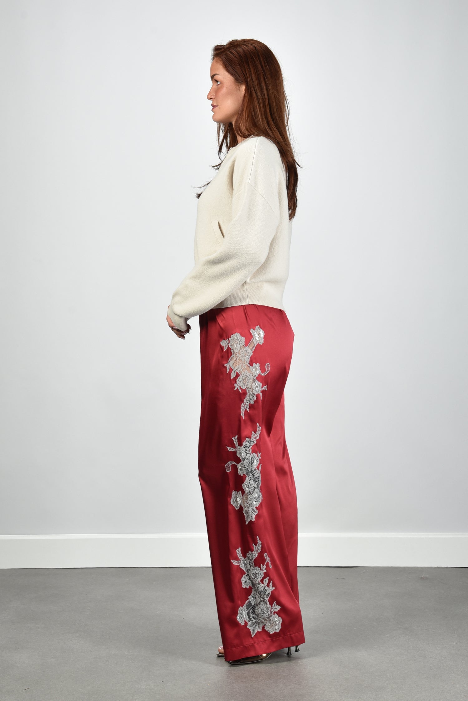 Dit is de broek Lador rood van AVDW, een straight leg model in diepe wijnrode zijde. De soepele stof valt recht omlaag en geeft de broek een lichte swing bij iedere stap. Langs de zijkanten loopt een zilverkleurig bloemenpatroon dat het ontwerp een rustig ritme geeft. De elastische tailleband zit zacht en vormt zich prettig rond het middel. Het kantdetail aan de bovenrand geeft een subtiel accent. Deze broek valt normaal op maat, dus je eigen maat is passend. Annick Van De Weghe werkt graag met zorgvuldig gekozen stoffen en dat zie je hier meteen terug in de manier waarop de zijde beweegt.