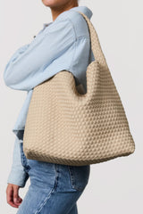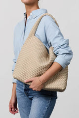 De beige shopper Large Bucket van Marrea heeft precies dat nonchalante raffinement waar het merk om bekendstaat. De tas is met de hand gevlochten en heeft een zachte, ruime vorm die mooi meevormt met wat je bij je draagt. De brede greep vloeit soepel over in het lichaam van de tas, wat zorgt voor een ronde, subtiele lijn. De kleur no tan lines geeft het gevlochten patroon extra diepte en maakt de tas geschikt voor elk seizoen. De lichte mix van polyester, nylon en spandex houdt de shopper stevig en soepel tegelijk. Dankzij de handige magneetsluiting sluit hij eenvoudig, zonder zijn vorm te verliezen. Marrea ontwerpt in Amsterdam en haalt inspiratie uit het strand en het gevoel van vrijheid dat daarbij hoort. Deze Large Bucket shopper laat dat zien in elke vezel, met een ontspannen uitstraling en zorgvuldige afwerking. Combineer met de Marrea shopper Large Bucket retro sand voor een harmonieuze set met variatie in toon en textuur.