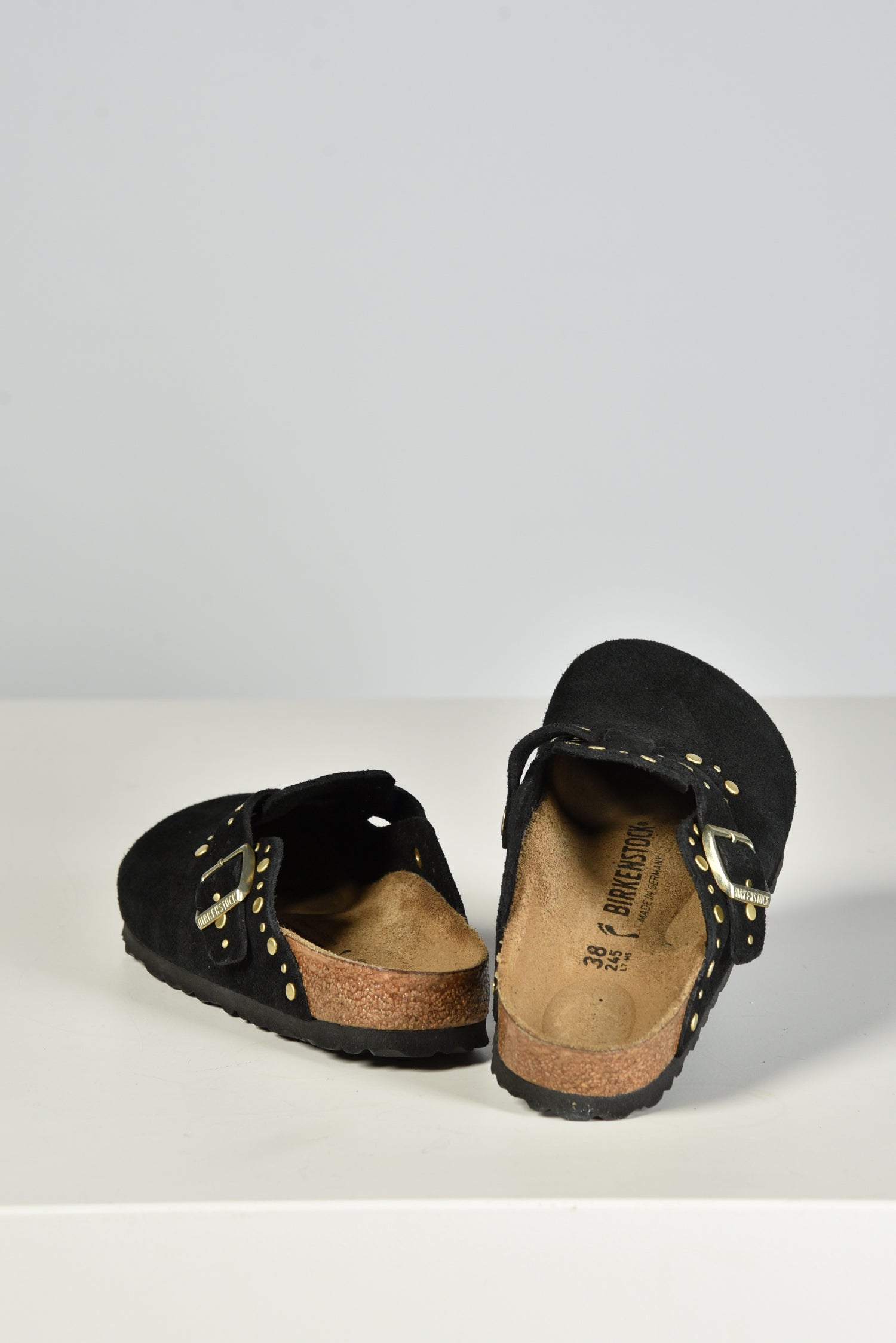 De loafers Boston Rivets zwart van Birkenstock voelen direct bijzonder door het zachte suede in diep zwart. De goudkleurige studs geven een subtiele glans langs de zijkant en bovenkant. Op de wreef valt een brede, zilverkleurige gesp op die het model een stoere twist geeft. De stevige, kurkachtige zool met zwart profiel zorgt voor ondersteuning en grip. Deze loafers vallen normaal op maat en zitten zoals je van Birkenstock gewend bent: comfortabel en solide. Combineer ze met de Birkenstock slippers Boston Suede Leather mink voor een ongedwongen, stijlvolle set.