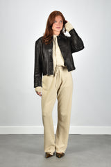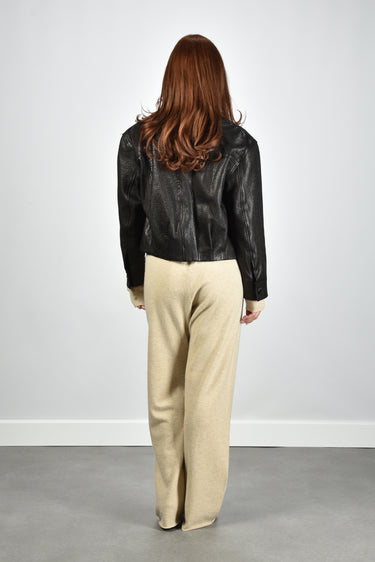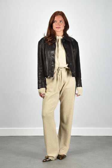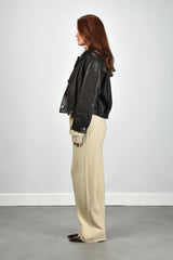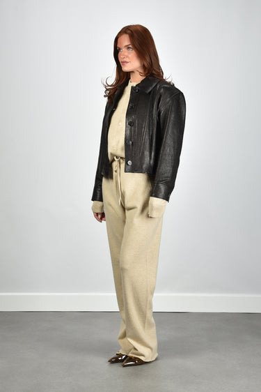 Dit is de jas Kate zwart van Nubikk. De jas valt meteen op door de grove structuur van het leer, stevig en met een duidelijke korrel die je goed ziet. De brede kraag met scherpe punten geeft het silhouet extra karakter, terwijl de grote donkere knopen voor een rustige lijn aan de voorkant zorgen. Het leer voelt compact en vormt zich soepel om het lichaam. De pasvorm is normaal, dus je kunt uitgaan van je eigen maat. De kleur black grain sluit goed aan bij de stoere stijl waarin Nubikk bekendstaat om zijn moderne en vooruitstrevende ontwerpen.