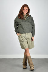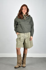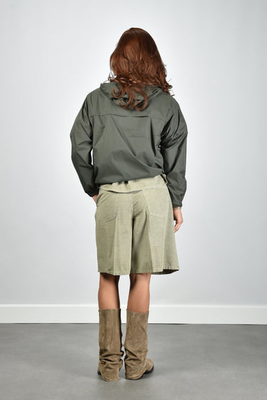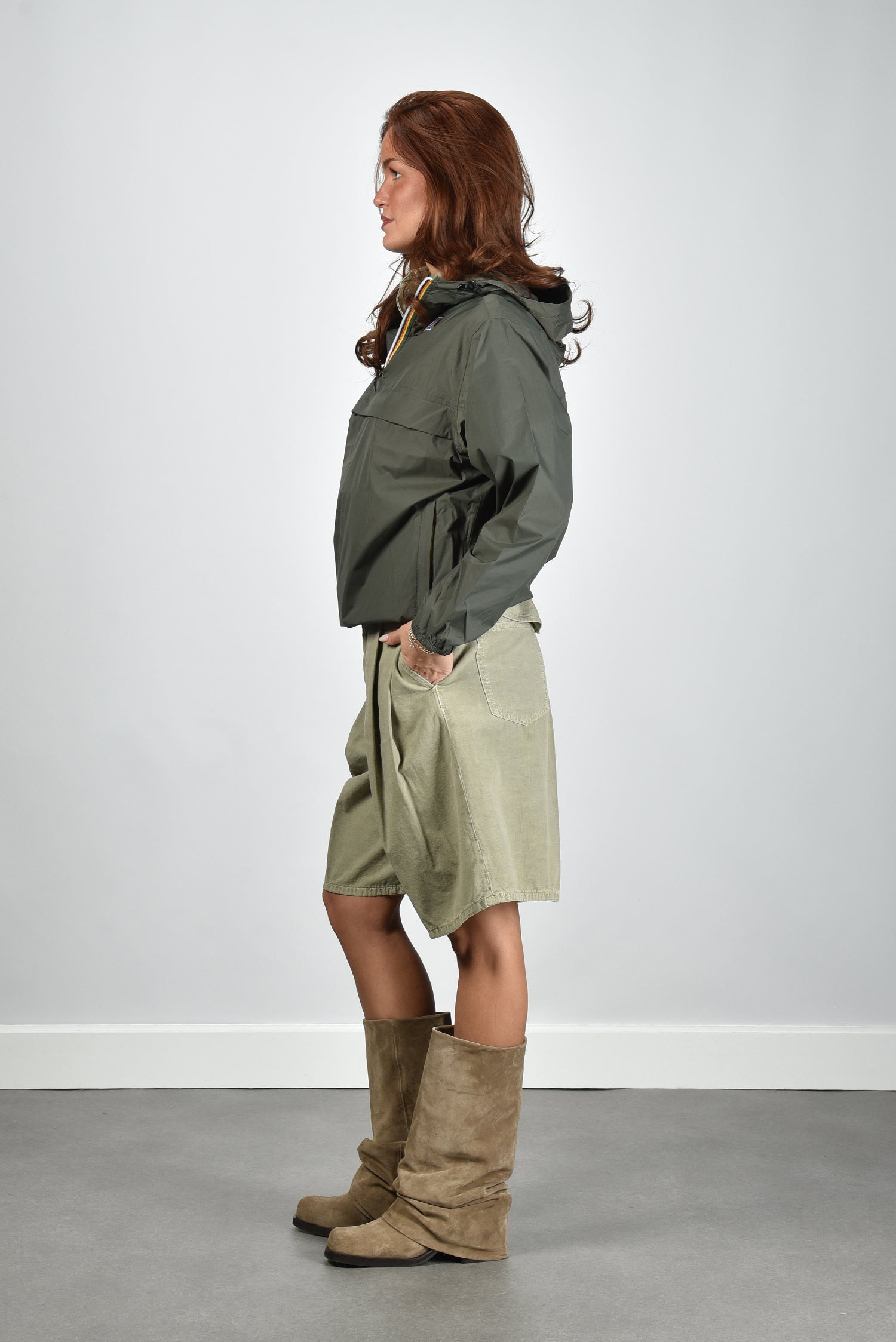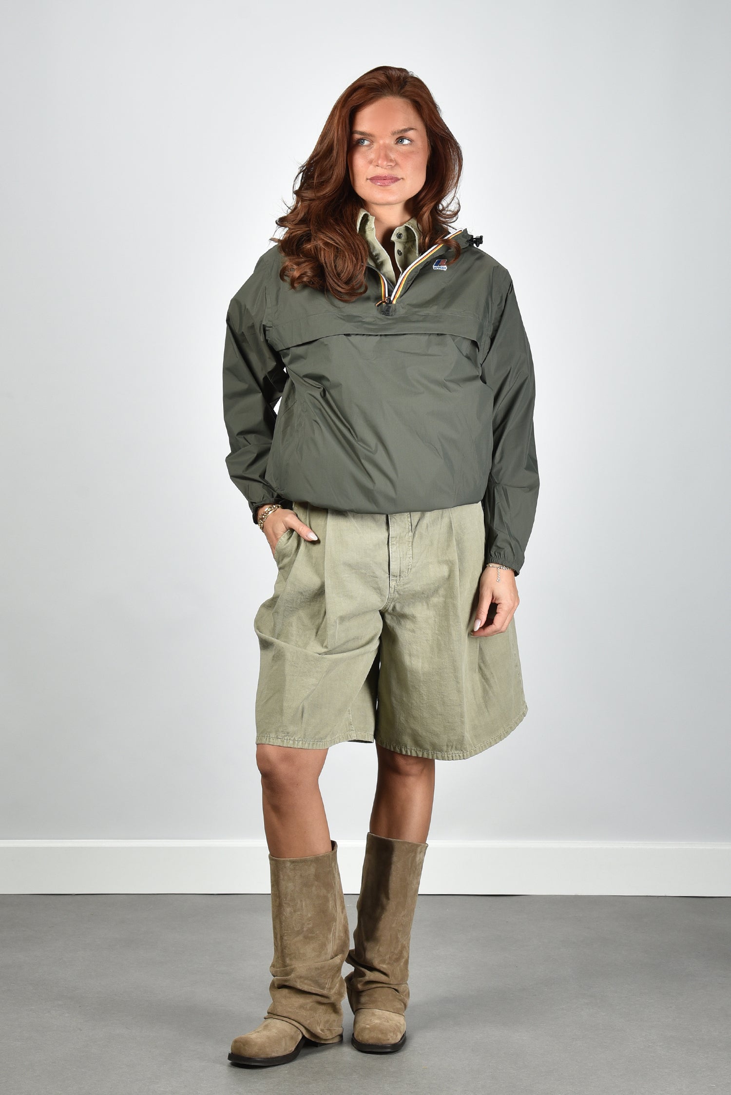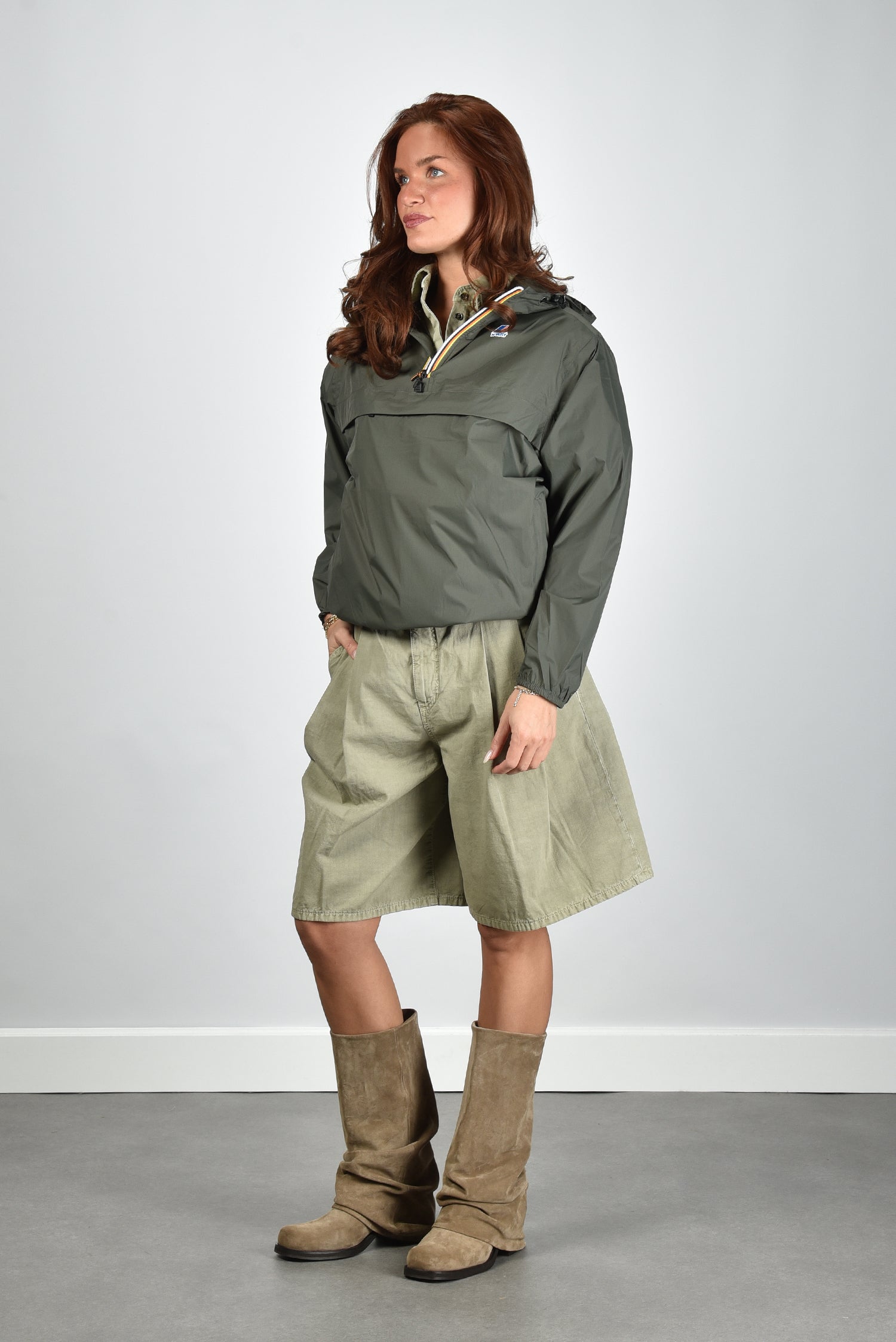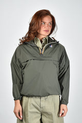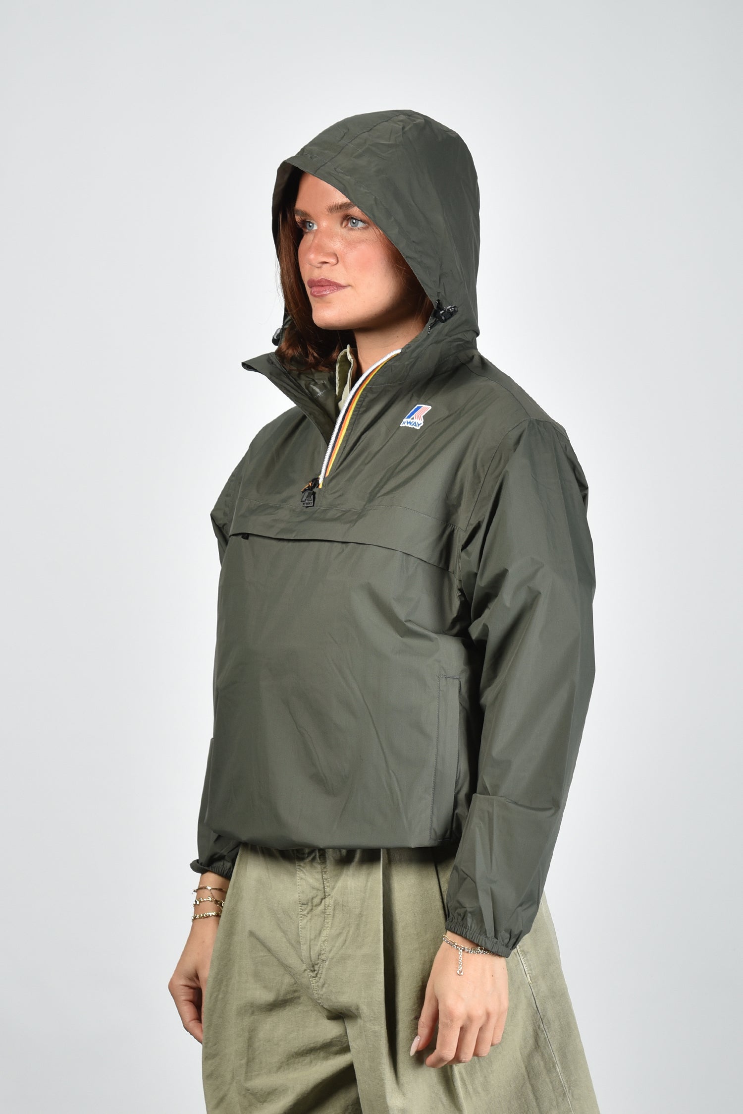 Dit is het jack Leon van K-Way, uitgevoerd in groen met een compacte halve ritssluiting. De stof van polyamide voelt licht aan en houdt de vorm strak. De hoge kraag sluit netjes aan en laat de kleurrijke accenten goed uitkomen. De capuchon ligt soepel in de hals en geeft het model een praktische laag. De mouwen vallen ruim en sluiten af met elastische manchetten, waardoor het silhouet rustig blijft. Het logo op de borst is klein en direct herkenbaar. Deze uitvoering in green blackish heeft een losse pasvorm die prettig over kleding valt. Het jack valt normaal op maat, dus je eigen maat werkt hier het beste. K-Way staat bekend om lichte ontwerpen die techniek en eenvoud samenbrengen, en dat zie je in dit model terug.