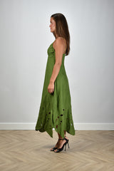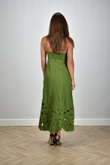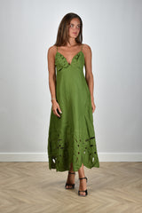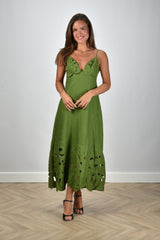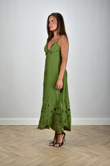 Farm Rio jurk 335747 met detail van bladeren op de buste en opengewerkt groen
