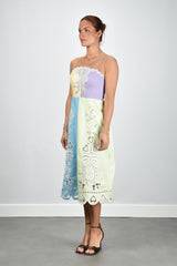 De veelkleurige geborduurde jurk multicolour van Farm Rio valt meteen op door haar levendige paneelontwerp in zachte pasteltinten. De linnen stof voelt luchtig en soepel aan, ideaal voor zonnige dagen. Het borduurwerk toont subtiele bloemmotieven die samen een speels patroon vormen. De golvende zoom met decoratieve uitsnijdingen geeft de midi lengte een zorgvuldige afwerking. Deze jurk valt normaal op maat. Combineer haar met de Morobe sandalen Mimi 05 black voor een complete, zomerse look. Farm Rio brengt kleur en creativiteit samen in elk detail, rechtstreeks uit de energie van Rio de Janeiro.
