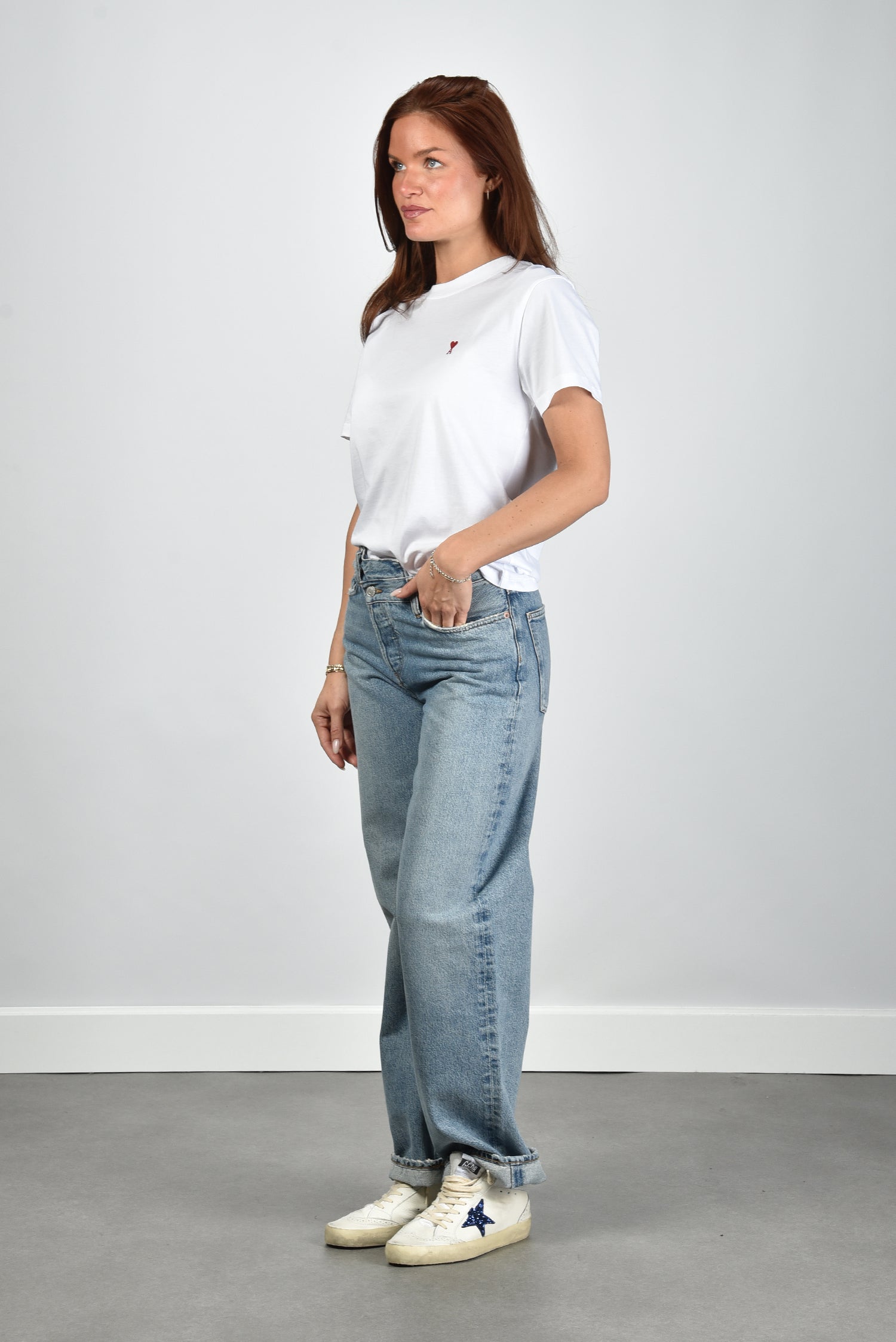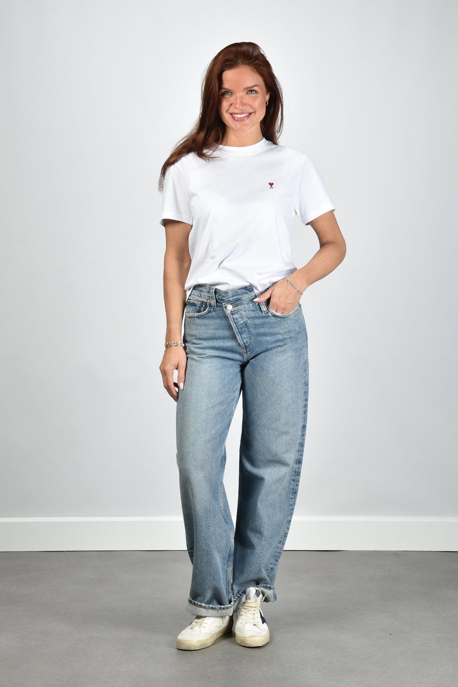 Het t-shirt ADC Ts Rouge van Ami Paris is zo’n item dat meteen goed voelt. Gemaakt van 100 procent katoen met een gladde, compacte stof die prettig op de huid ligt. Het witte shirt heeft een rechte pasvorm, korte mouwen en een ronde hals. Op de borst staat subtiel het rode Ami de Coeur-logo, dat het ontwerp iets eigens geeft. Draag het t-shirt ADC Ts Rouge blanc met een jeans of onder een blazer voor een ontspannen, verzorgde look. Combineer het eventueel met de Golden Goose sneakers Superstar voor een moderne, nonchalante styling. Het shirt valt normaal op maat, dus je kunt gewoon je eigen maat nemen.