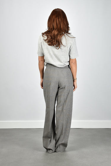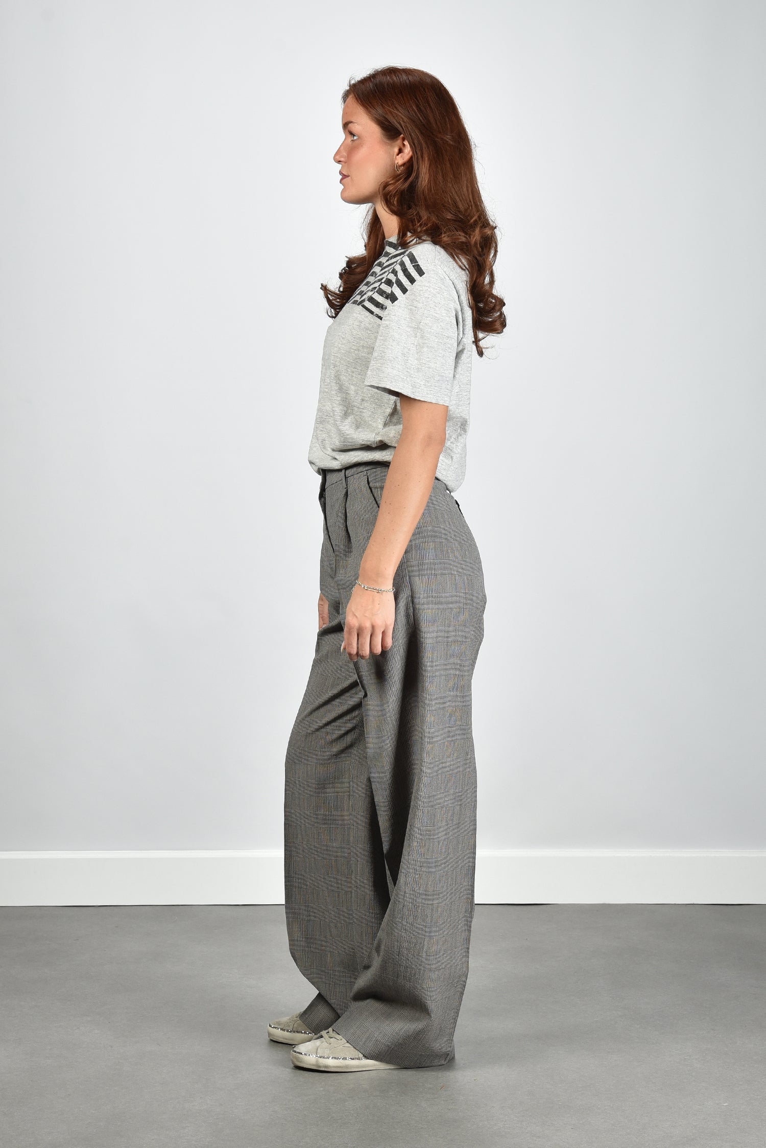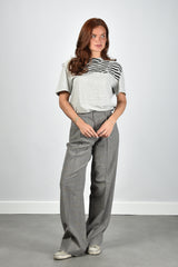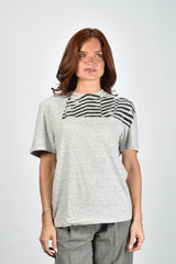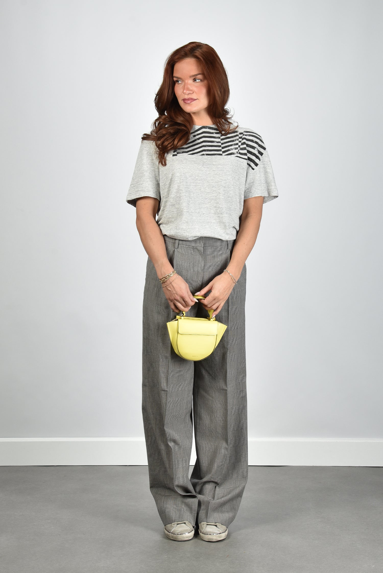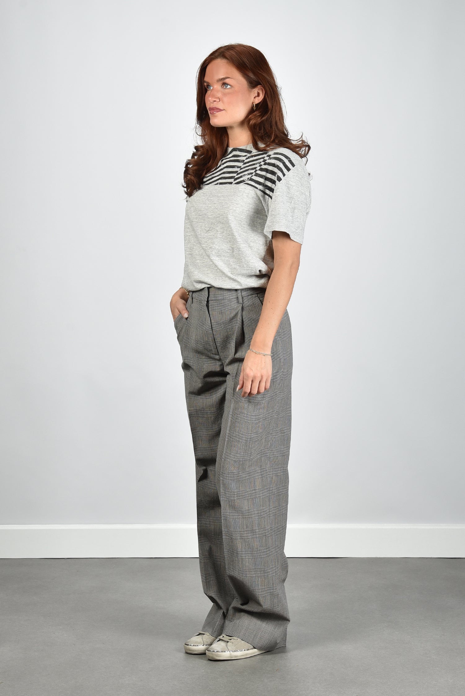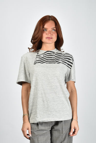 Hier zie je het t shirt grijs van Golden Goose, een soepel model met een ronde hals en korte mouwen. De grey melange kleur vormt een zachte basis waarop de zwart witte strepen over borst en schouders duidelijk zichtbaar zijn. Het katoen voelt licht en stevig tegelijk, met een fijne structuur die mooi aansluit zonder strak te zitten. De pasvorm valt normaal op maat, dus je eigen maat werkt hier het best. Golden Goose staat bekend om zijn Italiaanse vakmanschap en dat merk je aan de zorgvuldige afwerking van dit eenvoudige maar sterke ontwerp.