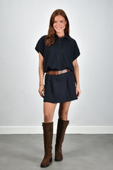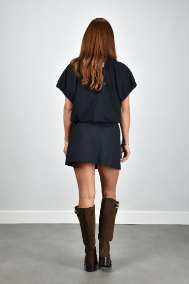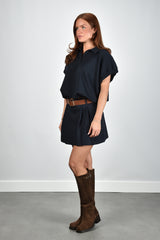 Hier zie je de top Mellie van JOHNY, een donkerblauwe polo in navy met een stevige polokraag en een korte knoopsluiting. De wijde, korte mouwen vallen ruim en hebben een geplooide rand die zacht volume geeft. Het silhouet is losvallend en voelt licht door het sweatermateriaal. De verstelbare elastische tailleband laat je de vorm makkelijk aanpassen. Het katoen draagt prettig en blijft mooi in model. Deze top heeft een normale pasvorm; je eigen maat werkt het best. JOHNY staat bekend om Belgisch design met een stoere Britse rand, uitgevoerd met aandacht voor detail en kwaliteit, en dat zie je ook hier terug.