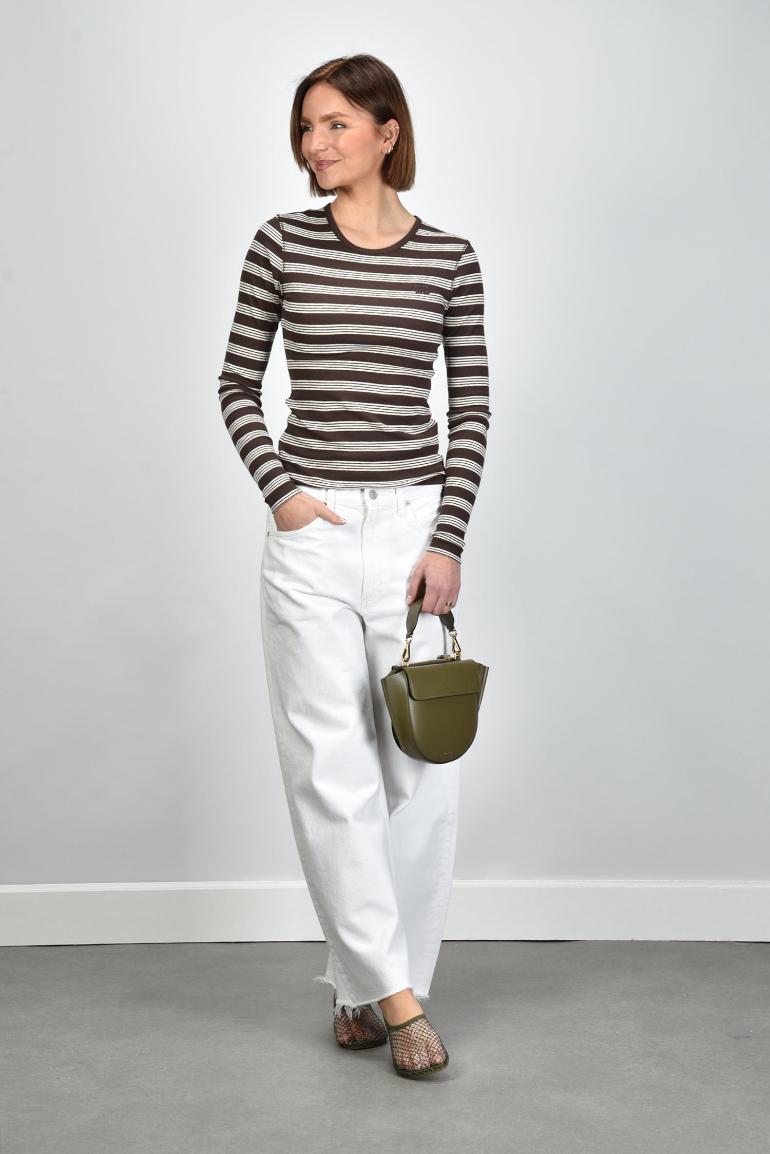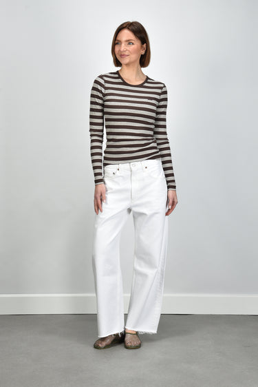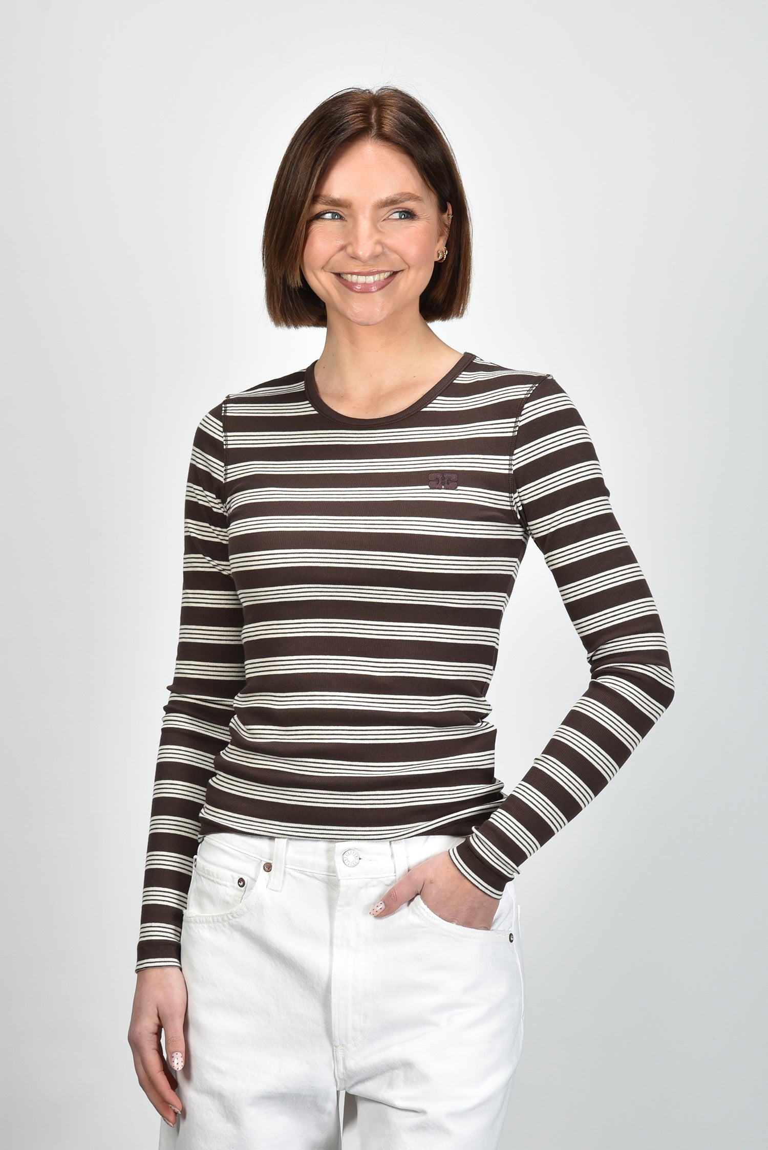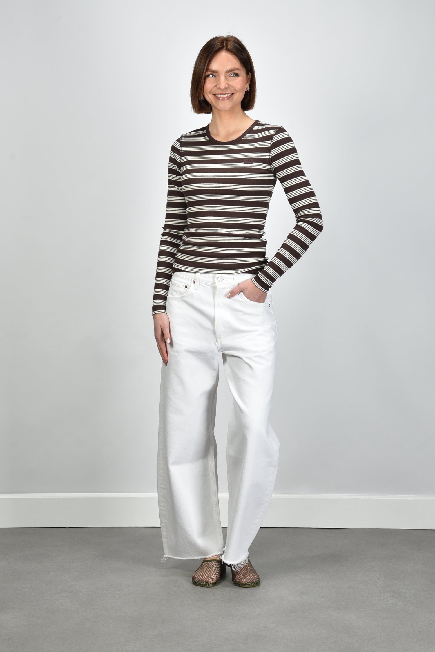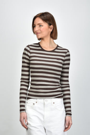 De cropped top met lange mouwen van Ganni heeft een ontspannen uitstraling door het korte model en de horizontale bruine-witte strepen. De ronde hals en het subtiele logo op de borst geven het ontwerp een speels effect. Gemaakt van 95% katoen en 5% elastane voelt de stof soepel aan en blijft deze mooi in vorm. De top valt normaal op maat, dus je kunt gewoon je gebruikelijke maat kiezen. Combineer hem met de Agolde jeans Low Curve Fray A238-1183 milkshake voor een frisse, casual look met een vleugje Scandinavische cool.