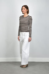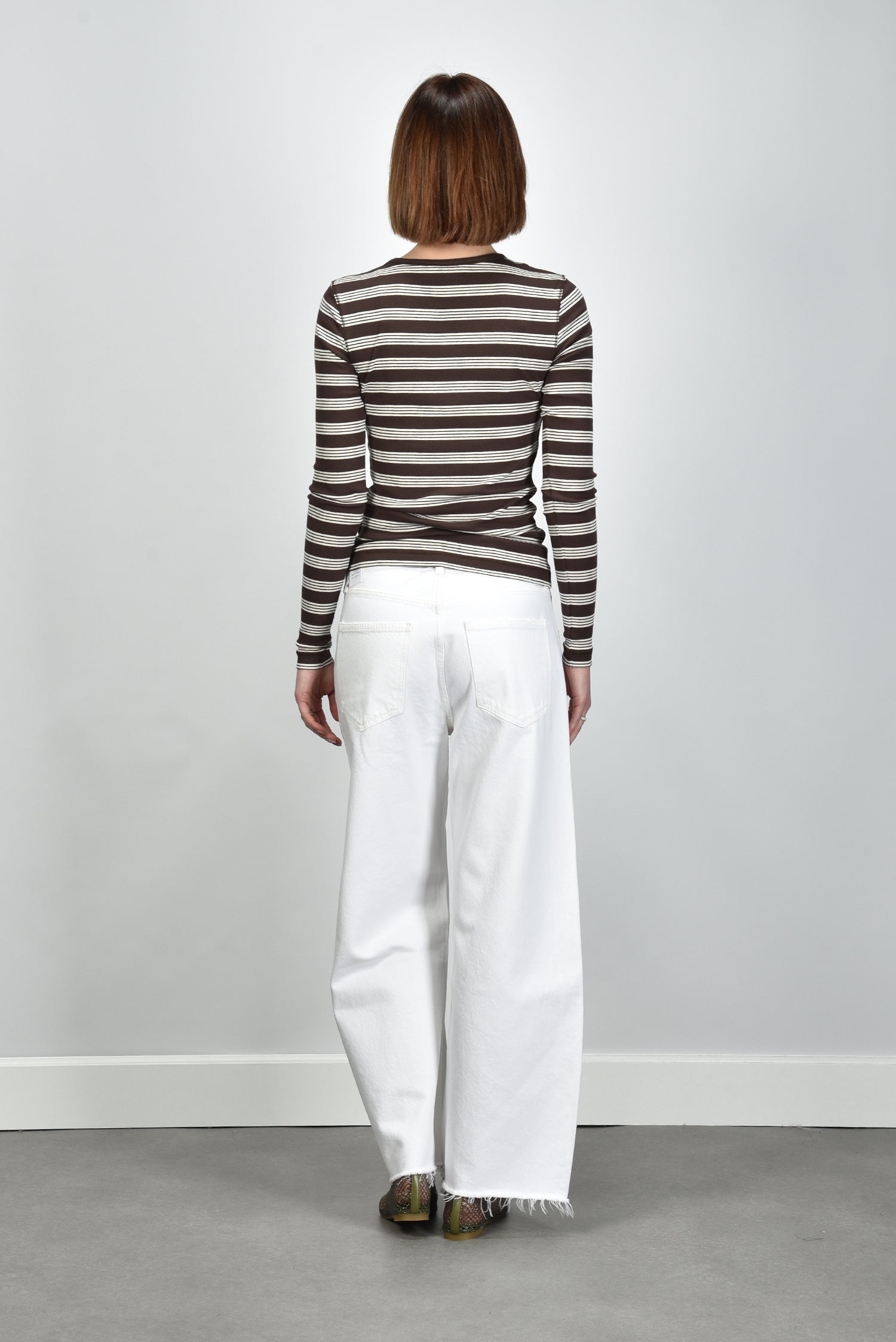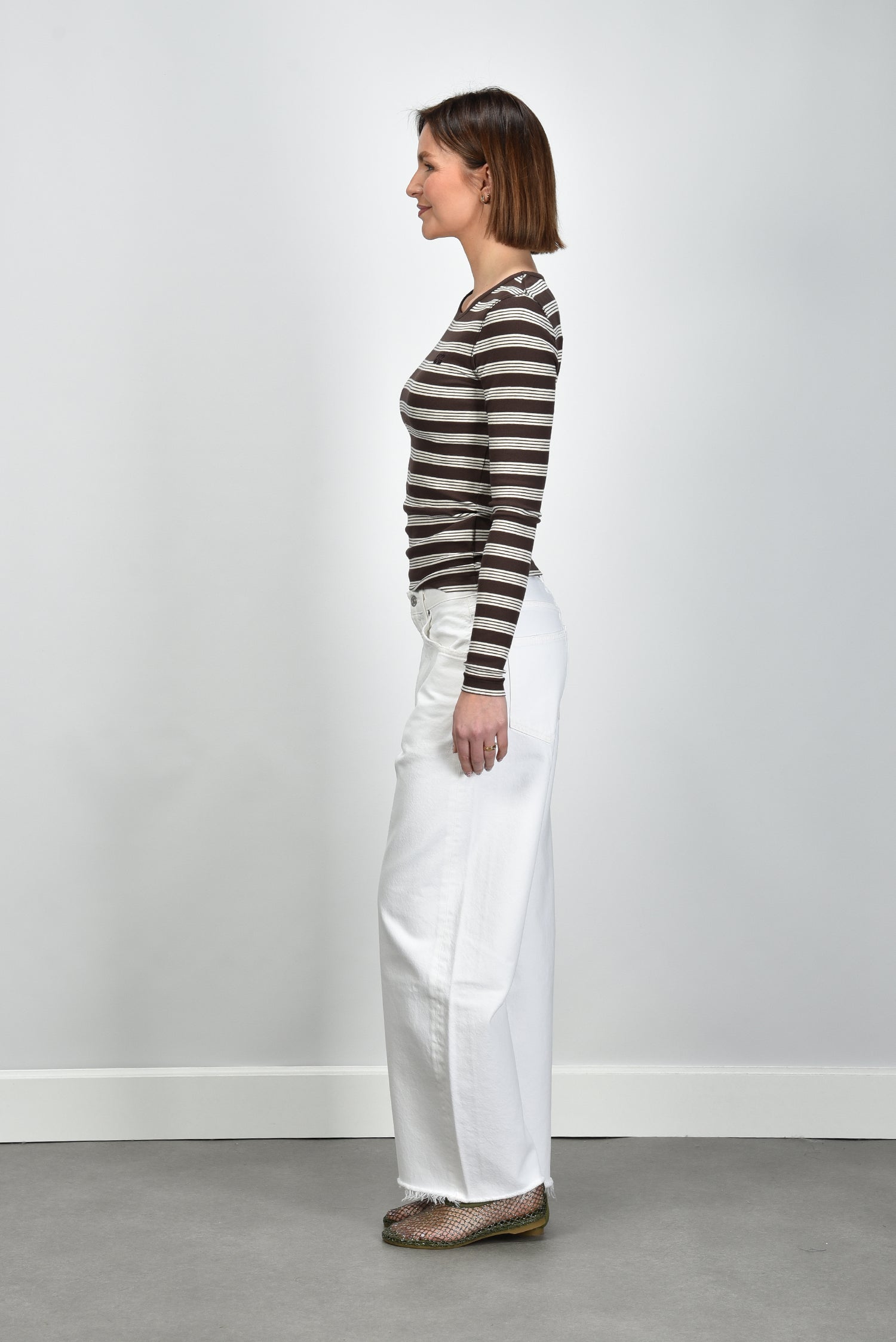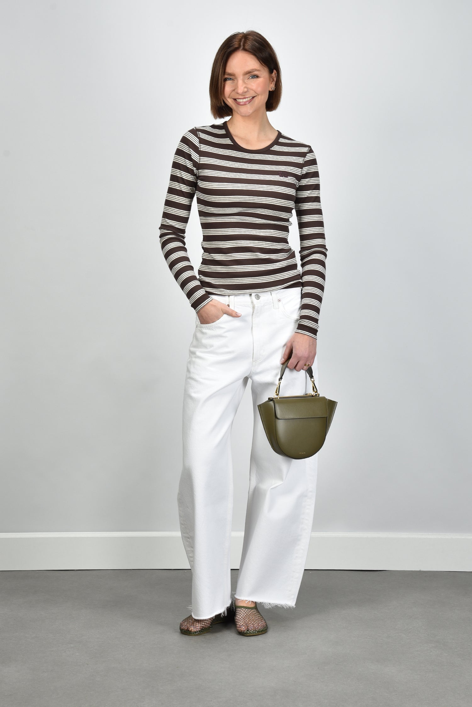 De cropped top met lange mouwen van Ganni heeft een ontspannen uitstraling door het korte model en de horizontale bruine-witte strepen. De ronde hals en het subtiele logo op de borst geven het ontwerp een speels effect. Gemaakt van 95% katoen en 5% elastane voelt de stof soepel aan en blijft deze mooi in vorm. De top valt normaal op maat, dus je kunt gewoon je gebruikelijke maat kiezen. Combineer hem met de Agolde jeans Low Curve Fray A238-1183 milkshake voor een frisse, casual look met een vleugje Scandinavische cool.