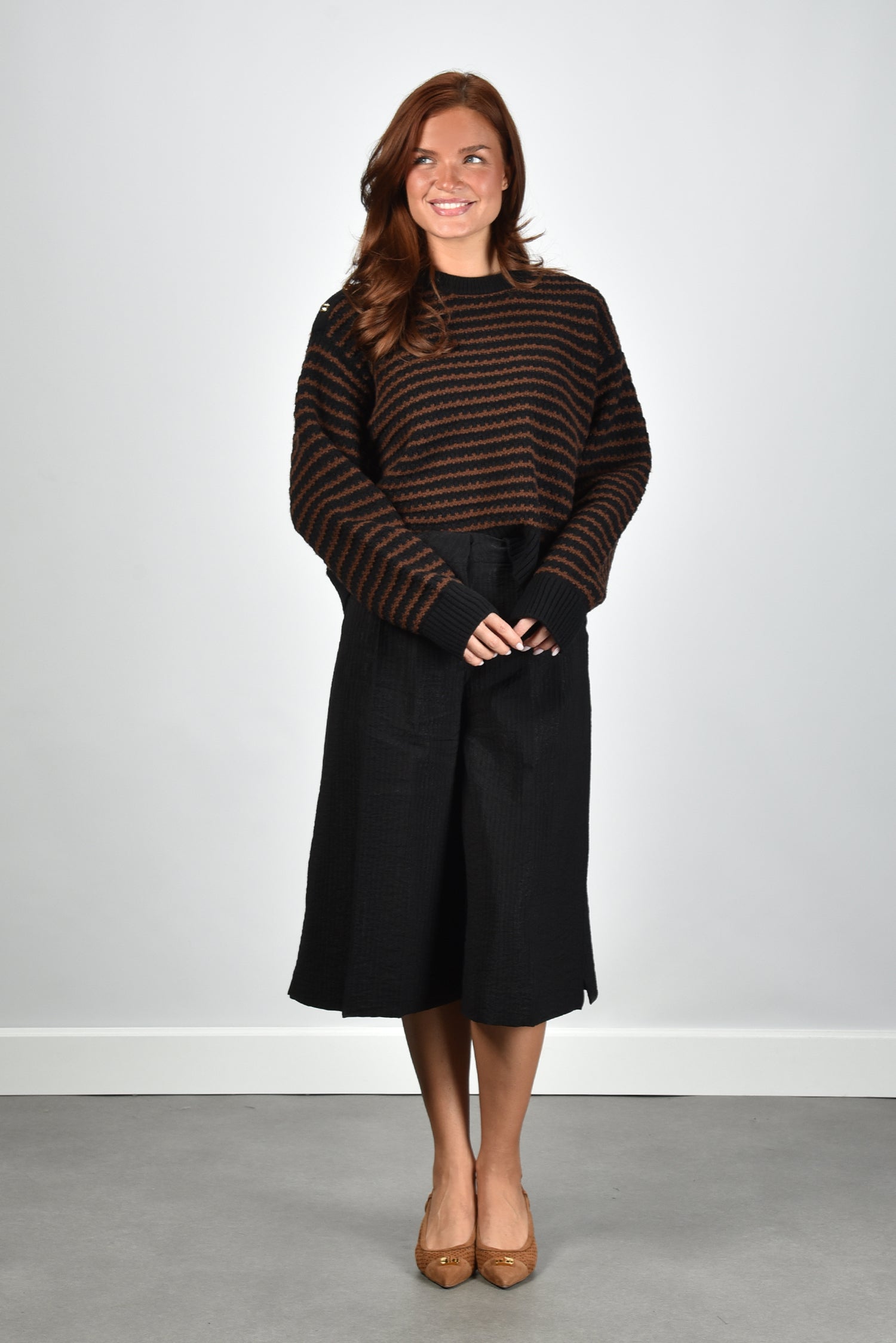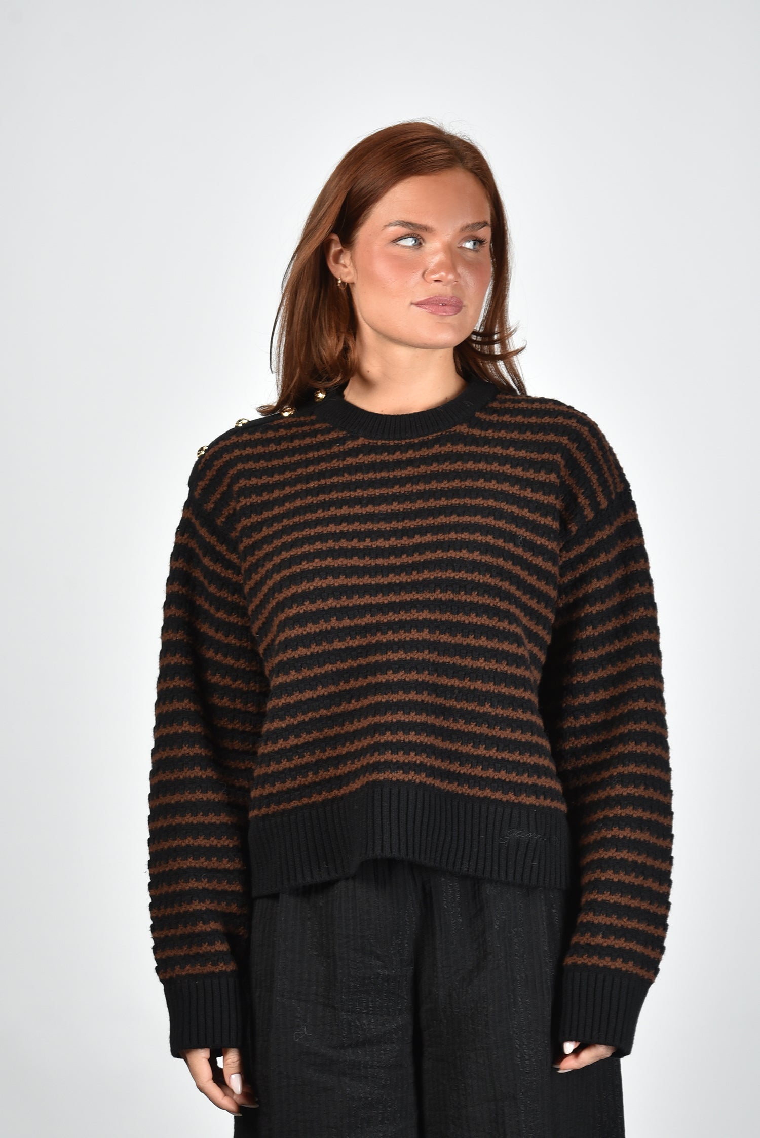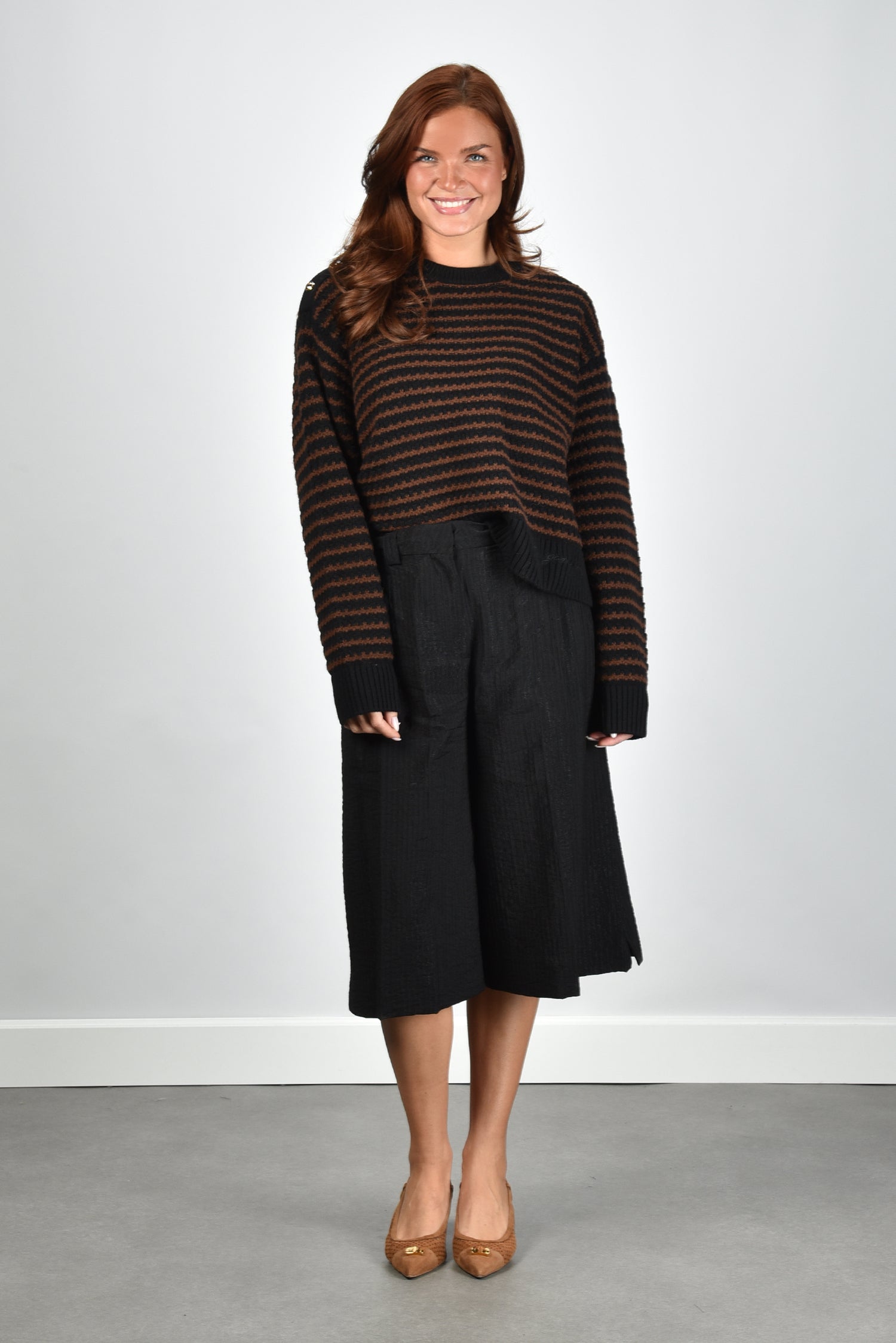 Dit is de gestreepte trui met ronde hals van Ganni, een kort model in warm bruin met zwarte banen. De voorkant valt iets korter, waardoor de vorm luchtig staat zonder te veel nadruk. De goudkleurige knopen op de schouder geven een helder detail dat direct zichtbaar is wanneer je hem aantrekt. De mix van wol en katoen voelt stevig maar soepel, prettig voor elke dag. De ronde hals sluit netjes aan. De trui valt normaal op maat, dus je kunt uitgaan van je eigen maat. Het speelse karakter van Ganni komt mooi terug in de asymmetrische lijn en de duidelijke strepen in de kleur chocolate plum.