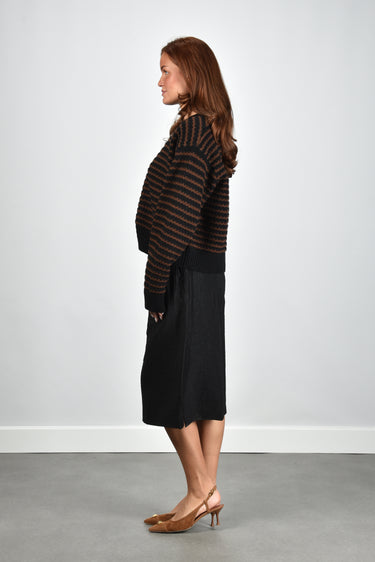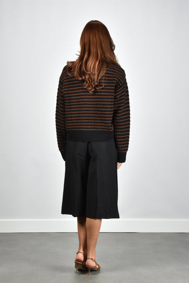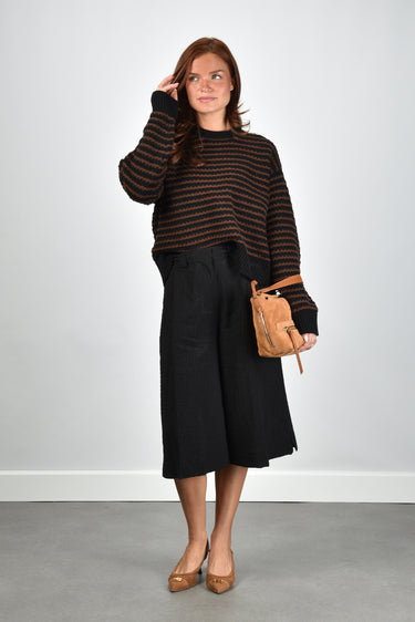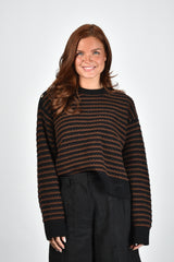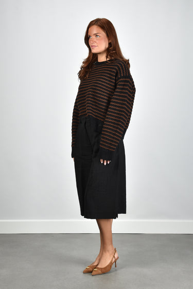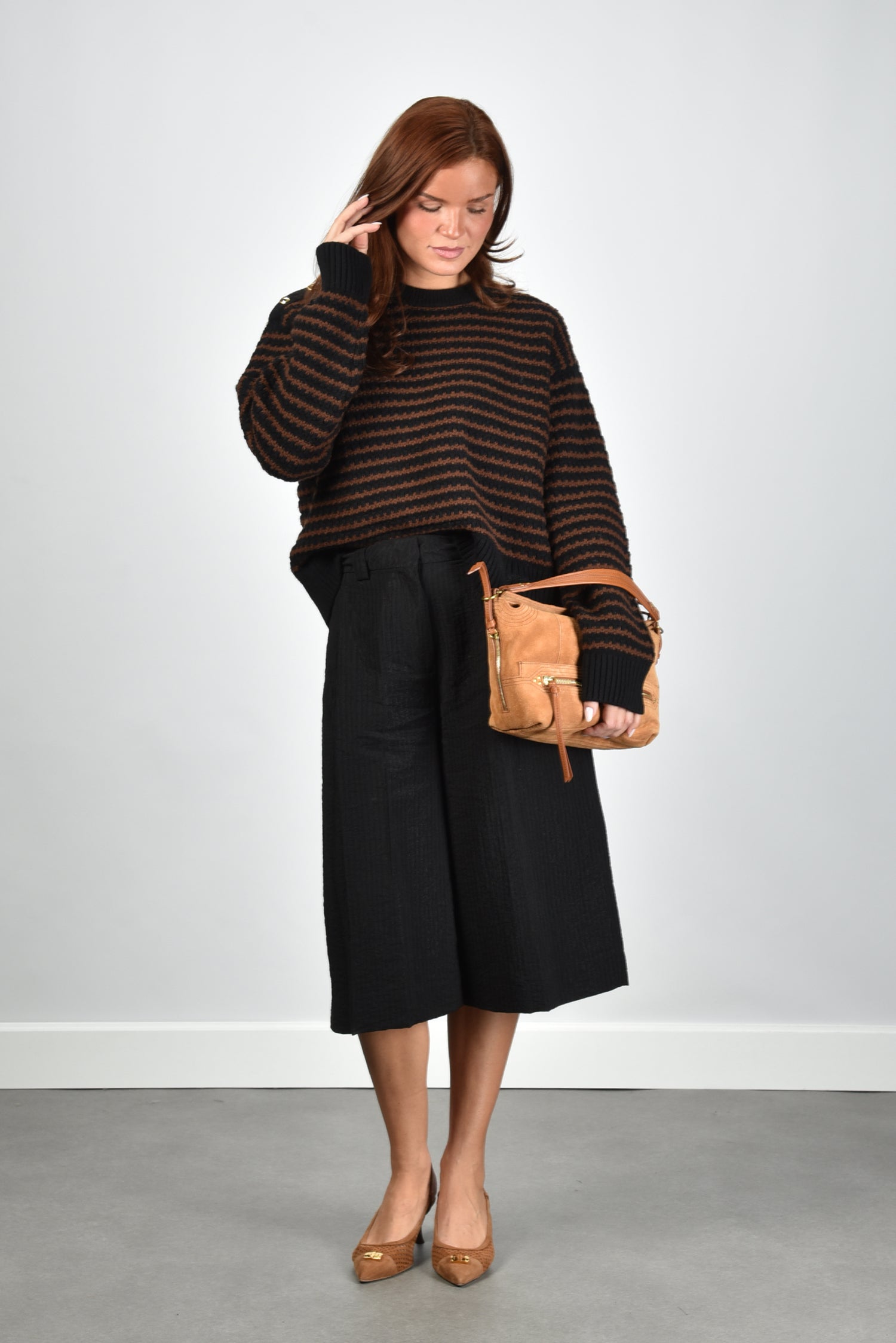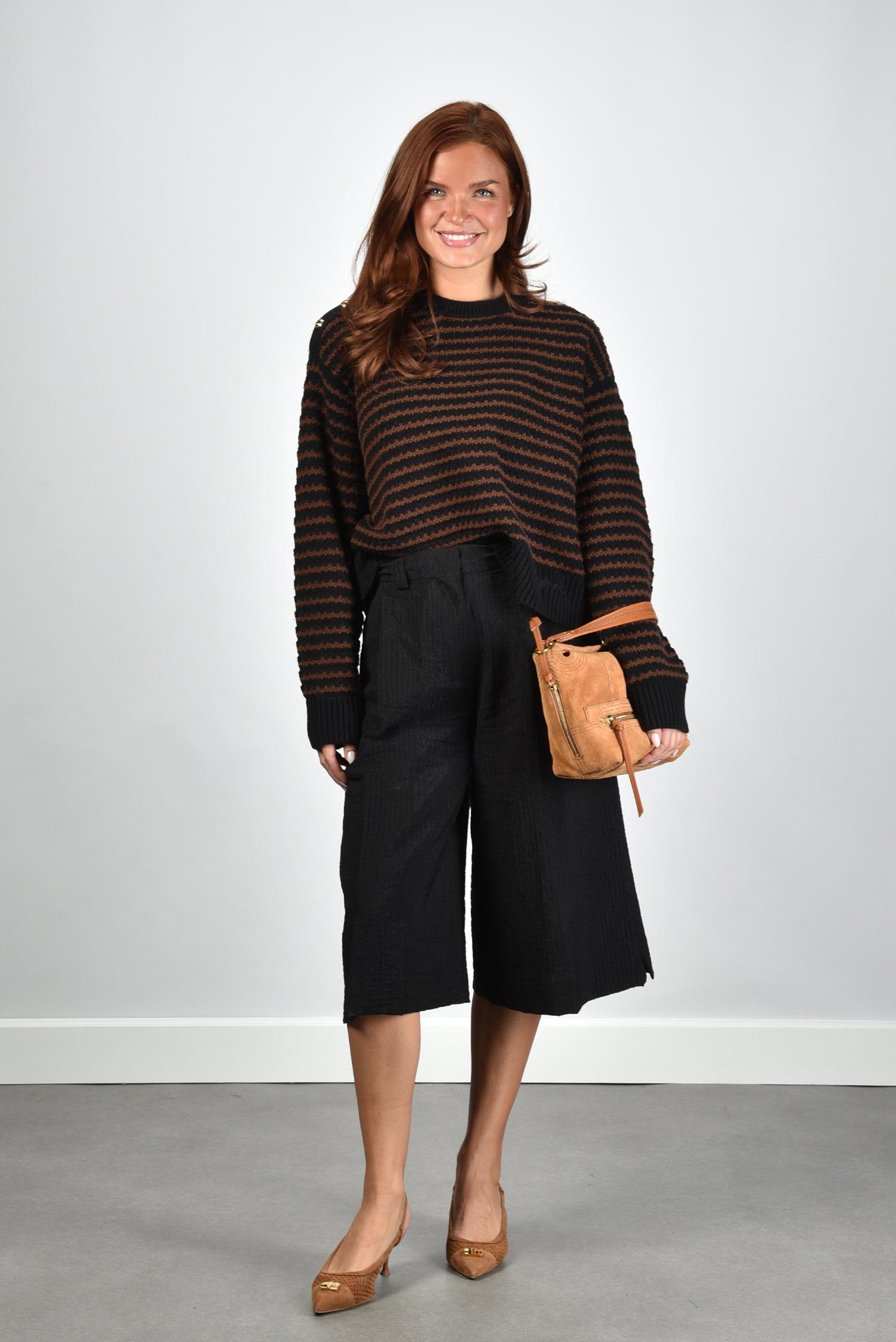 Dit is de gestreepte trui met ronde hals van Ganni, een kort model in warm bruin met zwarte banen. De voorkant valt iets korter, waardoor de vorm luchtig staat zonder te veel nadruk. De goudkleurige knopen op de schouder geven een helder detail dat direct zichtbaar is wanneer je hem aantrekt. De mix van wol en katoen voelt stevig maar soepel, prettig voor elke dag. De ronde hals sluit netjes aan. De trui valt normaal op maat, dus je kunt uitgaan van je eigen maat. Het speelse karakter van Ganni komt mooi terug in de asymmetrische lijn en de duidelijke strepen in de kleur chocolate plum.