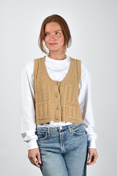 Het wollen vest bruin van Ganni heeft een stevige, maar zachte uitstraling waar je meteen zin in krijgt. Het korte model valt net boven de taille en heeft een duidelijk kabelpatroon dat volume en structuur geeft. De bruine kleur, door Ganni incense genoemd, oogt warm en naturel. Het vest sluit met knopen en heeft twee handige zakken aan de voorkant. Dankzij de mix van 80 procent wol en 20 procent polyamide voelt het stevig aan en blijft het prettig licht. Combineer het leuk met de Golden Goose sneakers Superstar voor een stoere balans tussen knitwear en casual. Dit is typisch Ganni: herkenbaar, speels en met een vleug Scandinavische nonchalance.