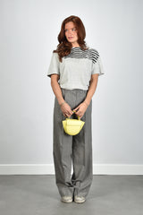 De gestreepte broek met plooien van Golden Goose is een item met karakter. De grijze tint in grey shades en het subtiele streeppatroon geven de broek een rustige diepte. De snit is hoog in de taille en valt wijd langs het been, wat een ontspannen silhouet creëert zonder aan vorm te verliezen. De plooien en steekzakken voegen structuur toe terwijl de wol zorgt voor een soepele, luxe valling. Deze broek sluit met een rits en voelt stevig aan, maar blijft elegant in uitstraling zonder overdaad. Draag hem met het Golden Goose t-shirt in grey melange voor een stijlvolle ton sur ton combinatie. De pasvorm valt normaal, dus je kunt gewoon je eigen maat kiezen.