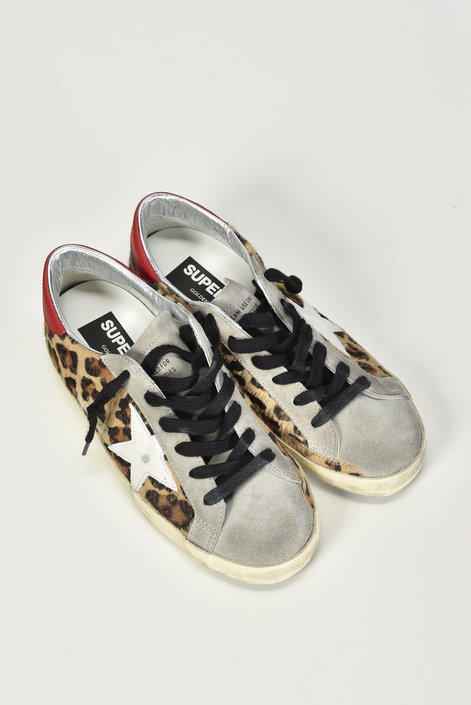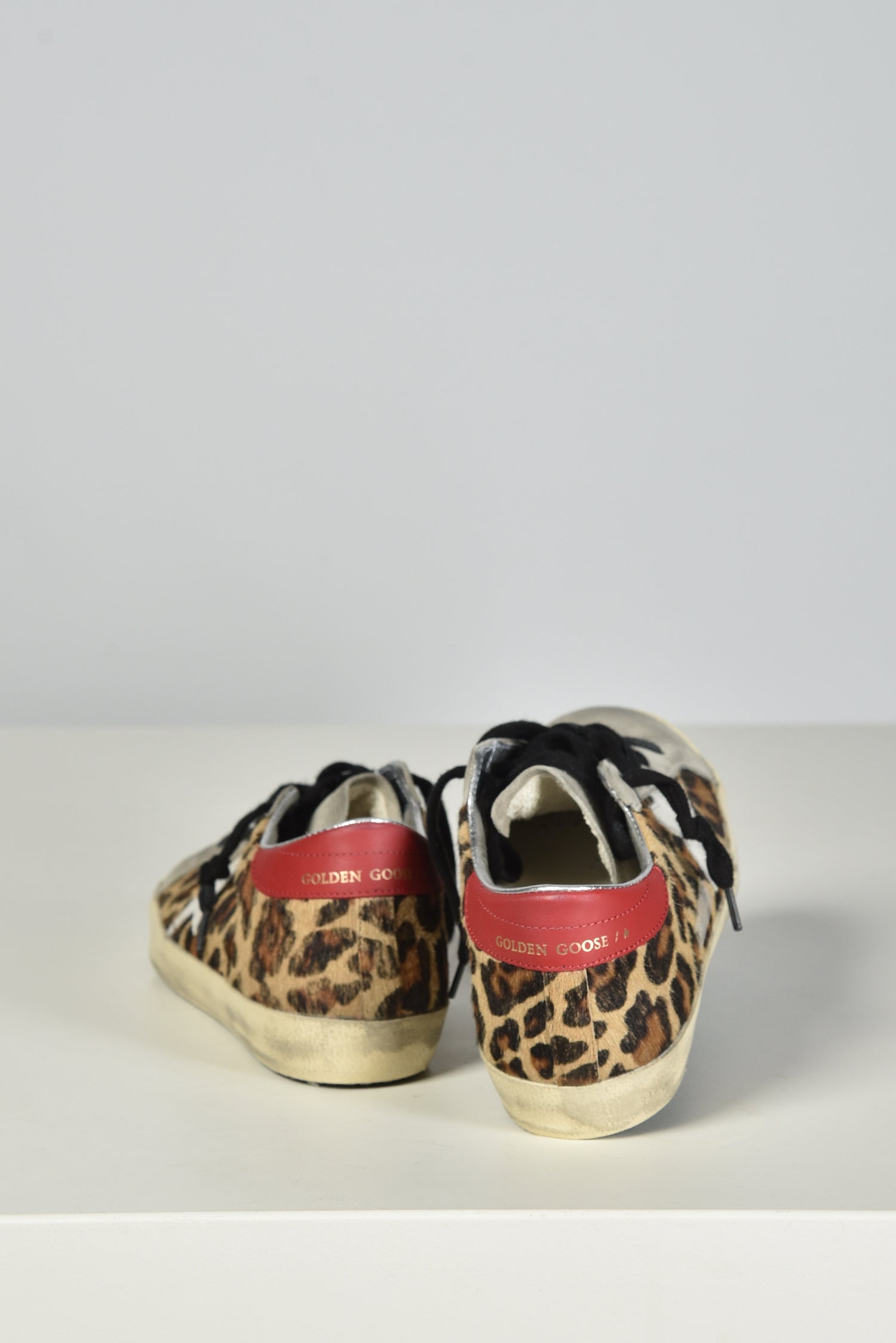 De sneakers Superstar leopard van Golden Goose trekken meteen de aandacht met hun luipaardprint en witte ster aan de zijkant. De rode hielkap met glanzende zilverkleurige binnenkant geeft een onverwacht accent dat het paar extra karakter geeft. Het mixen van pony, leer en suède zorgt voor de herkenbare Golden Goose uitstraling met een ruwer randje. De handgemaakte afwerking maakt elk paar net iets anders, zoals het label bekendstaat. De Superstar leopard sneakers hebben een normale pasvorm en zitten prettig bij dagelijks gebruik. Combineer ze met de Superstar GWF01042.F008167.83260 voor een speels contrast binnen dezelfde stijl van Golden Goose.