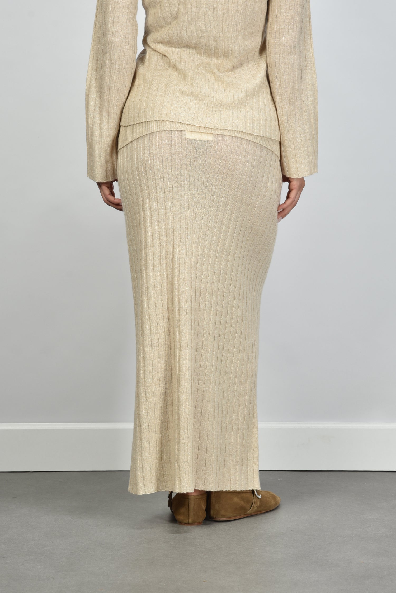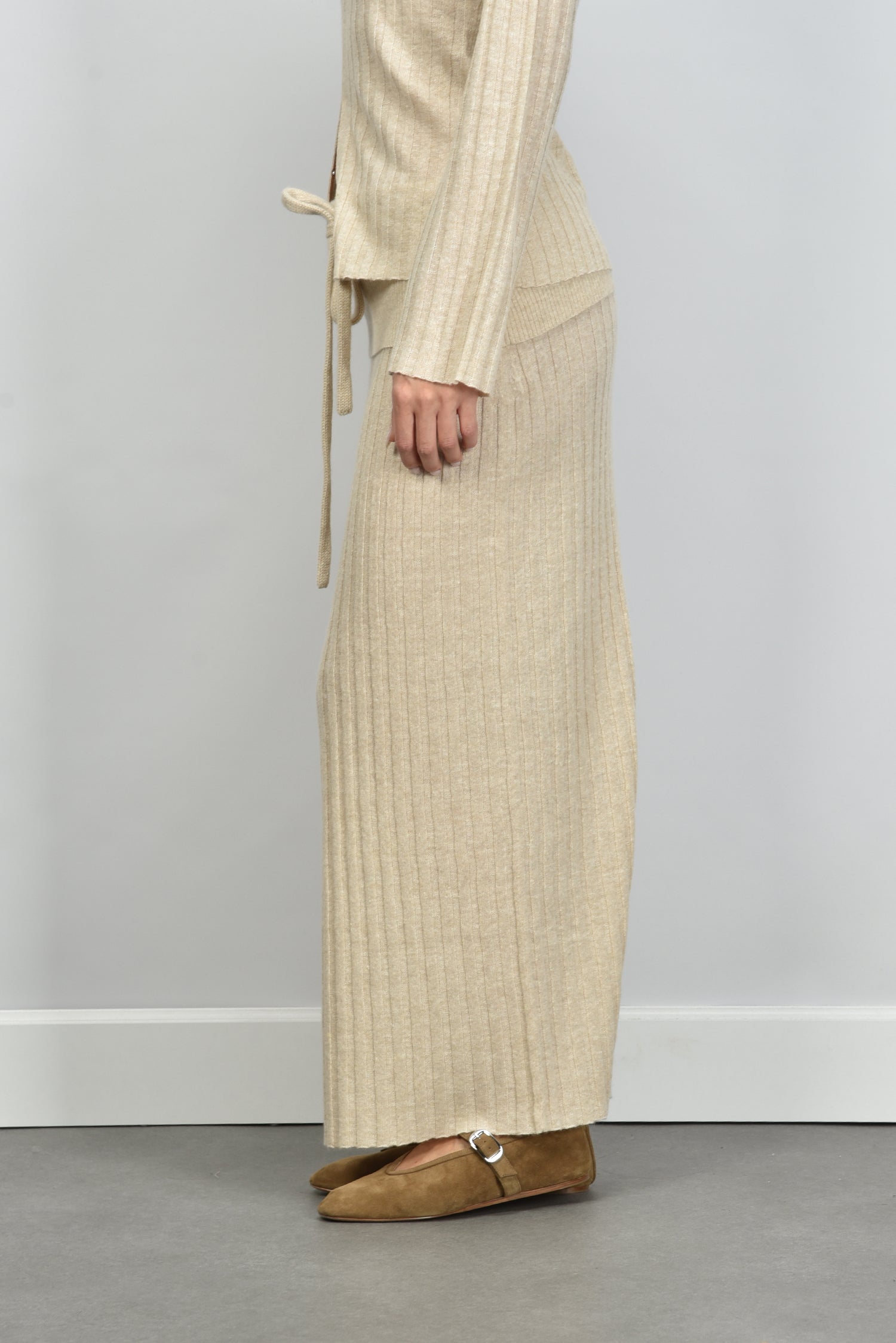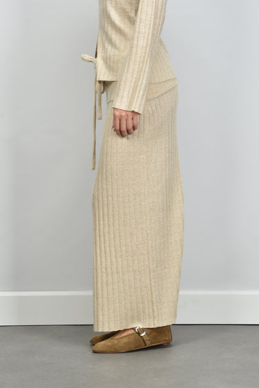 De rok Lia van Guest In Residence is een item dat direct aandacht trekt door zijn rustige luxe. De maxi lengte valt vloeiend tot op de vloer en geeft een mooi lijnenspel dankzij de brede ribbelstructuur. De omslagtaille met strikriem zorgt voor een elegante vorm en laat je variëren met de pasvorm. Gemaakt van 100% cashmere voelt hij zacht en soepel aan, ideaal voor wie waarde hecht aan kwaliteit die je duidelijk merkt. De kleur sandstone sluit mooi aan bij neutrale tinten. Draag hem met het Guest In Residence vest Breezy in dezelfde tint voor een rustige ton‑sur‑ton combinatie.