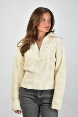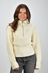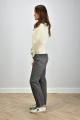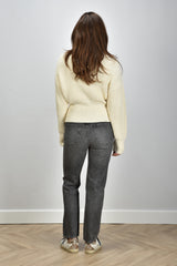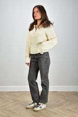 Zie hier de IRO trui Romane in ecru, een verfijnde keuze voor elke garderobe. Deze luxe trui combineert 60% katoen en 40% wol voor optimaal comfort. Het heeft een normale pasvorm; Lise draagt maat M bij haar lengte van 1,73m. Handwas aanbevolen. Artikelnummer: WP12ROMANE-ECR01-Ecru.