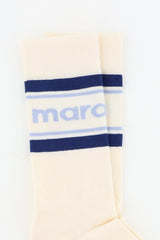 De sokken Dona van Isabel Marant hebben een subtiele sportieve uitstraling die direct opvalt door hun kleurspel. De ecrukleur vormt de zachte basis, met twee donkerblauwe strepen rond de schacht en een lichte blauwe lijn ertussen. Tussen deze lijnen staat het woord 'marc' in lichtblauw, een speels detail dat past bij het merk. Het hogere model staat netjes in sneakers en ook verrassend leuk in een lage loafer. Ze zijn gemaakt van katoen met een vleugje stretch voor een prettige pasvorm die goed blijft zitten. Mooi te dragen met de Weekend Max Mara broek Donare 001 navy vichy voor een ontspannen en verzorgde look.