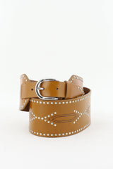 Prachtige riem van het merk Isabel Marant, model Telma, in de kleur cognac. Deze riem combineert moeiteloos moderniteit met tijdloze klasse. De chalk-kleurige leren band straalt een ingetogen luxe uit, terwijl de zilverkleurige gesp én studs een vleugje glans en verfijning toevoegen. De breedte van de riem is 7 cm.