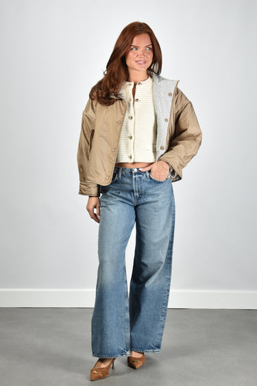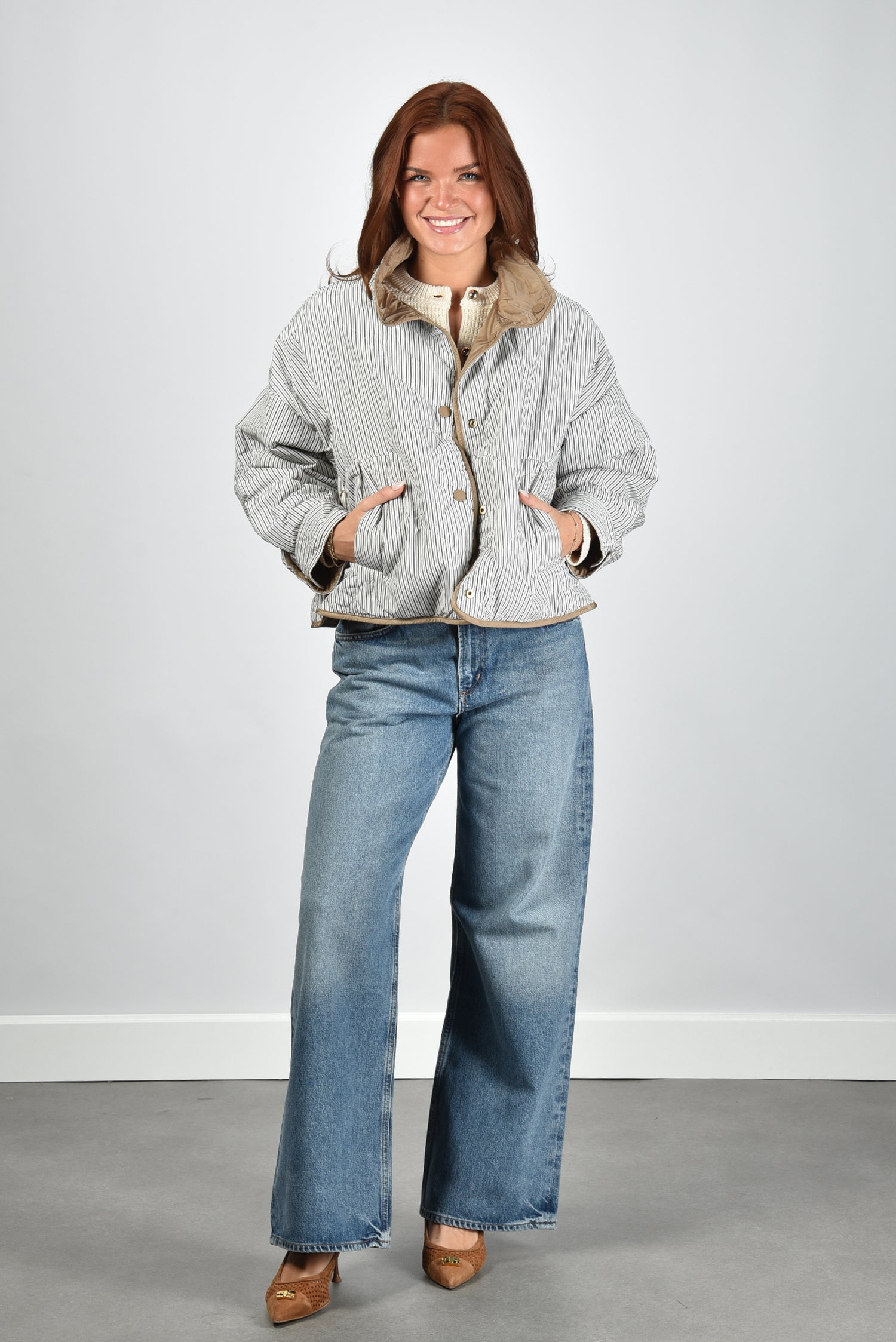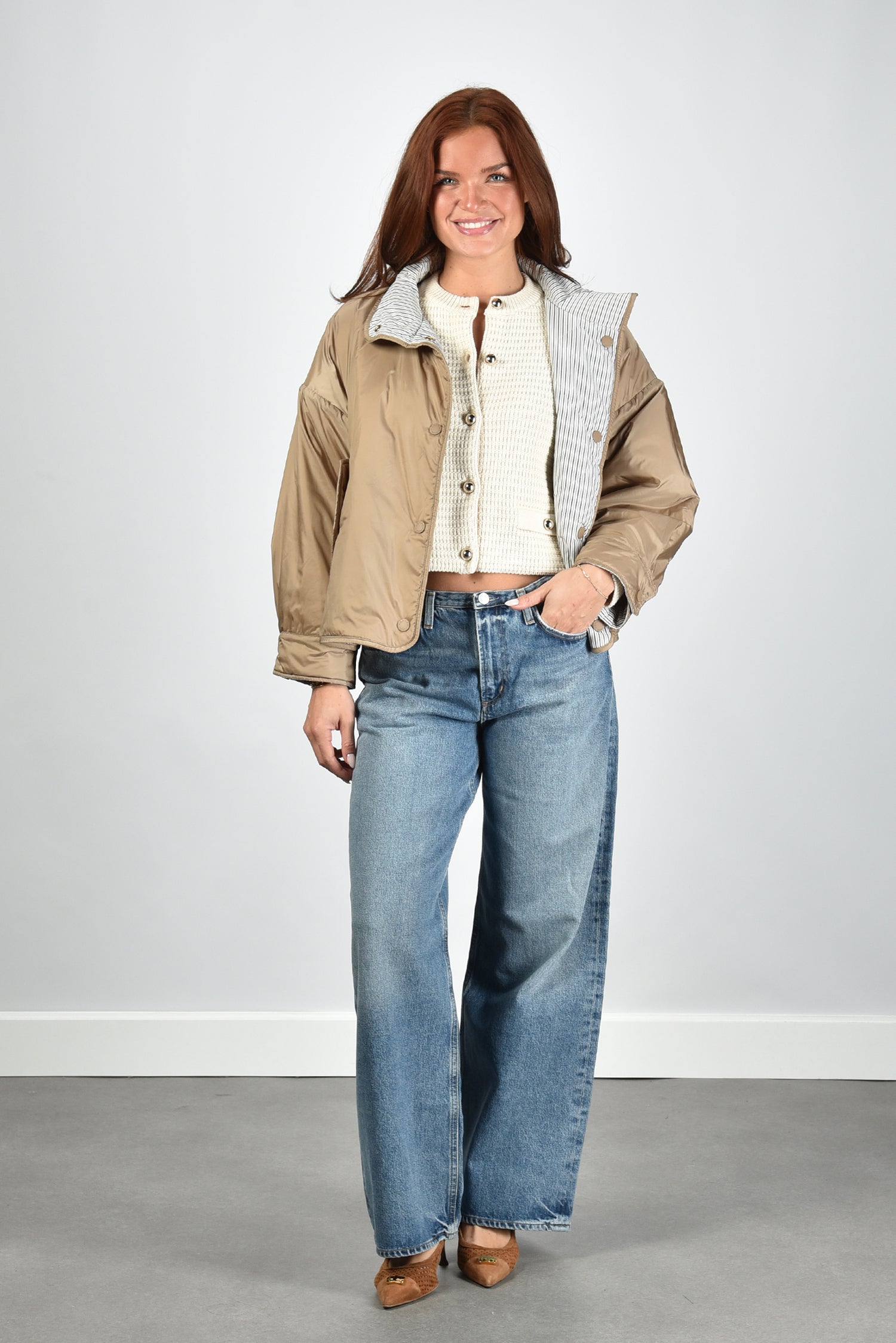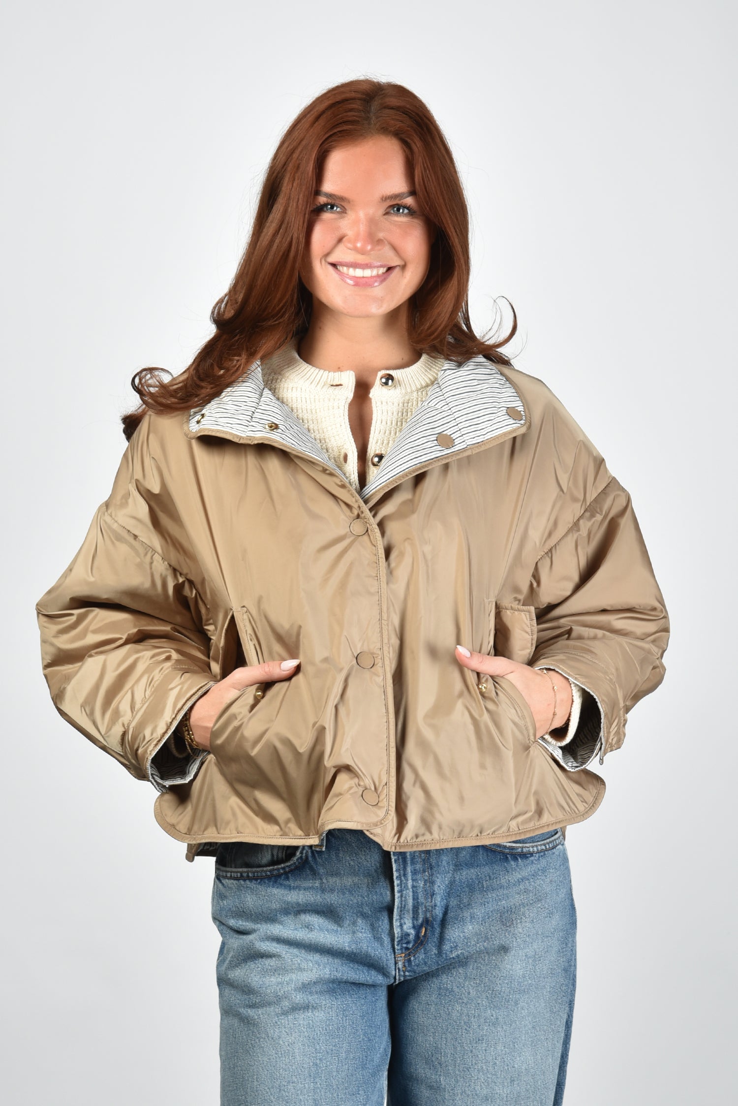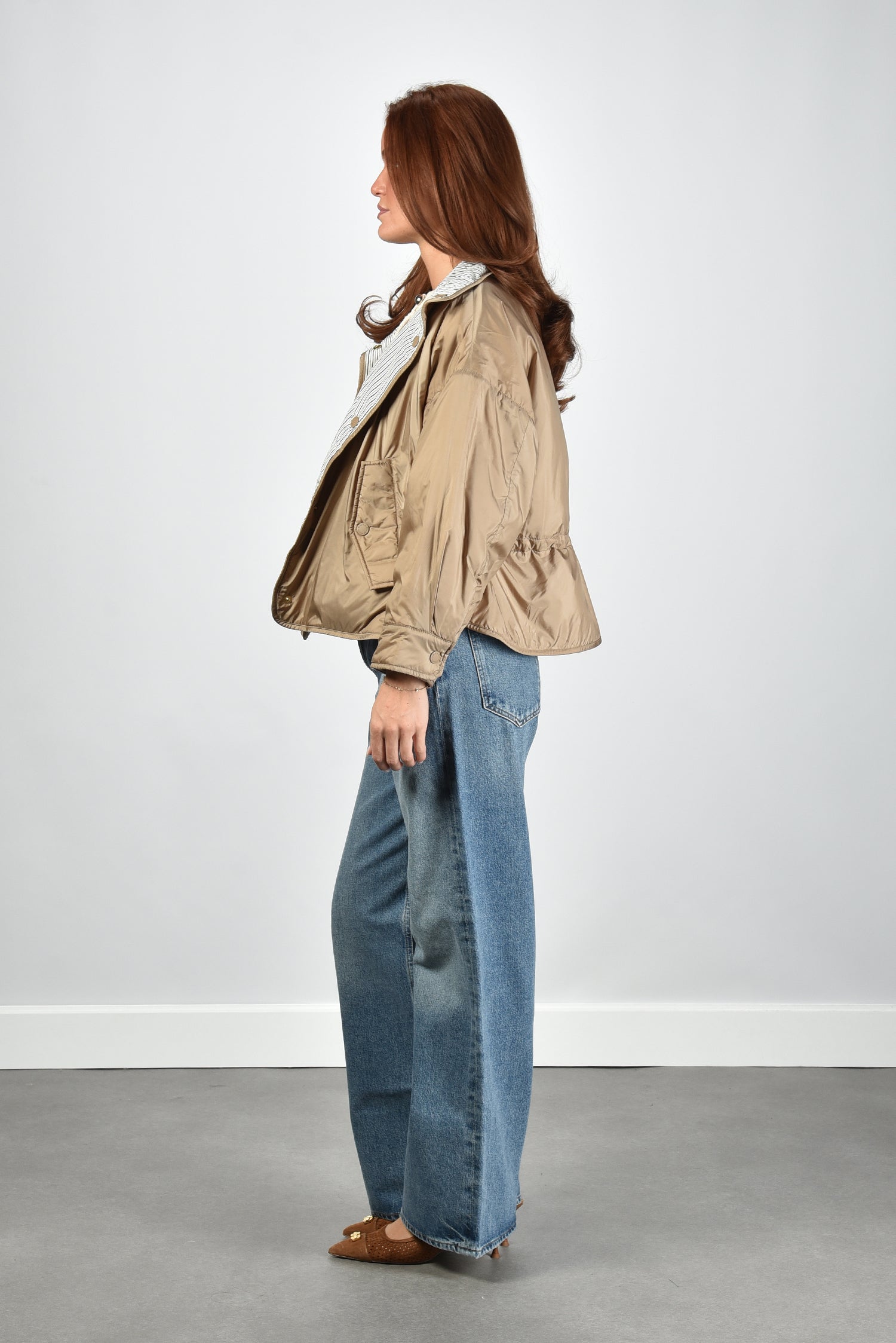 De jas Smalto van Weekend Max Mara is een reversible ontwerp met een glanzende hazelnutkleurige buitenkant en een verrassend gestreepte binnenzijde. De hoge kraag en knoopsluiting geven hem een ingetogen, moderne uitstraling. Dankzij de soepele polyesterstof voelt de jas licht aan en valt hij royaal rond het lichaam. De lage schoudernaden en de iets oversized pasvorm zorgen voor een nonchalante, maar verzorgde look. Draag hem met het Weekend Max Mara vest Vodka in ecru voor een gelaagde combinatie die warmte en stijl samenbrengt.