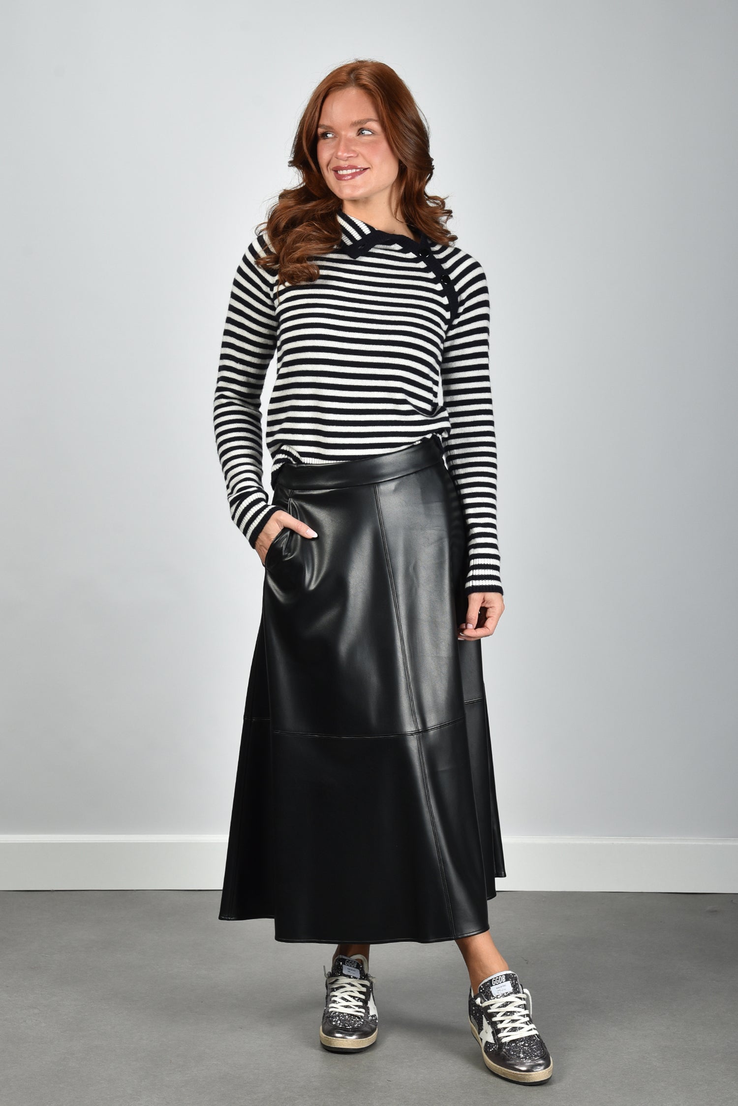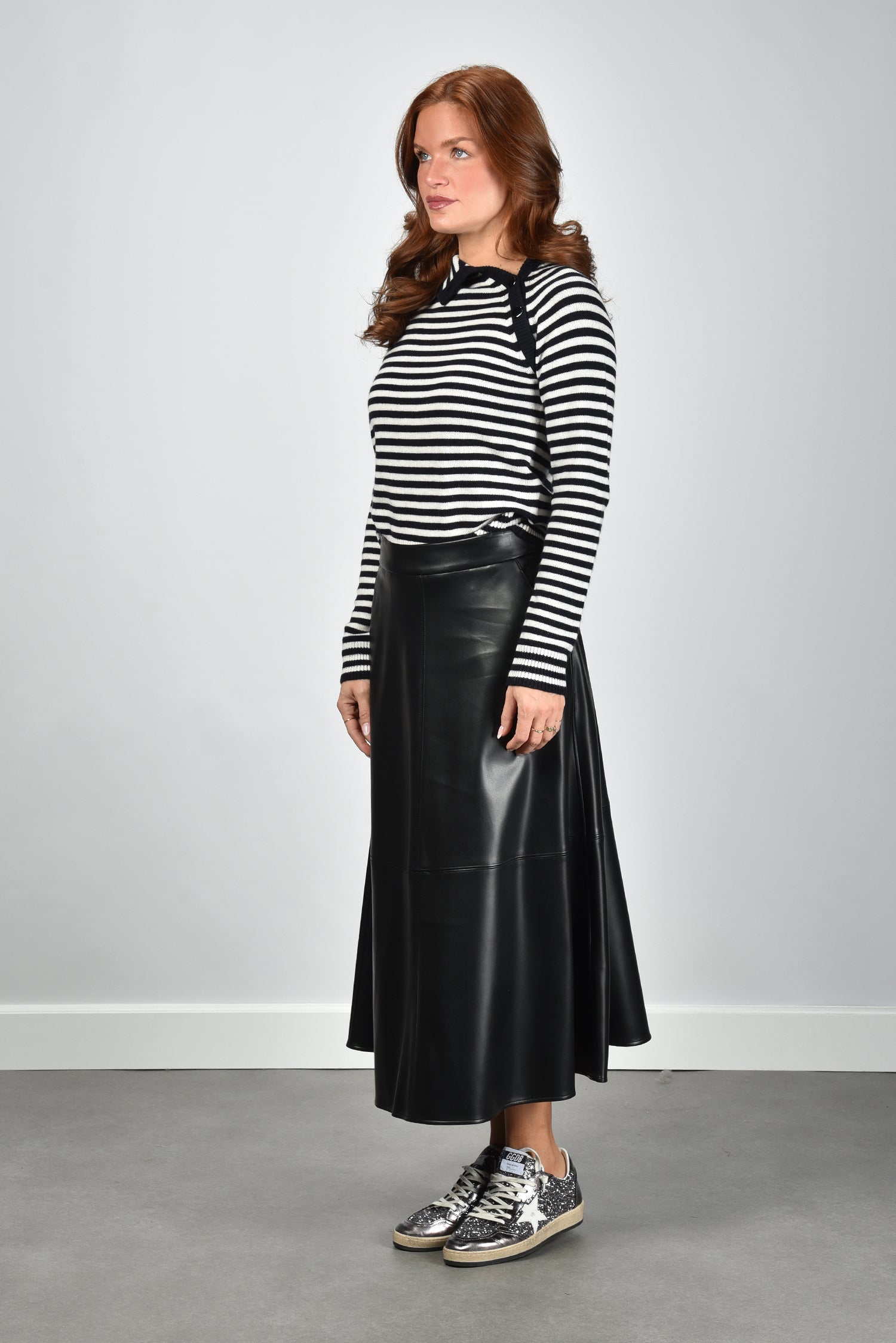 Hier zie je de rok Ninfa, een lange zwarte rok van S Max Mara met een gladde, licht glanzende afwerking. De stof valt recht naar beneden en raakt net boven de grond, waardoor het silhouet lang blijft. De zichtbare horizontale en verticale stiksels verdelen het oppervlak in duidelijke vlakken, wat de rok een strakke structuur geeft. Het lichte materiaal van 100% polyester voelt soepel en houdt de vorm goed. De ritssluiting sluit netjes aan zonder extra volume. De pasvorm is normaal; je kunt uitgaan van je eigen maat. S Max Mara staat bekend om aandacht voor lijnen en materialen, en dat zie je hier terug.