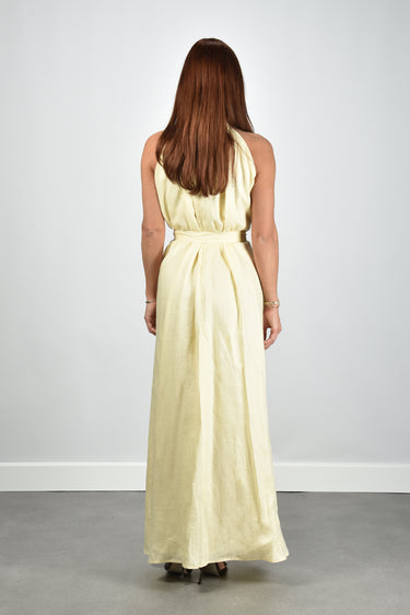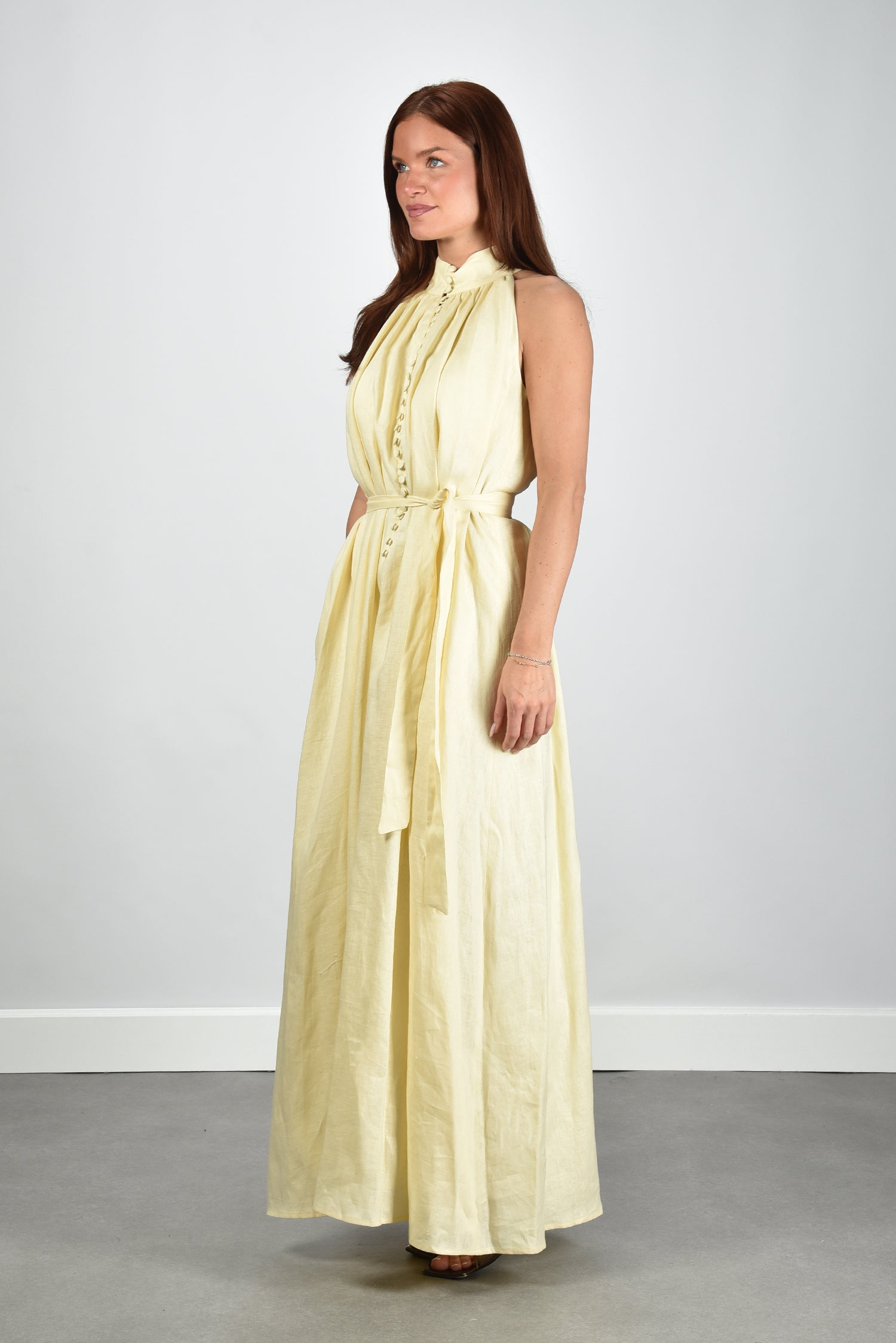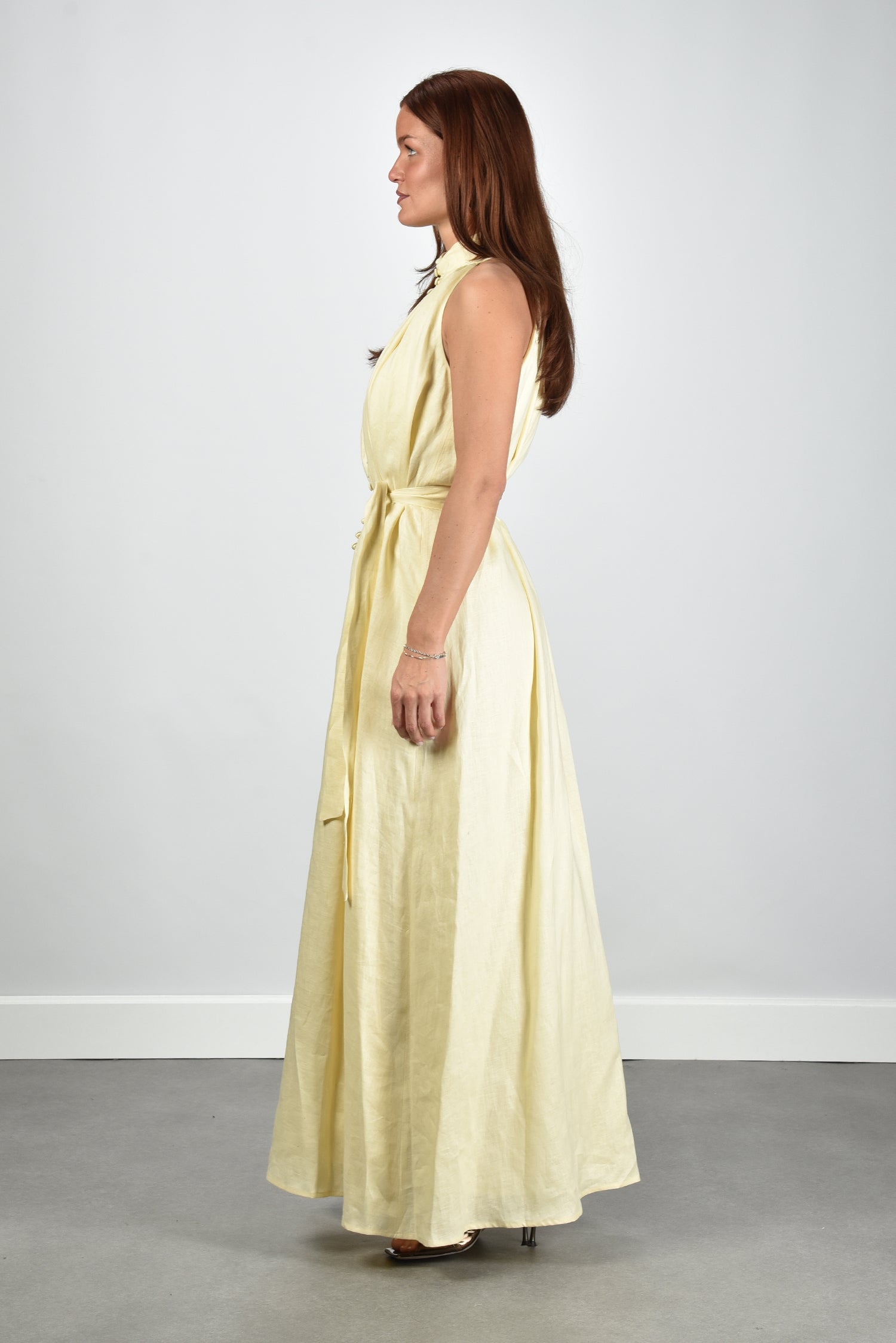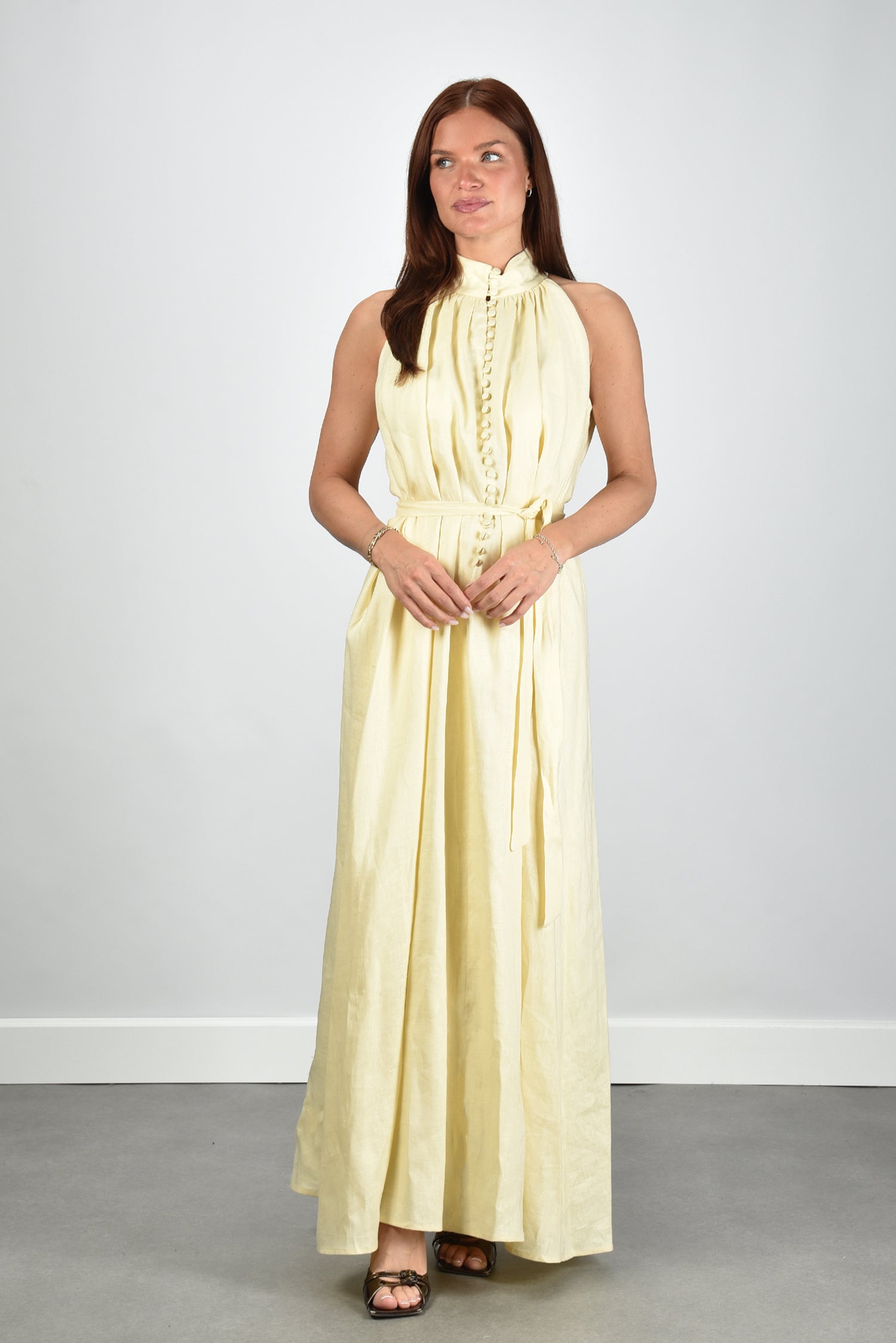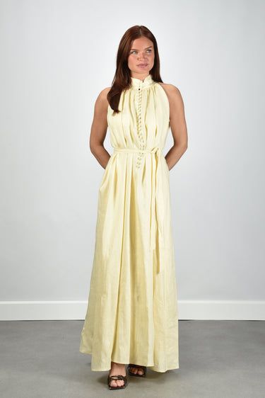 Dit is de jurk Lauren in zacht geel van Sage & Ivy. De hoge hals met de rij knopen geeft het model een rustige lijn. Het linnen voelt luchtig en draagt licht. De lange rok loopt wijd uit en valt soepel om het lichaam. De strikceintuur vormt de taille op een natuurlijke manier. De kleur linen yellow oogt helder en fris, zonder te fel te worden. Sage & Ivy werkt met Europese ateliers en natuurlijke vezels, wat zichtbaar is in de zorgvuldige afwerking. De pasvorm is normaal en je kunt uitgaan van je eigen maat.