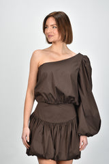 De blouse Noor van Sage & Ivy is een kort, asymmetrisch ontwerp met een opvallende one-shoulder lijn en een volumineuze pofmouw. De elastische band rondom de taille zorgt voor een mooi silhouet en zit comfortabel zonder te knellen. De stofmix met katoen draagt luchtig en voelt prettig aan op de huid. De diepe chocoladebruine tint geeft de blouse een rijke uitstraling die goed past bij de bijpassende Sage & Ivy rok Elvie Short chocolate. Elk ontwerp van Sage & Ivy wordt in Nederland bedacht en geproduceerd in Europese ateliers, met aandacht voor vakmanschap en een bewuste materiaalkeuze. Deze blouse valt normaal op maat, dus je kunt je eigen maat aanhouden.
