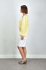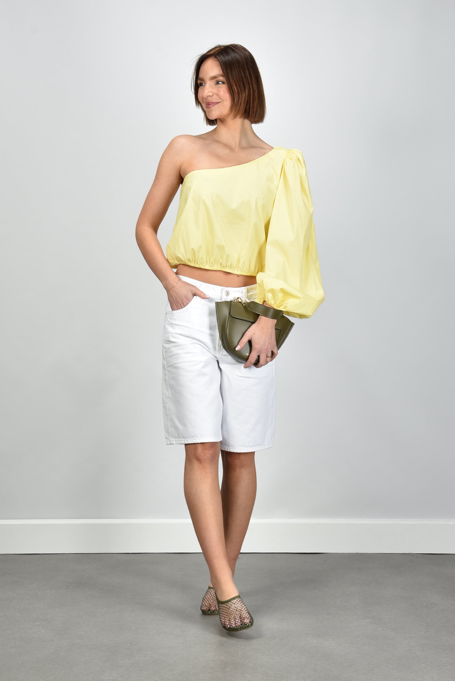 De blouse Noor in zachtgeel van Sage & Ivy trekt meteen de aandacht met haar asymmetrische one shoulder ontwerp. De pofmouw aan één zijde zorgt voor een speelse vorm en een mooi evenwicht in het silhouet. De elastische zoom geeft de blouse een subtiel getailleerde pasvorm waardoor ze soepel aansluit. Gemaakt van katoen met stretch voelt de stof stevig maar luchtig aan. De butter yellow tint ondersteunt het ontwerp en laat het goed combineren met een neutrale of aardse tint. Draag de blouse Noor met de Wandler crossbody Hortensia Mini voor een uitgesproken maar verzorgde look. Sage & Ivy ontwerpt en produceert in Europa met oog voor vakmanschap en natuurlijke materialen, waardoor elk stuk een eigen karakter krijgt.