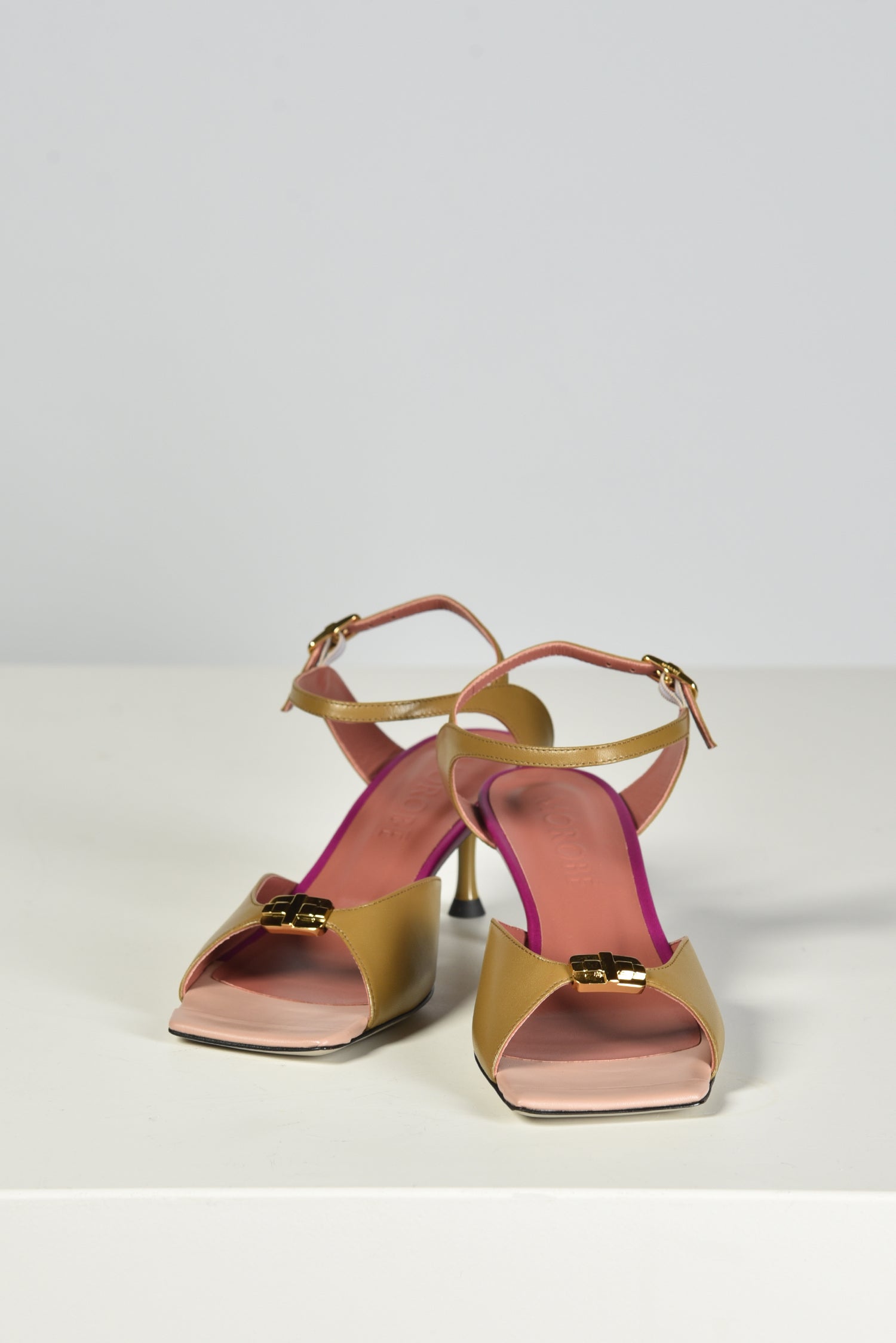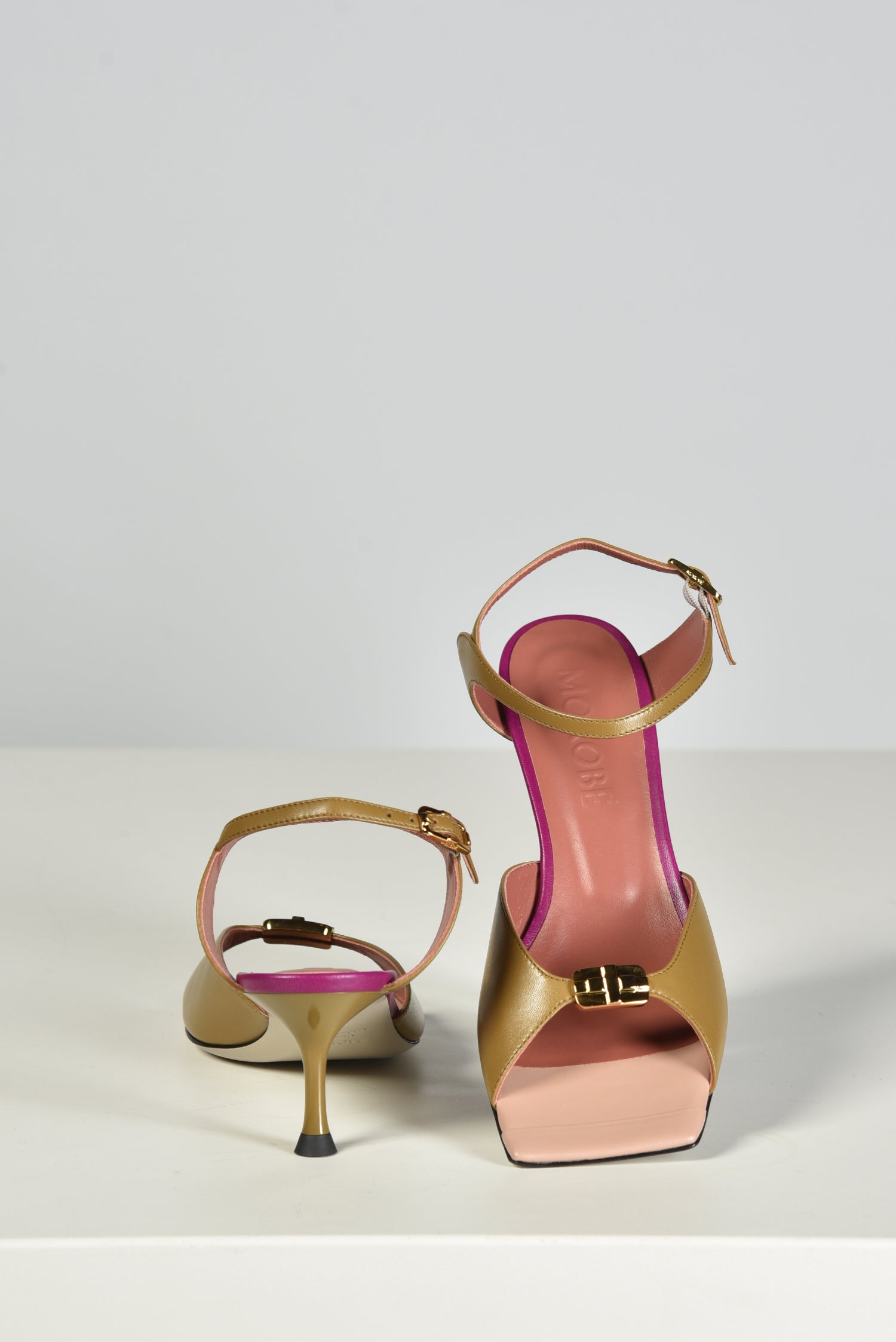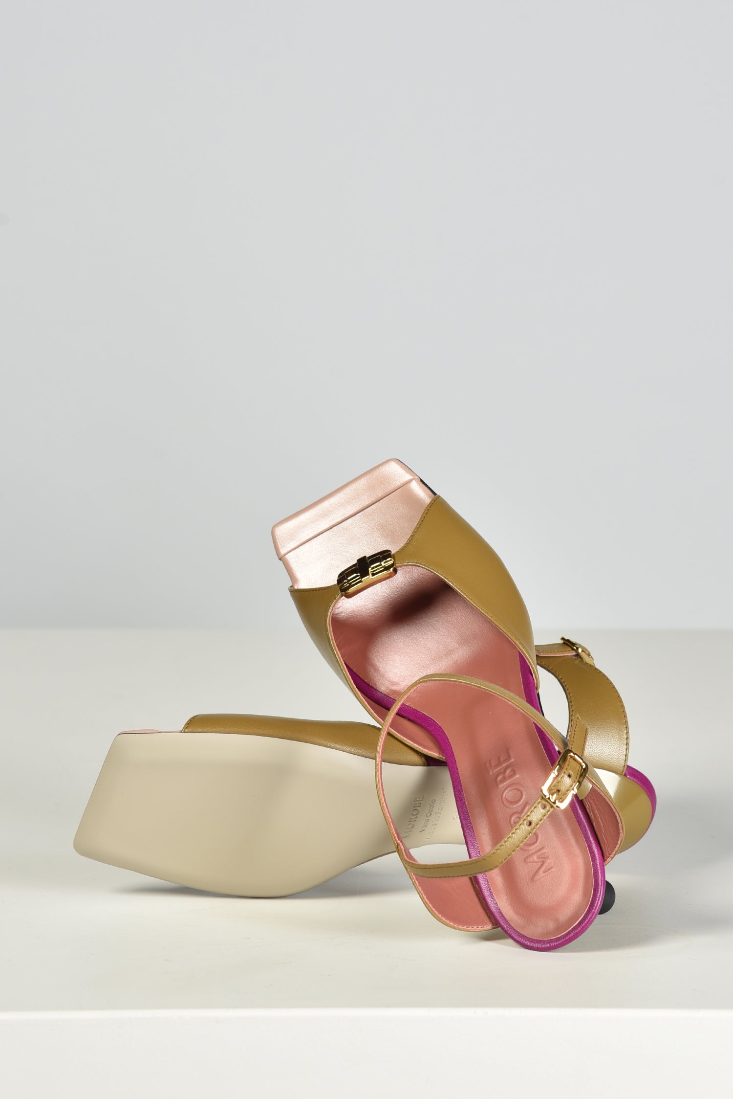 De sandalen Grace groen van Morobe vallen direct op door hun kleurspel van goudbruin, fuchsia en zachtroze. De vierkante neus en de smalle leren bandjes geven het ontwerp een moderne, luchtige vorm. Het gladde leer voelt soepel aan en laat de rijke kleur sweet olive tri mooi uitkomen. De slanke hak heeft een subtiel uitlopende basis, wat zorgt voor een stabiele pasvorm zonder dat het ontwerp zijn elegante lijn verliest. Elk detail draagt de handtekening van Morobe: zorgvuldig gemaakt met oog voor vorm en materiaal. Combineer ze met de Morobe sandalen Grace Logo 101 chocolat voor een stijlvolle contrastset.