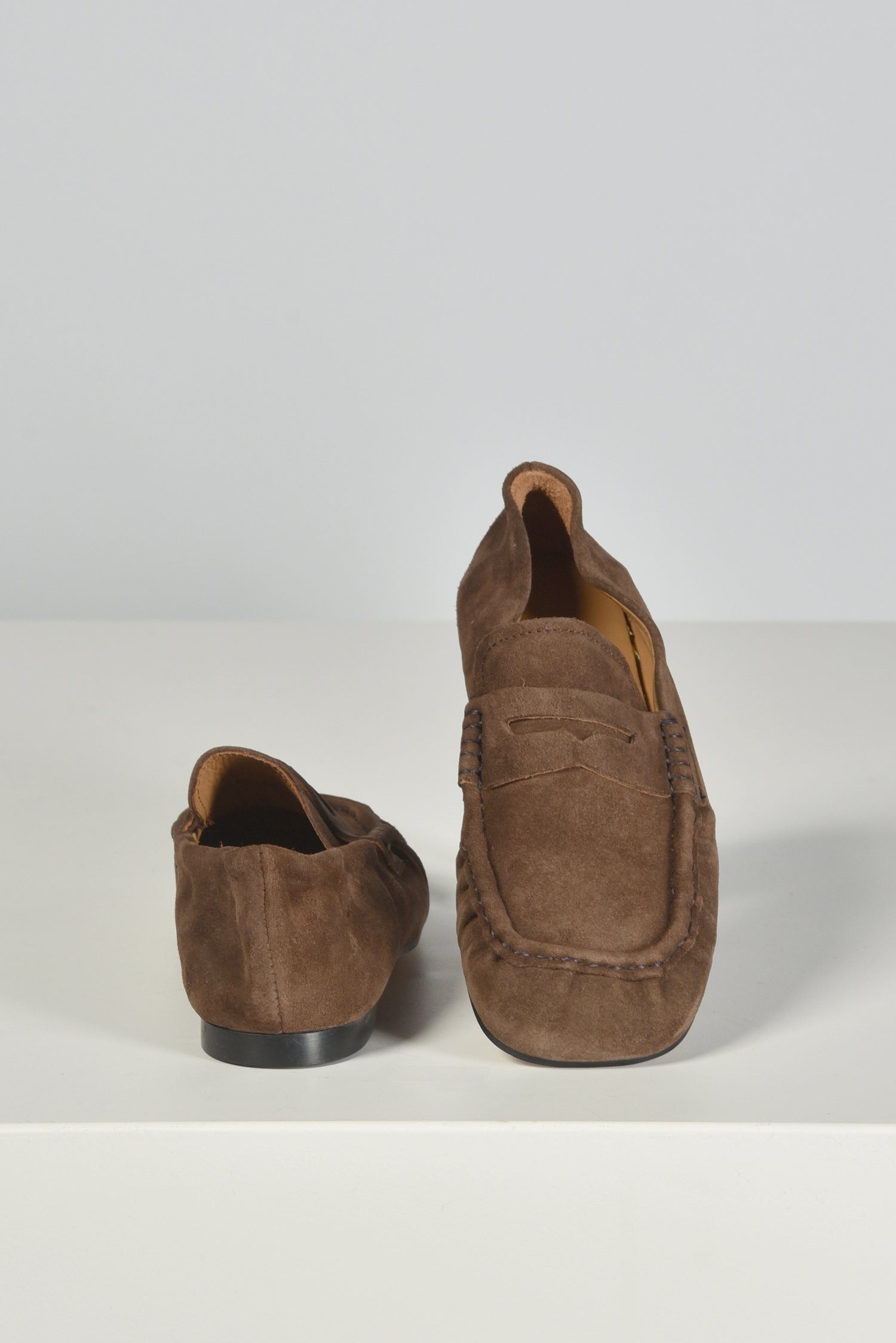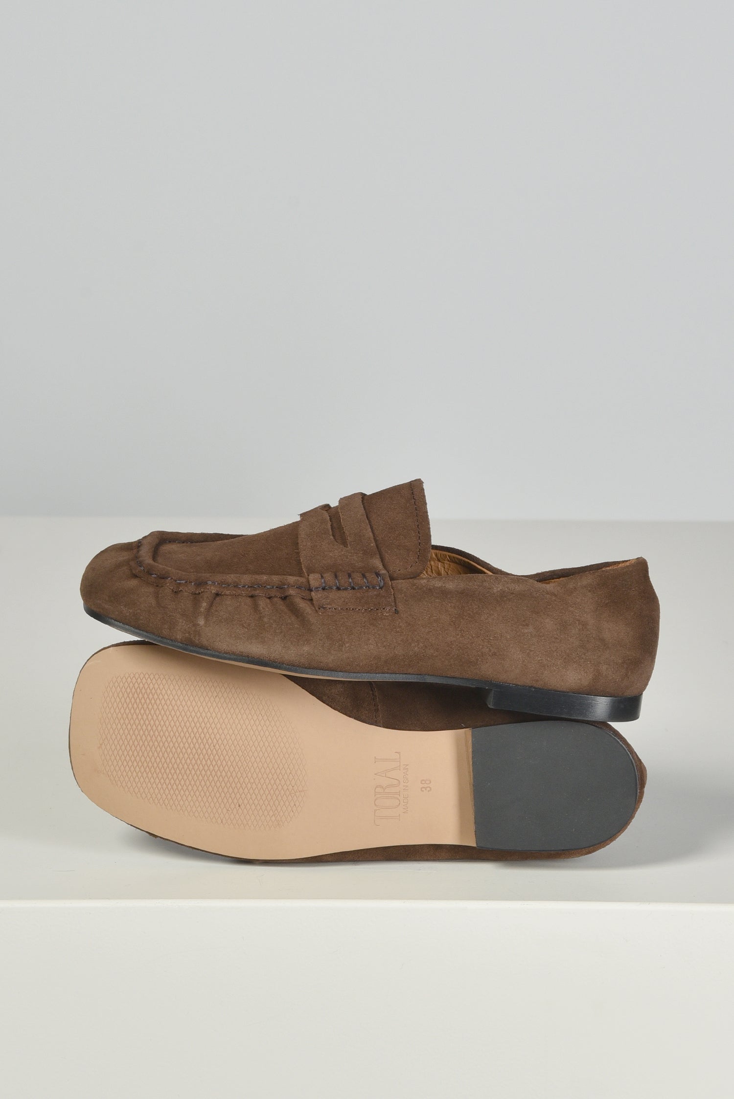 Dit zijn de suede loafers TL-PENY in bruin van Toral. De mocassinvorm valt meteen op, met de matte textuur en de stevige mocassinstiksels langs de randen. De flap op de wreef geeft het model een duidelijke lijnenstructuur, terwijl de zwarte platte zool het geheel licht houdt. Het suede voelt zacht aan en vormt soepel rond de voet. Ze vallen normaal op maat. Toral staat bekend om schoenen met heldere vormen en mooie materialen, en dat zie je hier direct terug.
