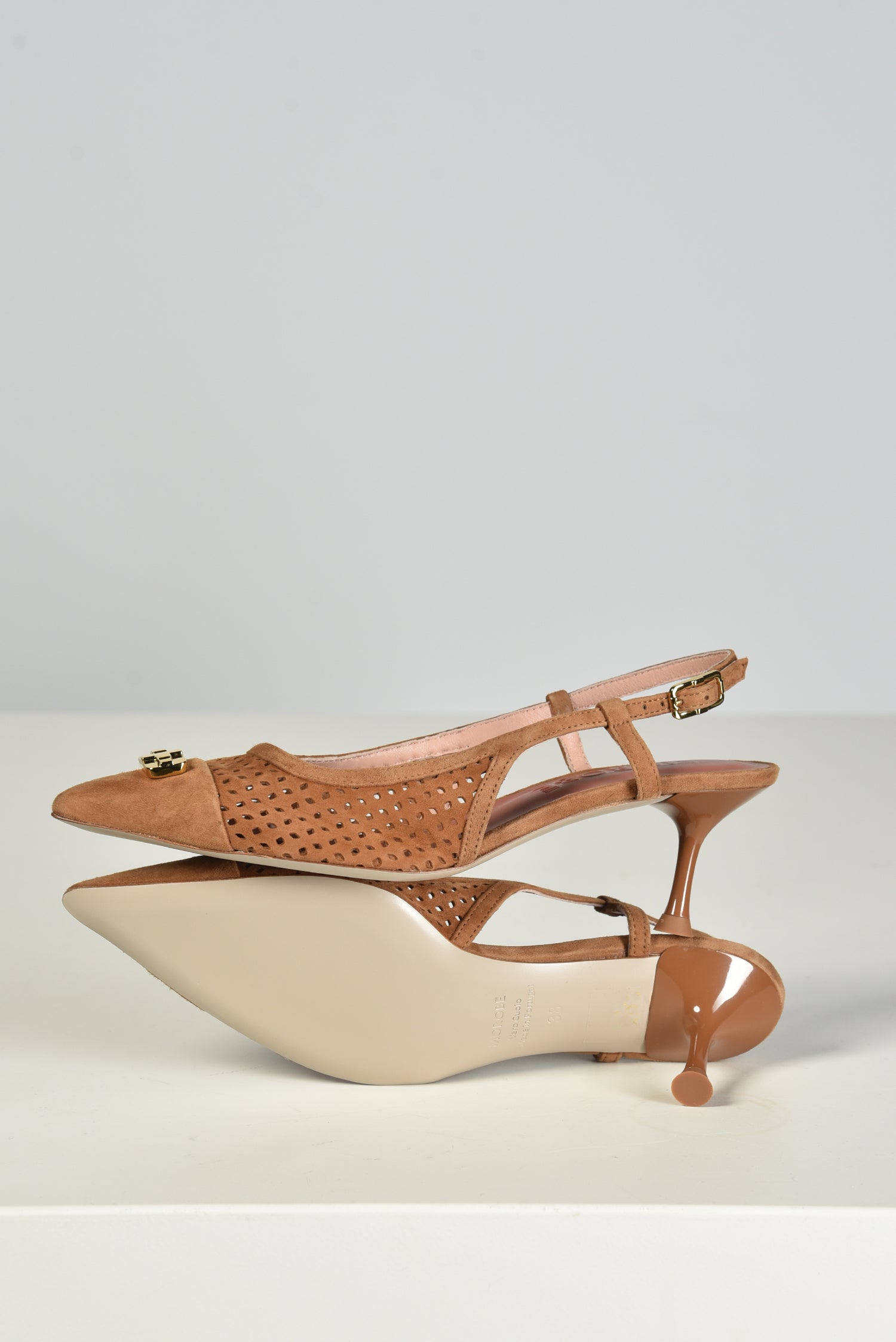De slingback pumps Delilah van Morobe trekken meteen de aandacht met hun uitgesproken vorm en zorgvuldige afwerking. De spitse neus met subtiel goudkleurig detail geeft het zachte suède in cognac extra karakter. Aan de zijkant valt het geperforeerde patroon op, zorgvuldig uitgewerkt met kleine uitgesneden gaatjes. De smalle hak eindigt in een lichte trompetvorm die het silhouet iets speels geeft. Het zachte suède voelt soepel aan en vormt zich mooi om de voet. De Delilah in amaretto combineert elegantie met een opvallend ontwerp, precies zoals je van Morobe mag verwachten. Combineer ze eens met de Morobe pumps Delilah 12 dentelle navy voor een elegante variatie in je garderobe. Deze pumps vallen normaal op maat.