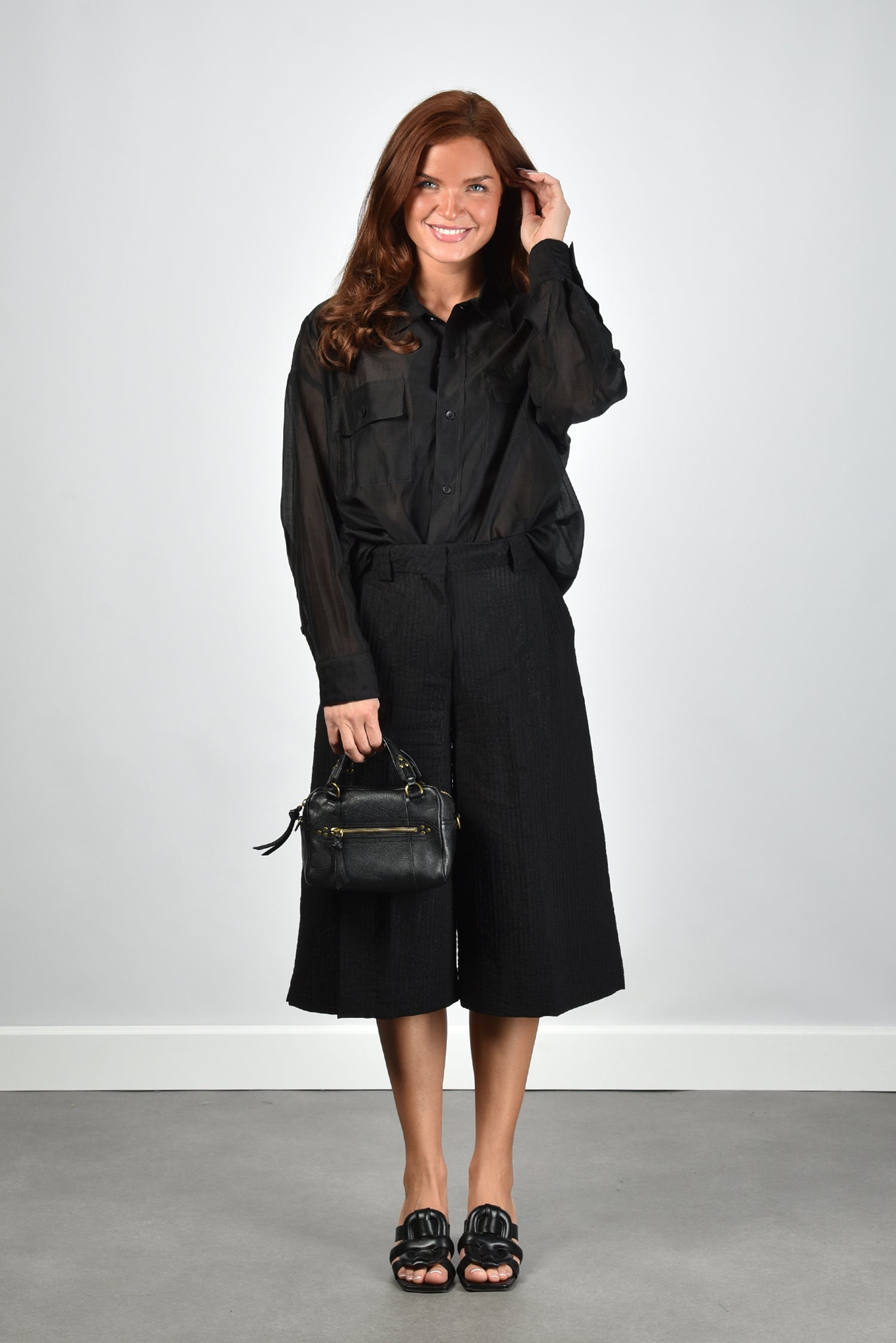 De short Dakota van The Latest is een stijlvolle bermudashort met een hoog aangesloten taille en wijde pijpen. De zwarte stof heeft een subtiele glans en toont de geplooide structuur mooi wanneer je loopt. Dankzij de mix van viscose en polyamide voelt het materiaal soepel en blijft de vorm goed behouden. De ritssluiting aan de voorkant zorgt voor een nette afwerking. Draag de short Dakota met de blouse Daria van The Latest voor een elegante set die stijl en eenvoud combineert. De short valt normaal op maat, dus kies gerust je gebruikelijke maat.