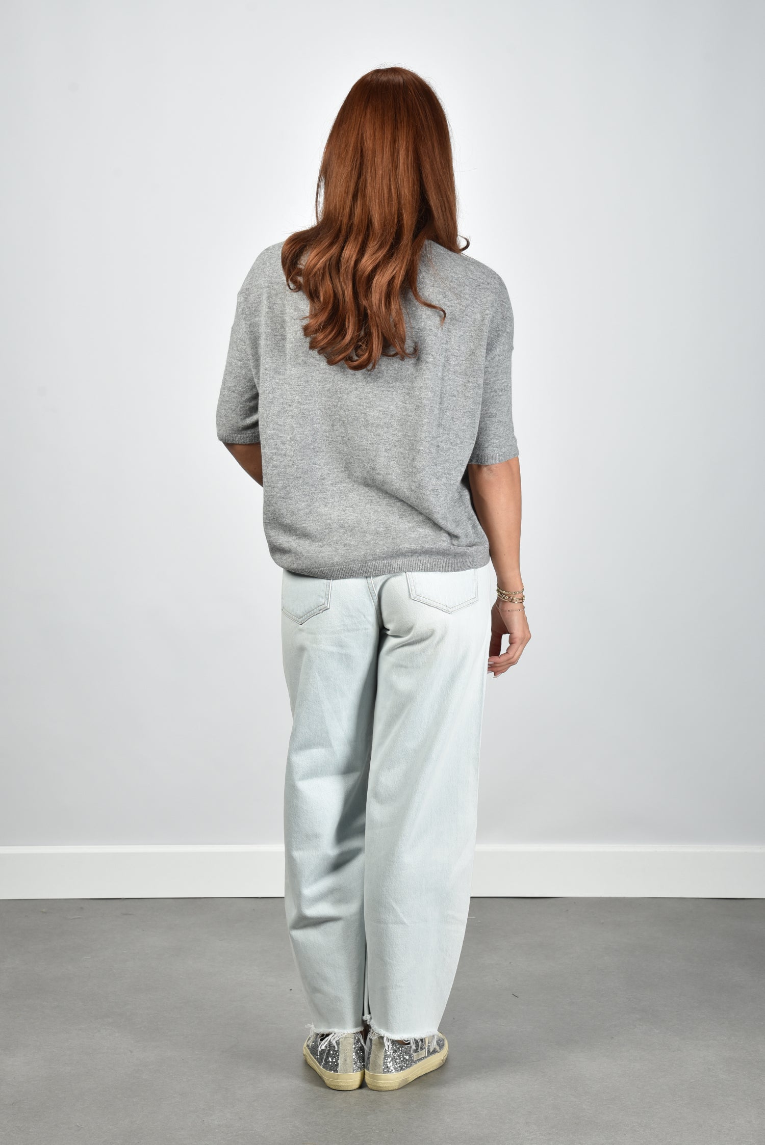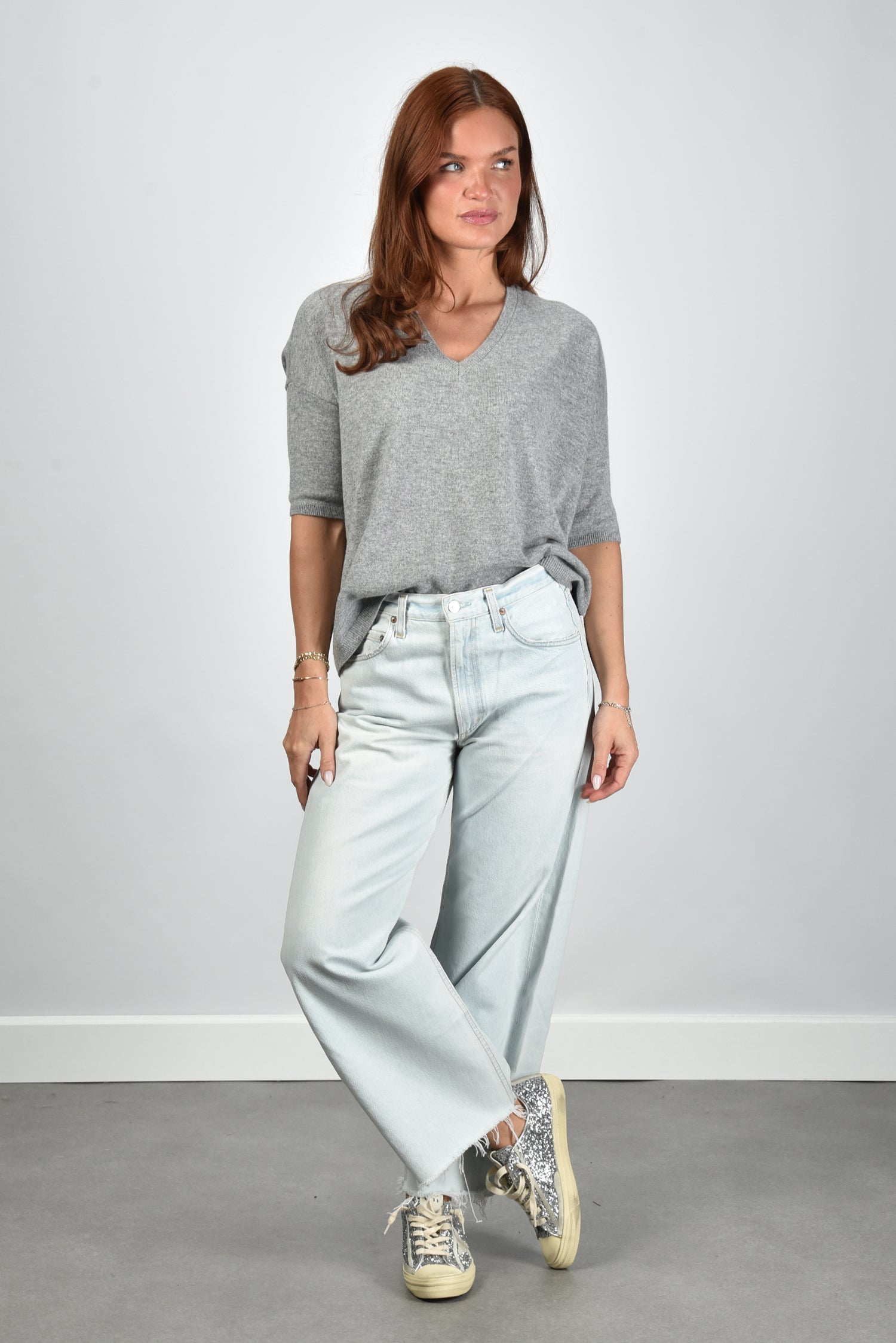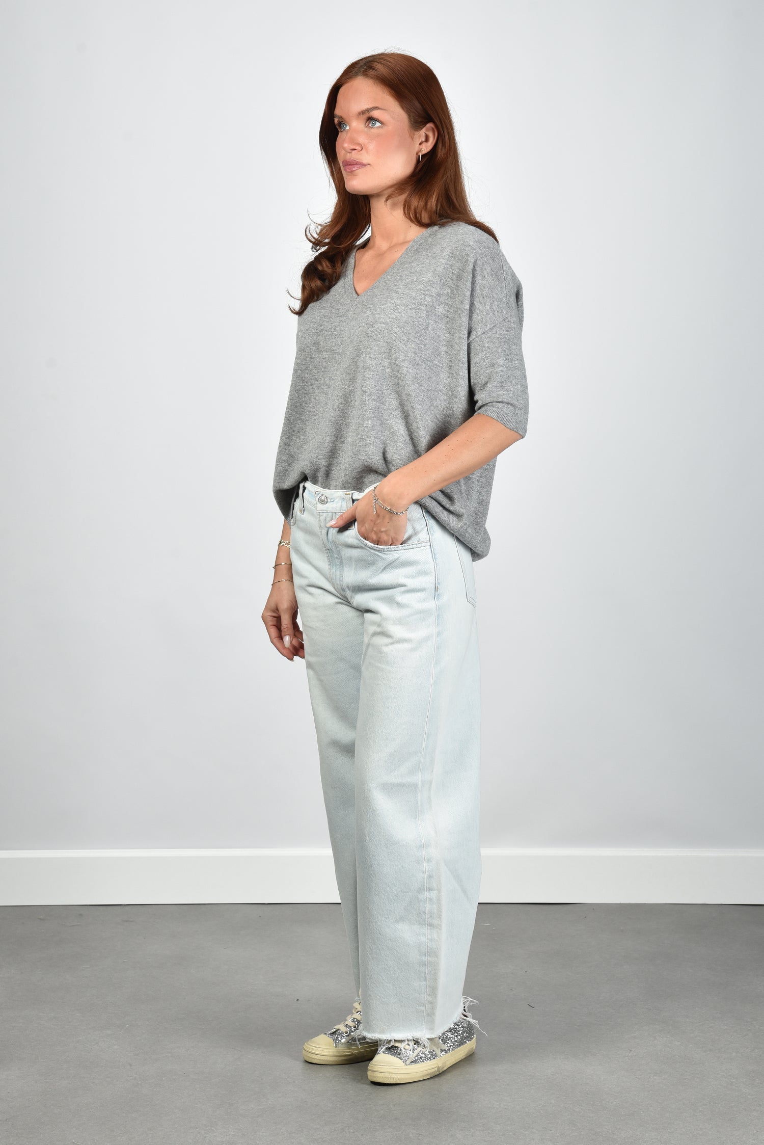 Dit is de trui Martinettie van Les Tricots de Lea, een grijze cashmere trui die duidelijk te zien is door de diepe V hals. De stof voelt licht en soepel, zoals je van hun kasjmier verwacht. De rechte pasvorm valt losjes langs het lichaam, met verlaagde schoudernaden die de lijn zacht laten vallen. De halflange mouwen komen net boven de elleboog en geven het ontwerp een open en rustige indruk. Het cashmere maakt de trui luchtig en prettig om te dragen. De trui valt normaal op maat, dus je eigen maat werkt hier prima.