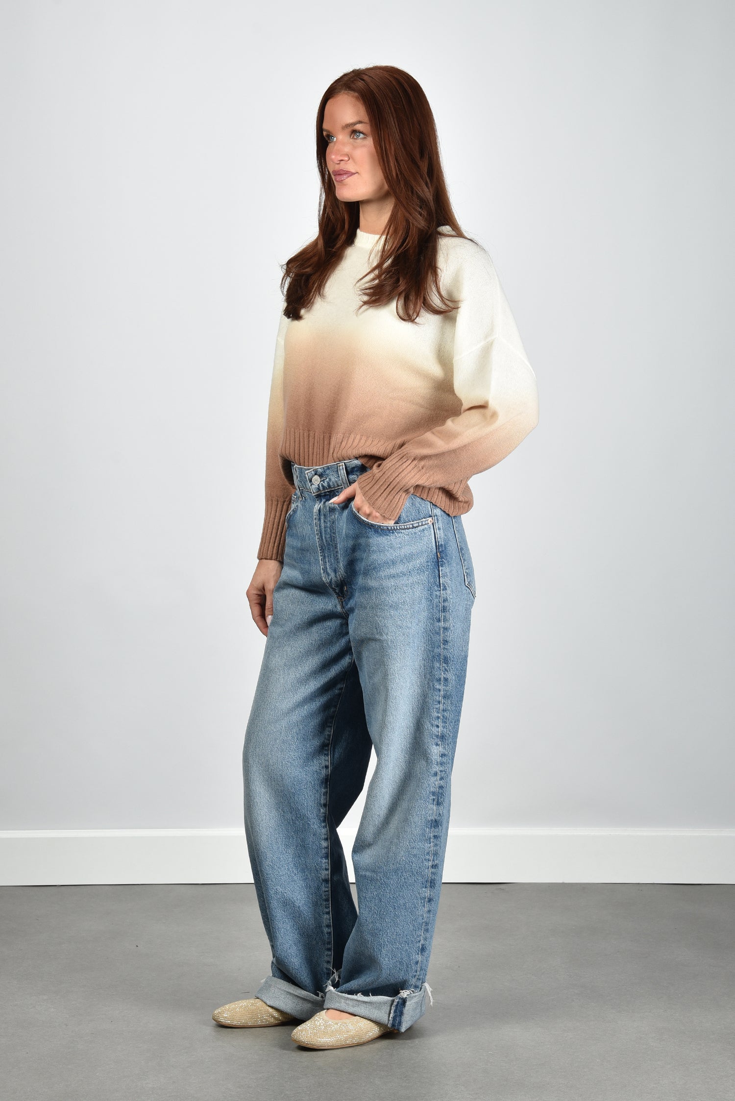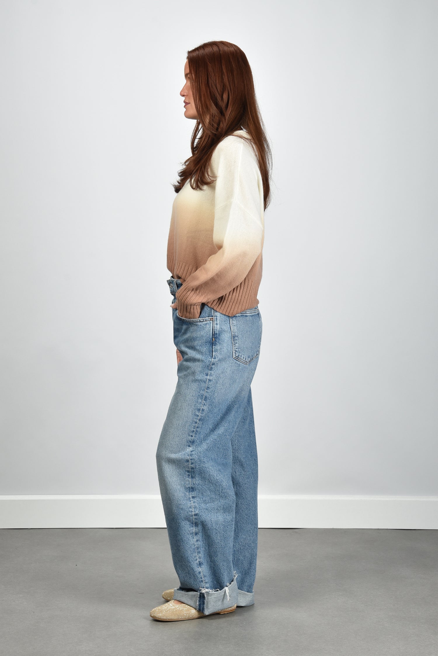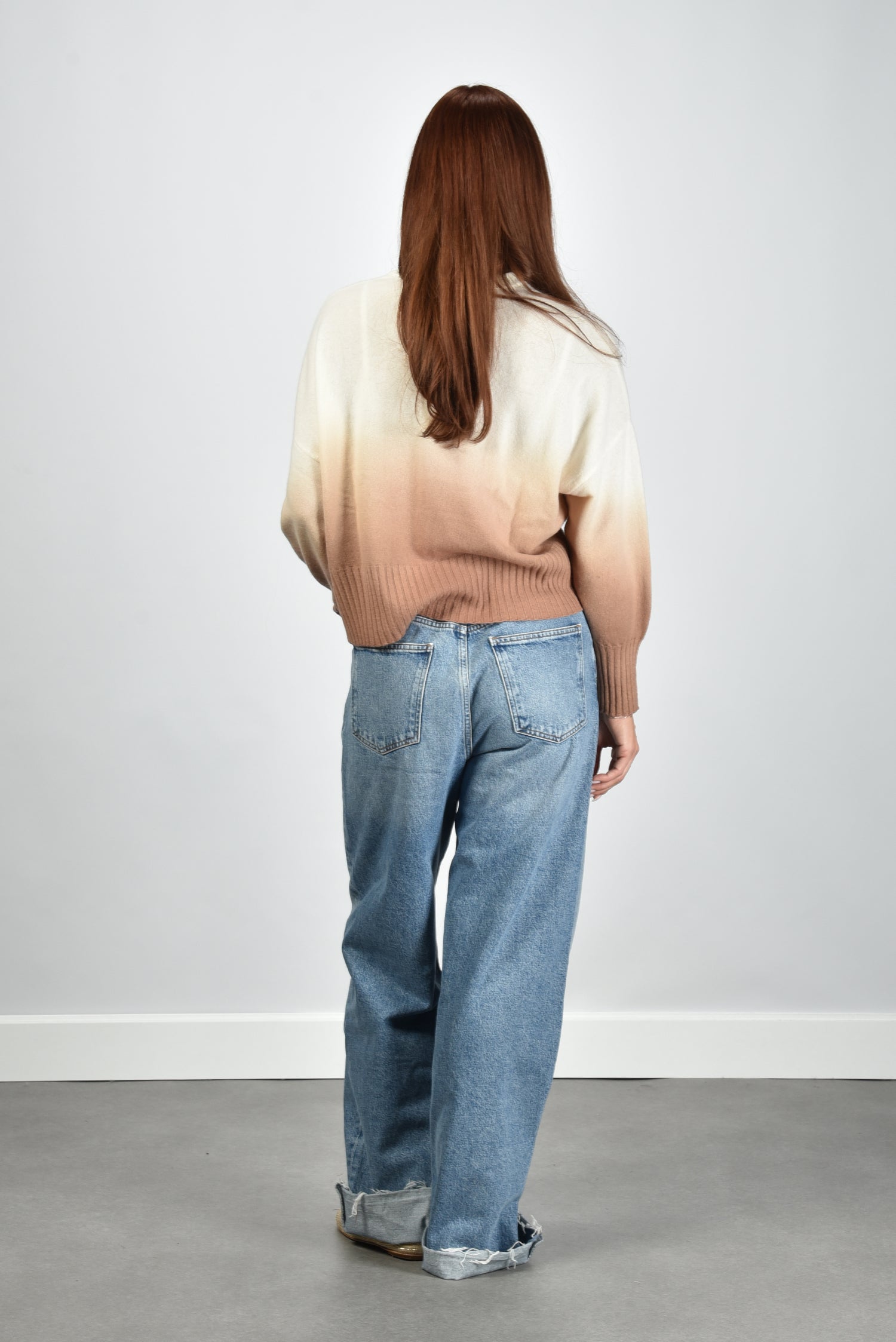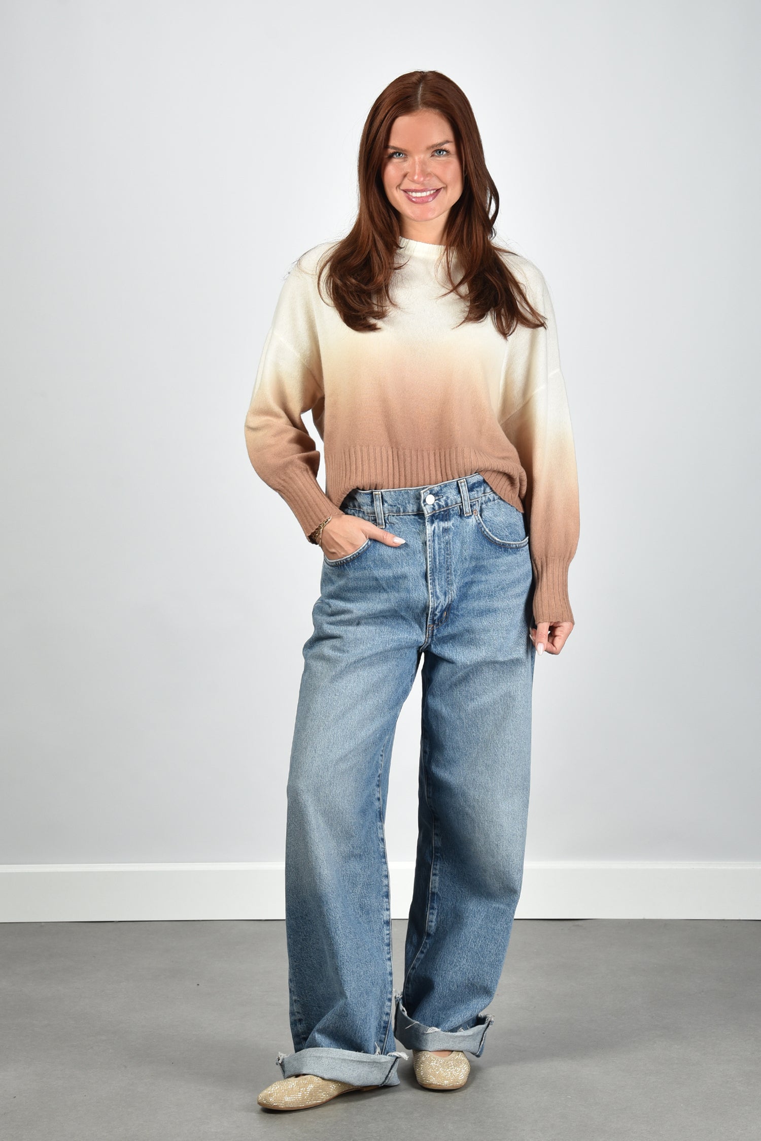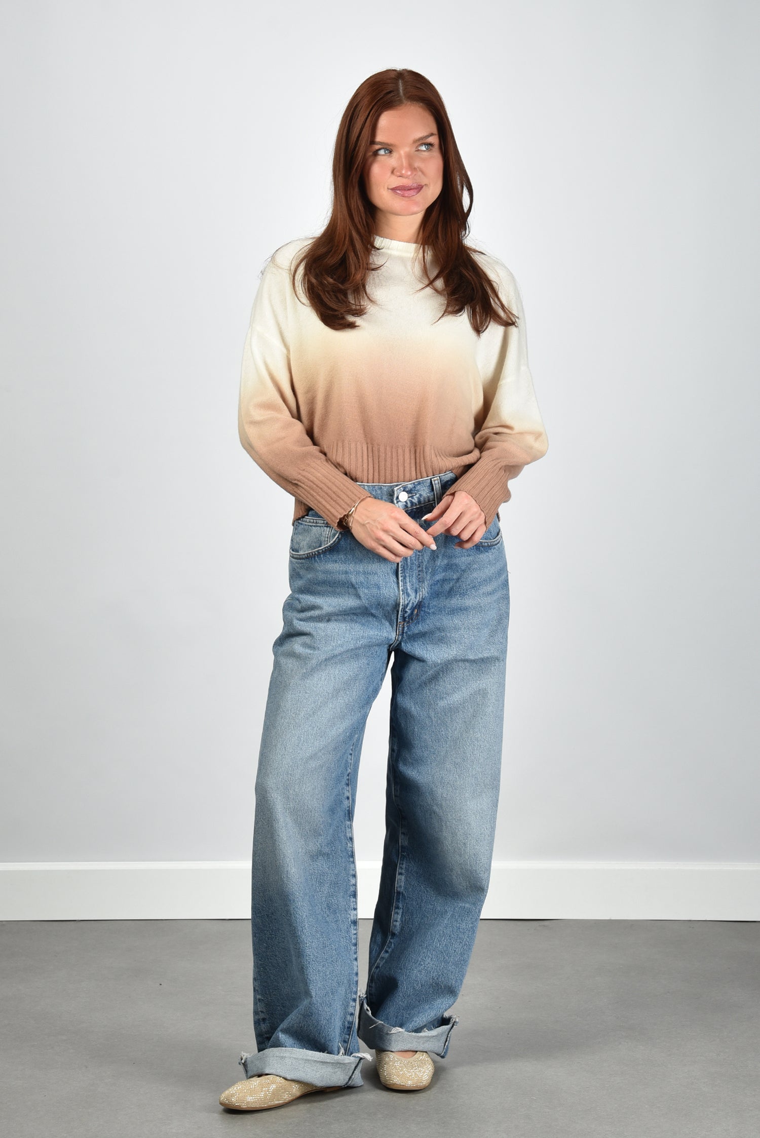 Dit is de Mava trui van Les Tricots de Lea, een cropped model in beige met een zacht ombre verloop richting camel. De cashmere voelt licht op de huid en geeft de trui een volle, gladde textuur. De ballonmouwen vallen ruim, met verlaagde schoudernaden die de vorm ontspannen maken. Brede ribboorden langs de onderkant en mouwen geven het geheel een duidelijke lijn. De pasvorm is normaal, dus je eigen maat werkt het best.