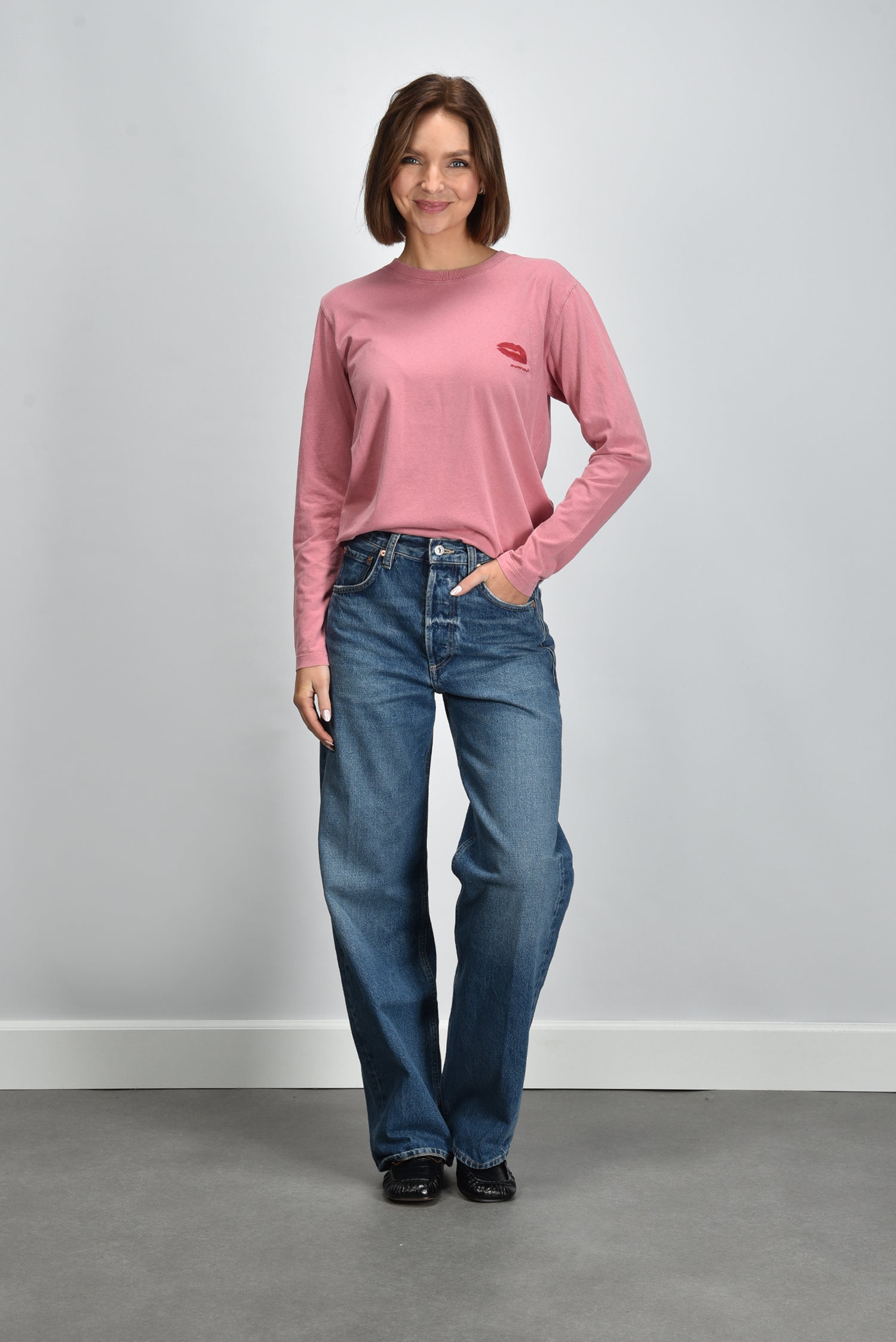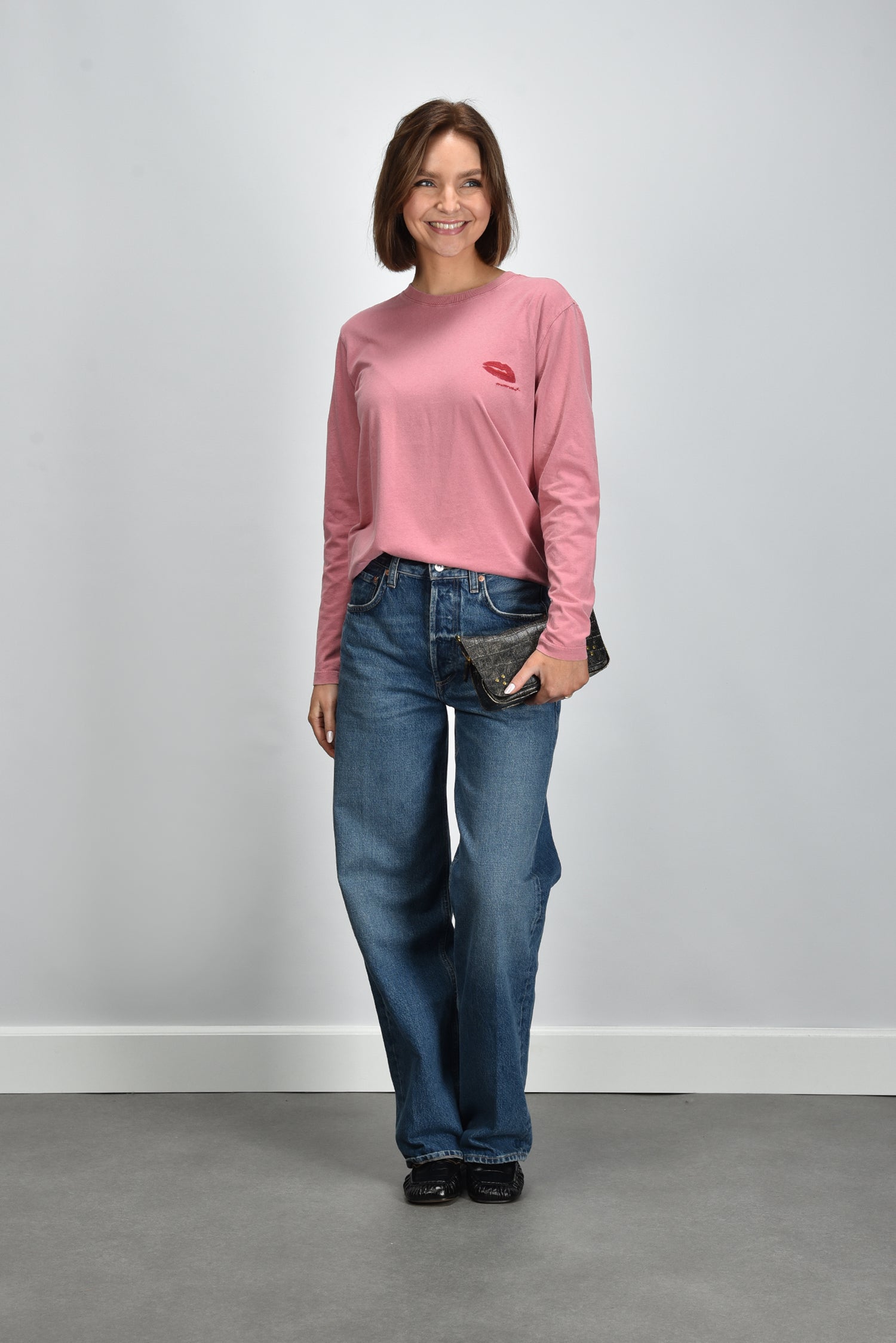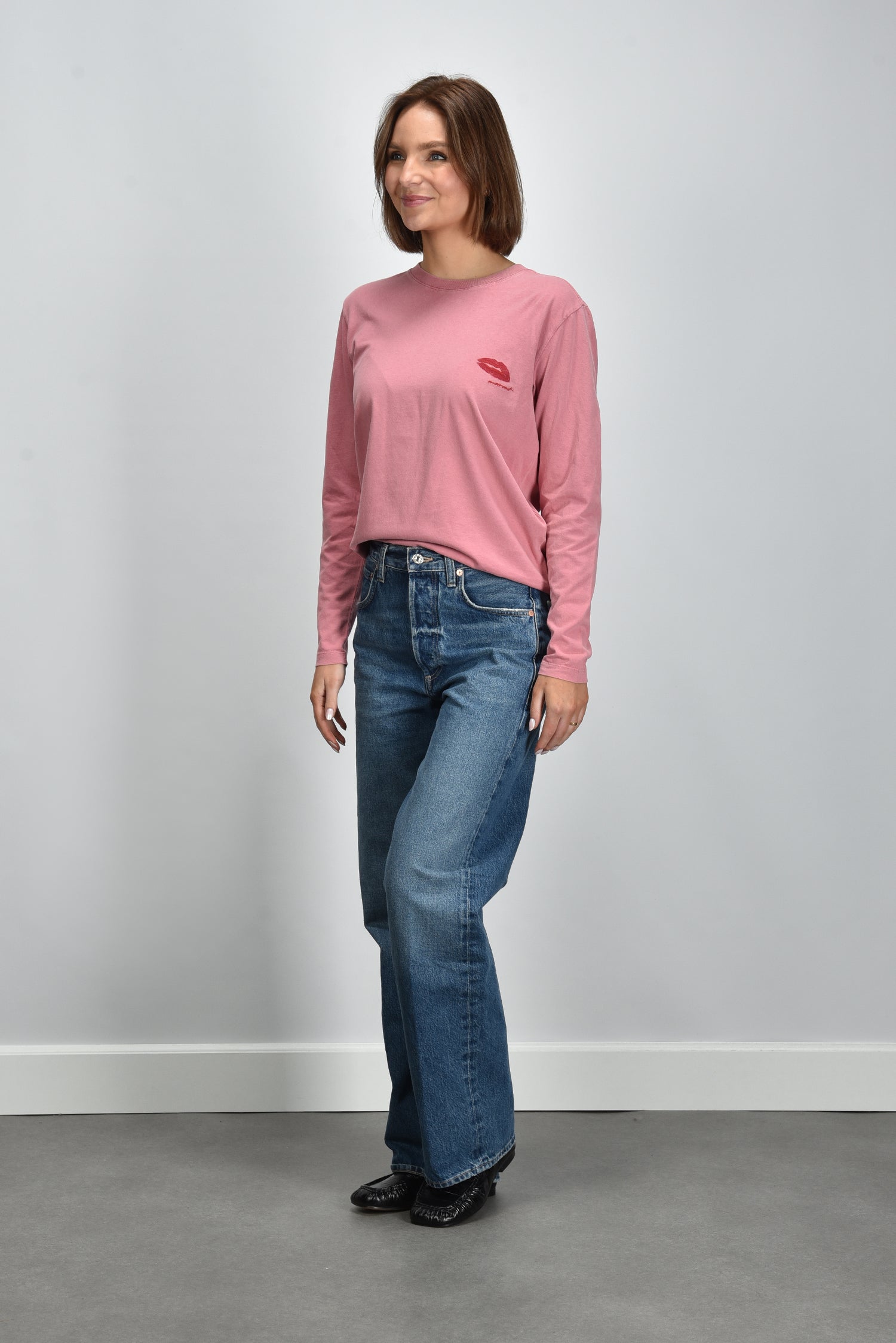 Hier zie je het t shirt Martine in wild rose van Marant Etoile. De zachte roze kleur valt meteen op en het kleine rode lippenlogo op de borst geeft het shirt een speelse noot. De lange mouwen en de rechte pasvorm vallen luchtig om het lichaam. Het katoen voelt stevig maar soepel aan en draagt prettig door de dag. Marant Etoile staat bekend om een ontspannen Franse stijl met een vleugje bohemian en dat zie je hier terug in de vorm en de kleine details. De pasvorm is normaal en je eigen maat werkt hier meestal goed.