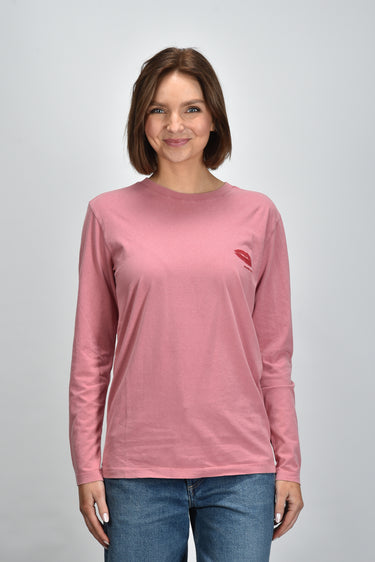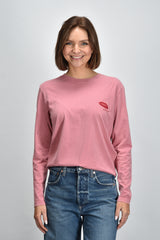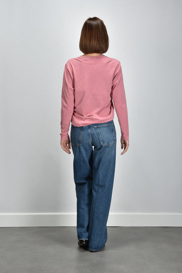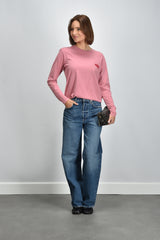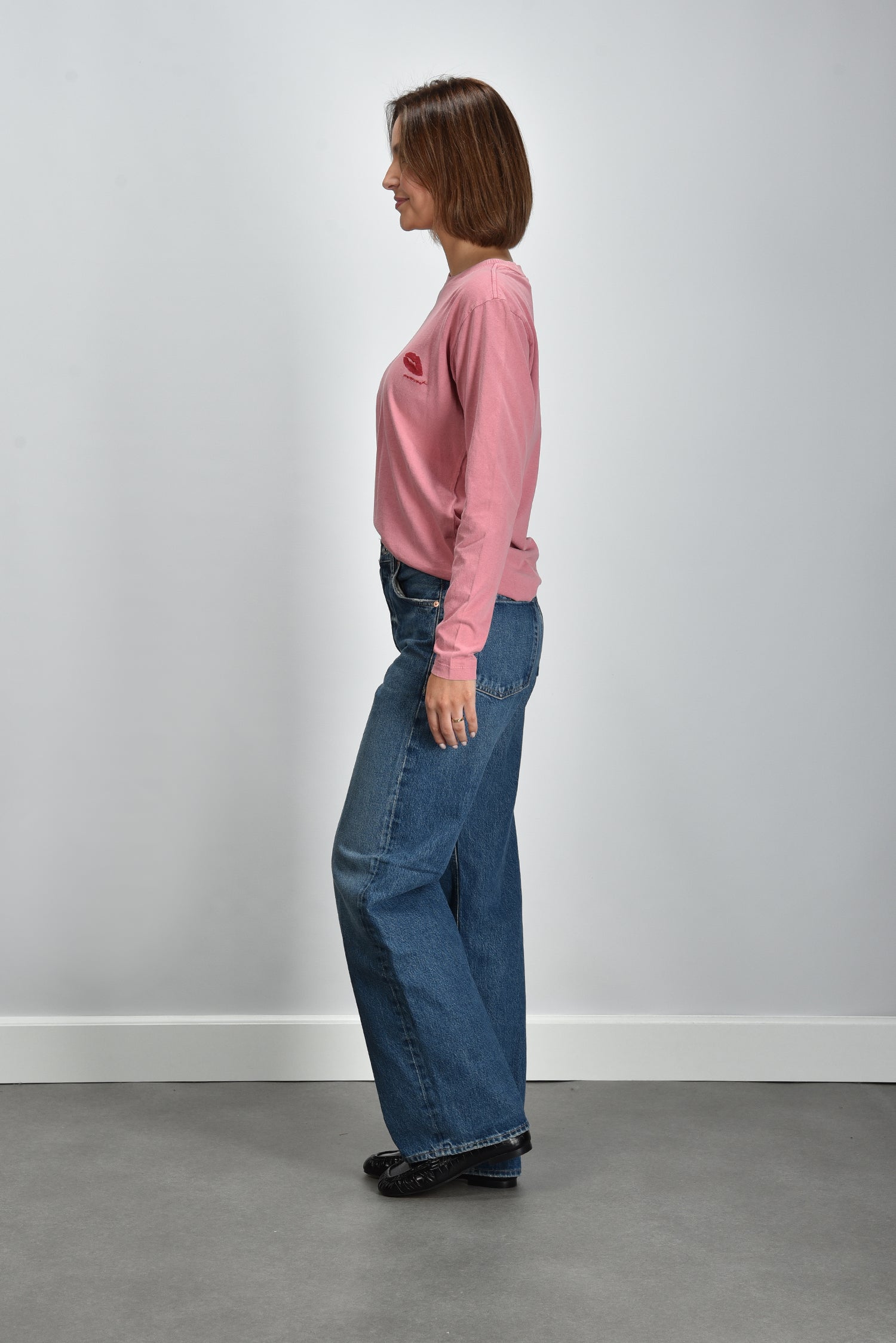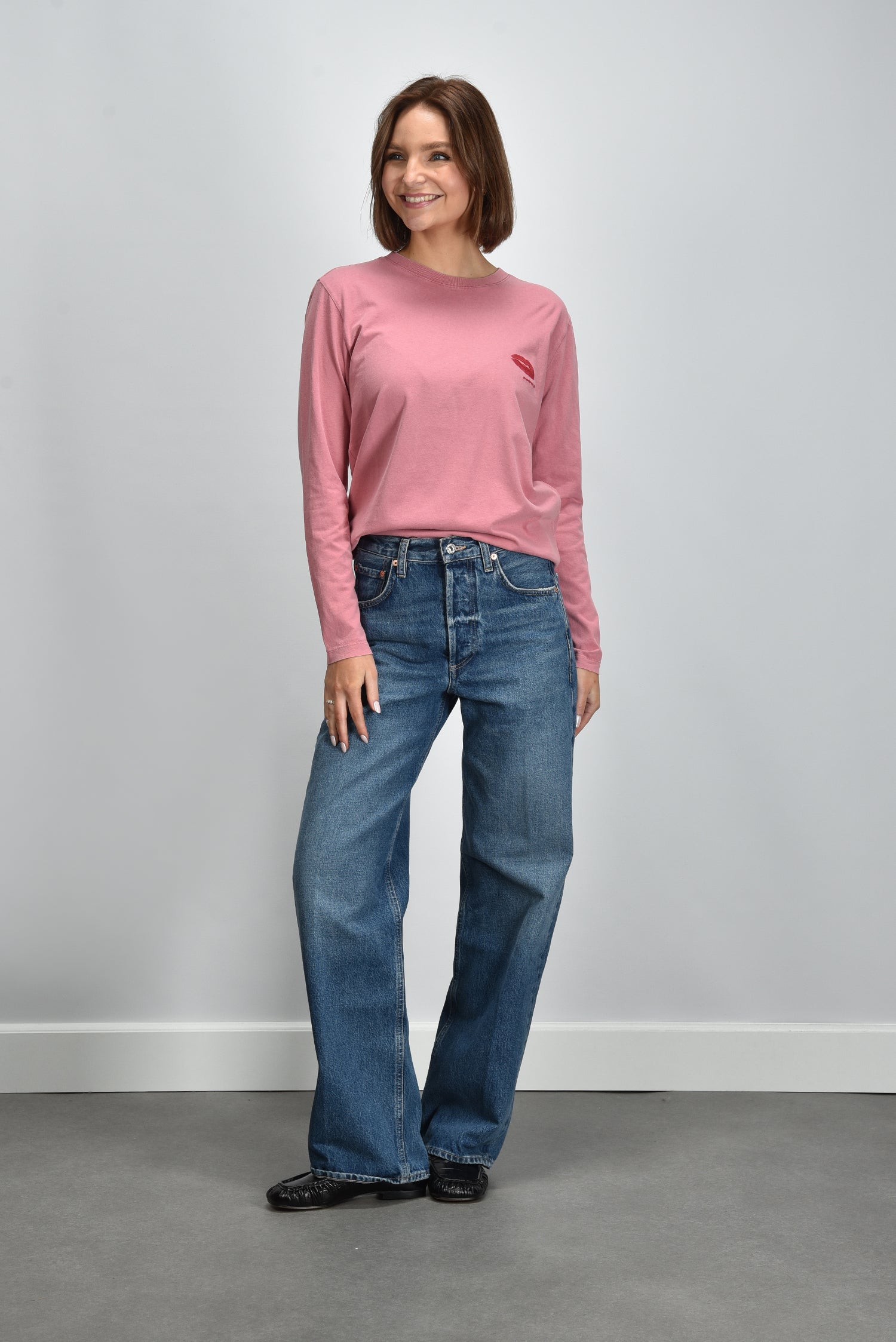 Hier zie je het t shirt Martine in wild rose van Marant Etoile. De zachte roze kleur valt meteen op en het kleine rode lippenlogo op de borst geeft het shirt een speelse noot. De lange mouwen en de rechte pasvorm vallen luchtig om het lichaam. Het katoen voelt stevig maar soepel aan en draagt prettig door de dag. Marant Etoile staat bekend om een ontspannen Franse stijl met een vleugje bohemian en dat zie je hier terug in de vorm en de kleine details. De pasvorm is normaal en je eigen maat werkt hier meestal goed.