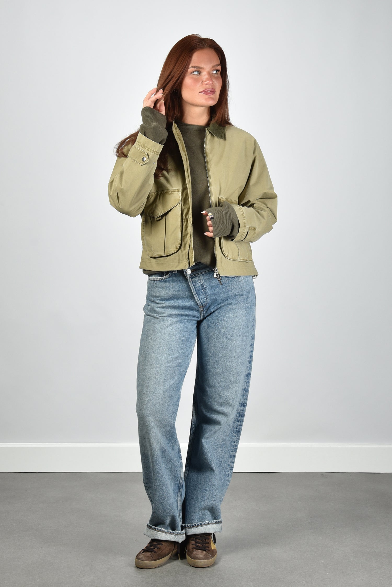 De jas Indal C van Blonde no.8 is een kort model in een volle groentint die het beste als dark khaki te omschrijven is. De stevige katoenkwaliteit voelt betrouwbaar en luchtig aan, ideaal als tussenjasje. Aan de voorkant vallen de grote klepzakken met drukknoopsluiting meteen op, praktisch en met karakter. De ritssluiting is dubbel uitgevoerd, zodat je hem op meerdere manieren open kunt dragen. De contrasterende ribkraag geeft het geheel een stoerdere twist. Door de normale pasvorm draag je de jas prettig over een lichte trui, bijvoorbeeld de Extreme Cashmere trui Tes 355 army, voor een ontspannen, stijlvolle set. Zoals je van Blonde no.8 mag verwachten, klopt alles aan het ontwerp: van de nette afwerking tot de doordachte details.