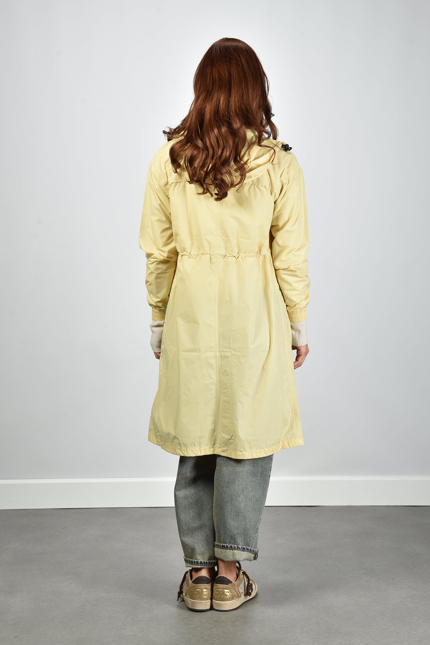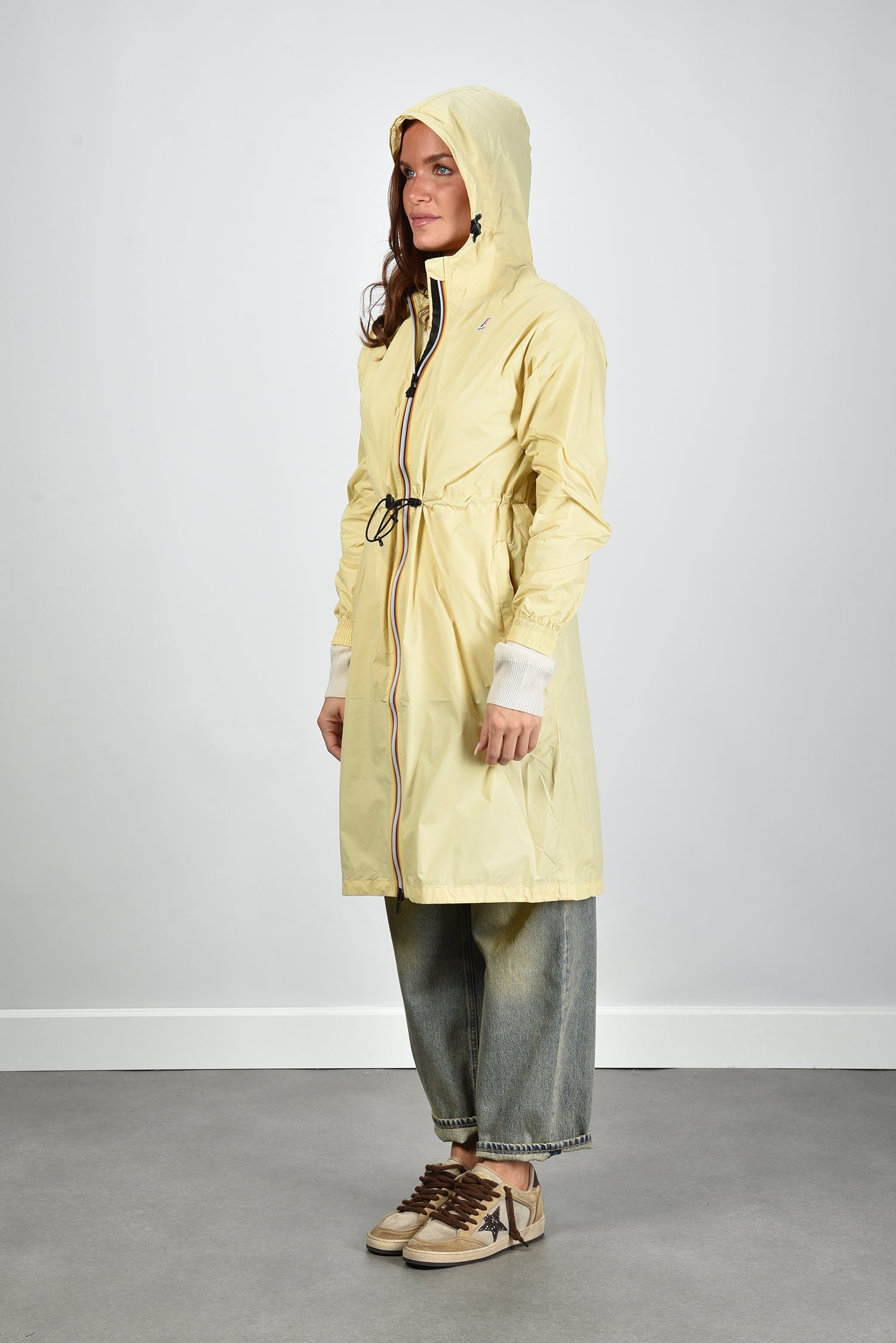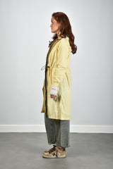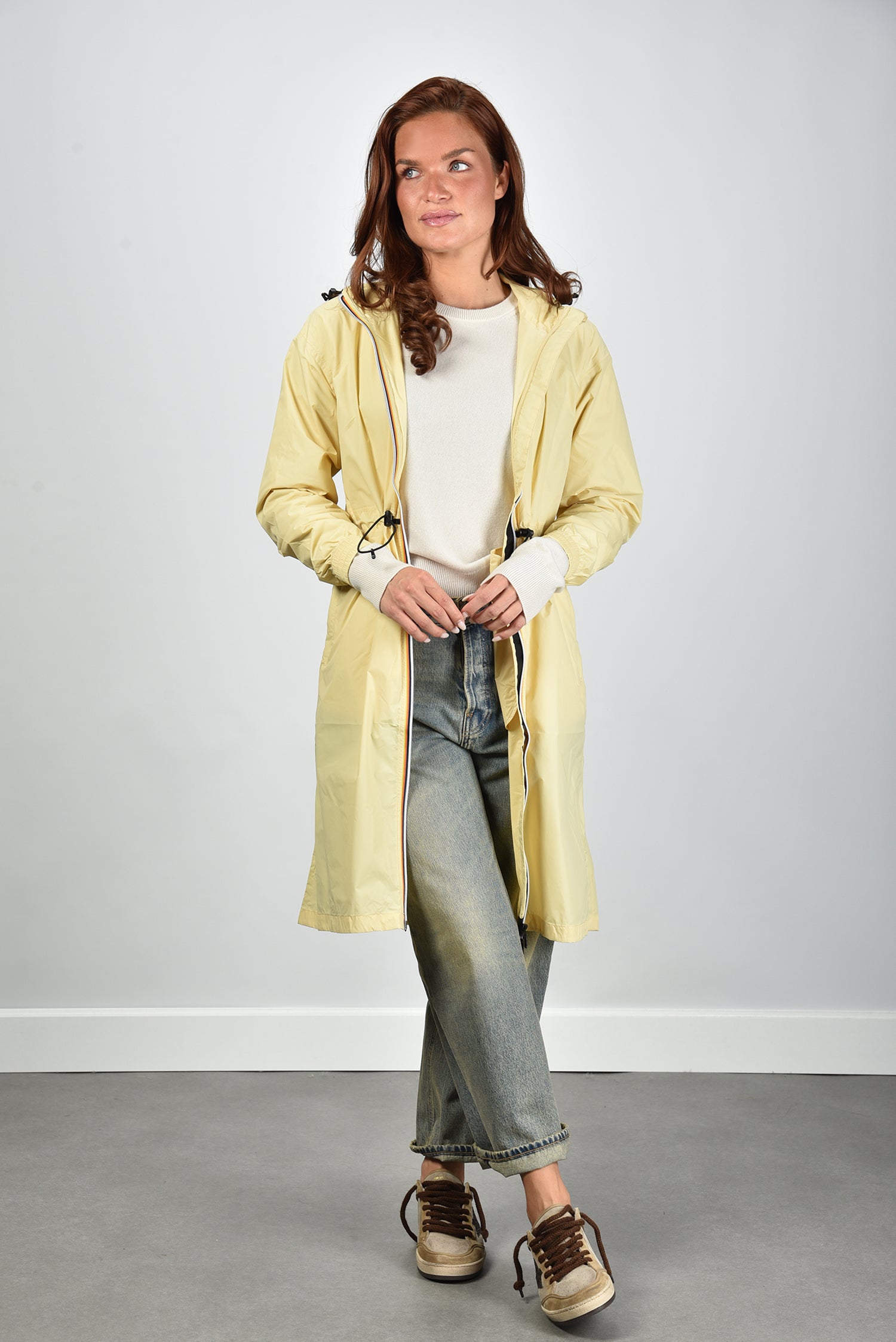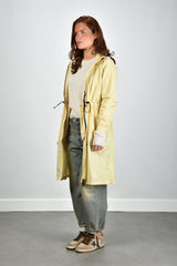 De jas Delia van KWAY is een lichtgewicht 3/4 jas in zachtgeel met een subtiele beige parsnip tint. De gladde polyamide geeft een soepele structuur die prettig aanvoelt en beschermt tegen wind en lichte regen. Dankzij de ritssluiting en de verstelbare taille draag je hem zowel open als gesloten in een mooie, vrouwelijke lijn. De capuchon met trekkoord maakt hem praktisch zonder dat het aan stijl ontbreekt. De elastische boorden zorgen voor een nette afwerking rond de pols. Combineer deze jas op koelere dagen met de Extreme Cashmere trui March 475 bone voor een sportieve, cleane look. De Delia valt normaal op maat, dus je kunt je gebruikelijke maat bestellen.
