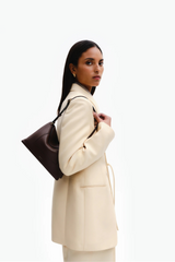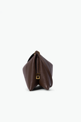 Dit is de crossbody Penelope Slouch in coffee crust van Wandler. Het rechte silhouet voelt soepel door het zachte kalfsleer, met een donkere, rijke tint die mooi diep oogt. De subtiele textuur geeft net wat extra leven aan het oppervlak. De gouden accenten op de gesp en de merknaam zorgen voor een rustige glans. Wandler laat hier zien hoe hun lijnenspel uitpakt in een handgemaakt ontwerp uit Italië, met aandacht voor vorm en materiaal. De tas draagt licht en blijft door haar compacte formaat prettig tegen het lichaam vallen.