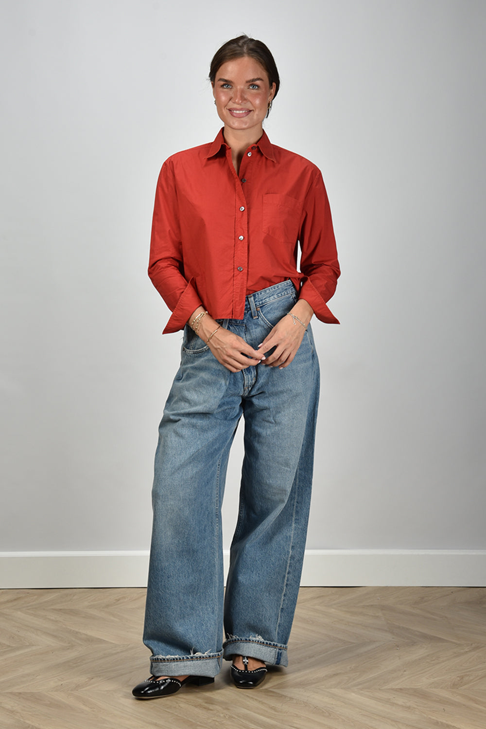 Our model Lise is 1,73m and Lise heeft maat 36/S/27. Deze blouse valt normaal op maat