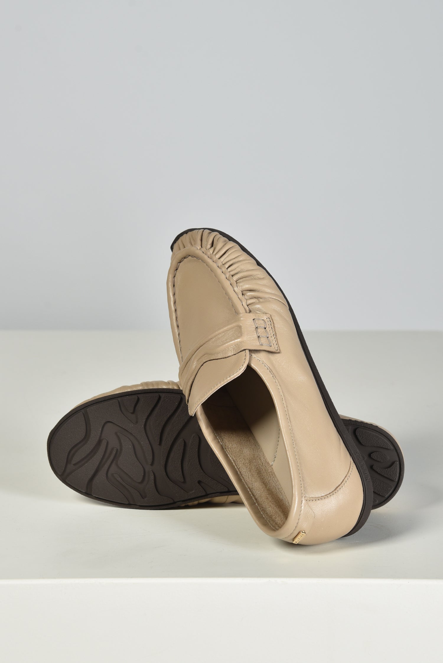Hier zie je de loafers Riley Mio van Nubikk. De taupe leather tint geeft het zachte leer een rustige diepte. De neus valt meteen op door de fijne plooien rondom de rand, die het model een duidelijke vorm geven. Op de wreef ligt een brede band met een helder decoratief detail dat stevig is aangezet. De platte zool heeft een donkere kleur met een duidelijke profielrand die het geheel een stabiele basis geeft. Het leer voelt compact en soepel tegelijk. Ze vallen normaal op maat, dus je kunt uitgaan van je eigen maat. Nubikk staat bekend om ontwerpen die net even anders zijn, met slimme details en een frisse benadering van schoenen maken. Deze loafers passen precies in die lijn, met een duidelijke vorm en een zorgvuldige afwerking.