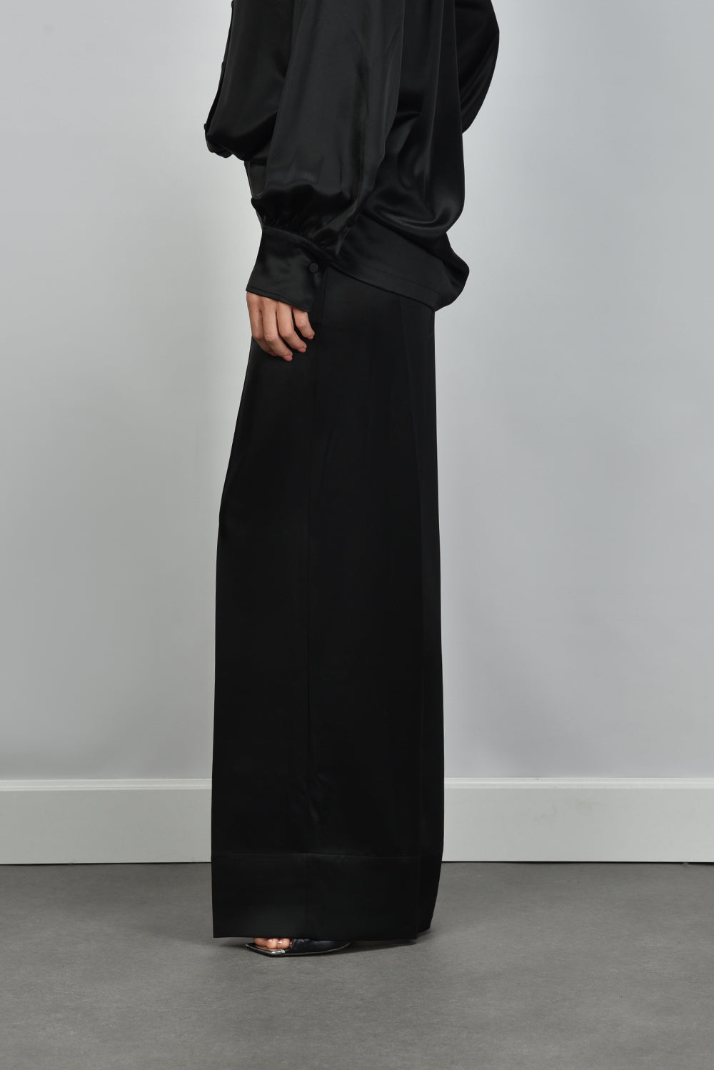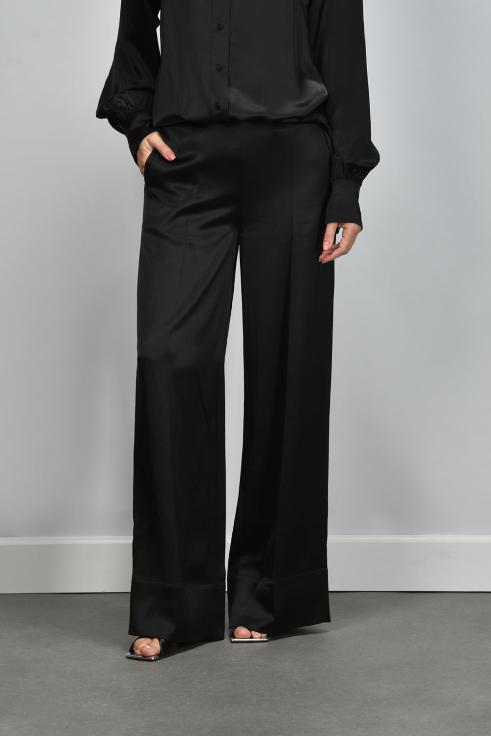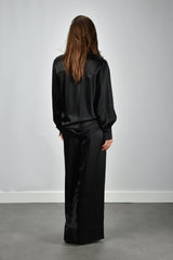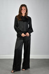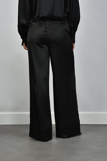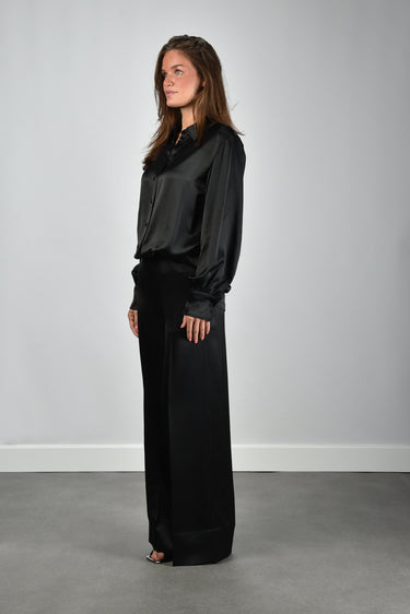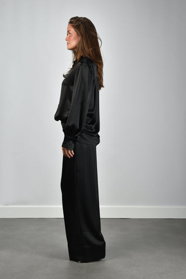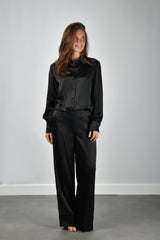 De broek Dijon van Joseph is een satijnen broek met een hoge taille in diep zwart. De stof heeft een gladde, licht glanzende structuur die soepel langs het been valt. Dankzij de hoge taille sluit de broek mooi aan en verlengt ze optisch het silhouet. Het model valt normaal op maat en voelt verfijnd maar stevig aan door de mix van acetate en polyester. Combineer deze broek met een paar elegante sandalen voor een moderne, luxe uitstraling. Zoals altijd bij Joseph draait het om perfecte snit en materiaalgevoel, zonder opsmuk maar met zichtbaar vakmanschap.