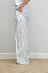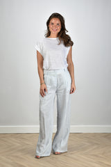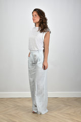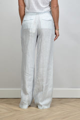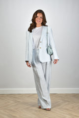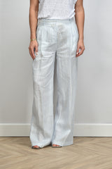 Here you see the Semicouture trousers blue, model Riga Sky. These elegant trousers are made of 100% linen and offer a regular fit for optimal comfort. Perfect to combine with various styles thanks to its versatile design. Model Lise wears size M with a height of 1.73m. Article number: S5SS20-R098-Riga Sky.