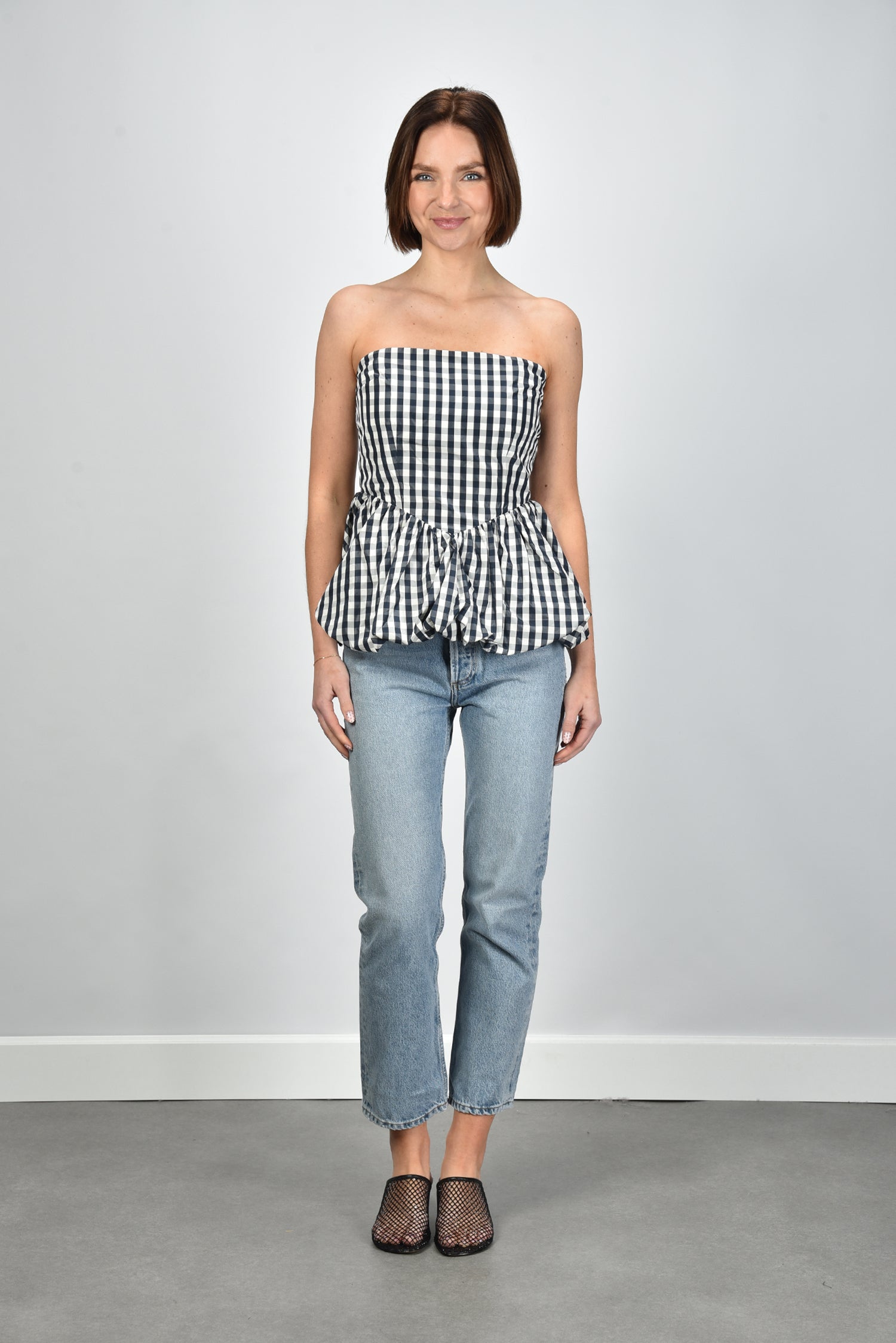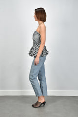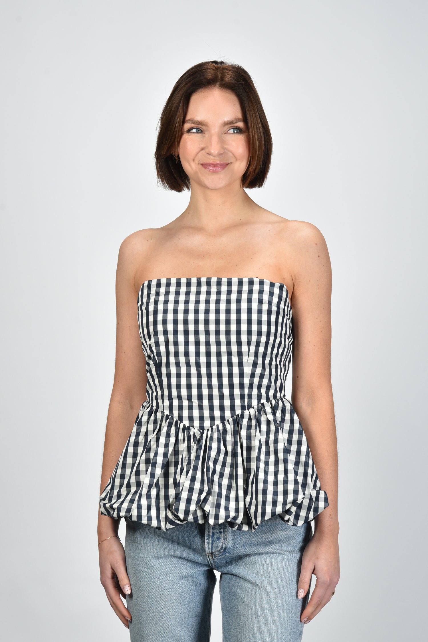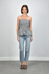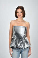 De strapless top Leona van Sage & Ivy heeft een zwart-wit geruit dessin dat direct in het oog springt. De top sluit mooi aan rond het lijf en loopt subtiel uit in een peplumvorm, wat zorgt voor een elegante belijning. De stevige stretchstof met 51% polyester en 49% elastaan voelt glad en vormt soepel mee zonder te knellen. De check navy tint geeft het geheel een frisse, grafische uitstraling die eenvoudig combineert met een rechte pantalon of een hoge rok. Leuk met de Lola Cruz pumps in negro voor een complete, vrouwelijke set. Sage & Ivy ontwerpt en produceert in Europa, met aandacht voor vakmanschap en een exclusieve afwerking in kleine oplages.