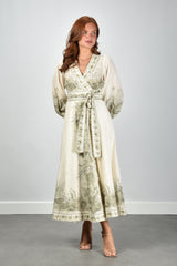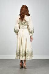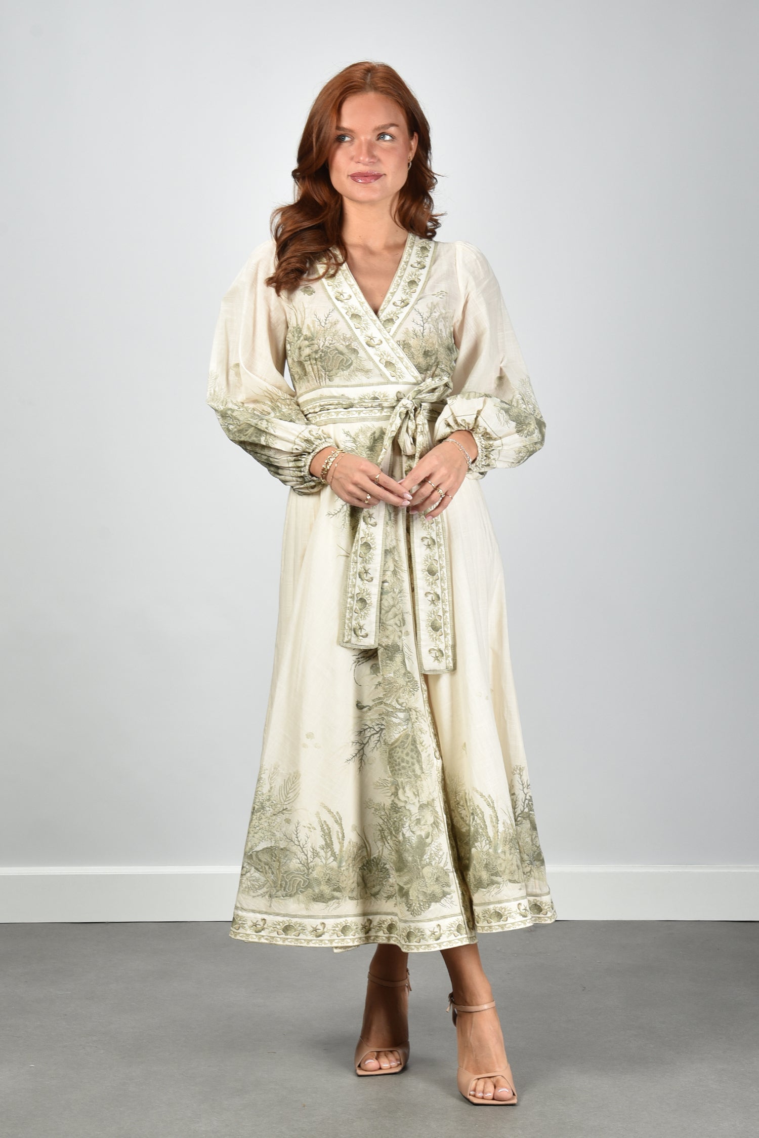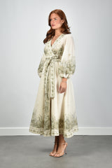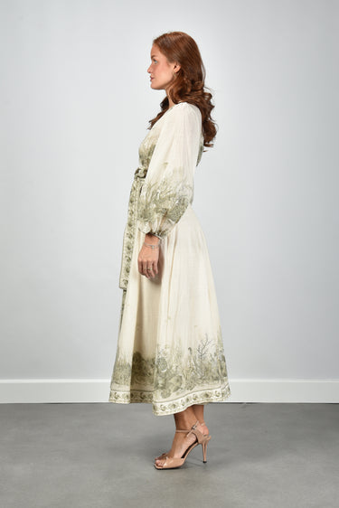Dit is de Wanderlust Wrap Mini van Zimmermann. Een korte wikkeljurk in beige, uitgevoerd in licht en soepel katoen. De strikceintuur trekt de taille rustig aan en geeft het model een duidelijke vorm. De botanische print langs de zoom, mouwen en halslijn valt direct op door de fijne tekeningen en heldere lijnen. De mouwen zijn ruim en zacht geplooid, met een elastische boord die het volume mooi laat vallen. De stof voelt luchtig aan en draagt prettig op warme dagen. De jurk valt normaal op maat, dus je eigen maat werkt hier het best. Zimmermann staat bekend om zijn uitgesproken stijl en zorg voor detail, wat je in dit ontwerp duidelijk terugziet.
