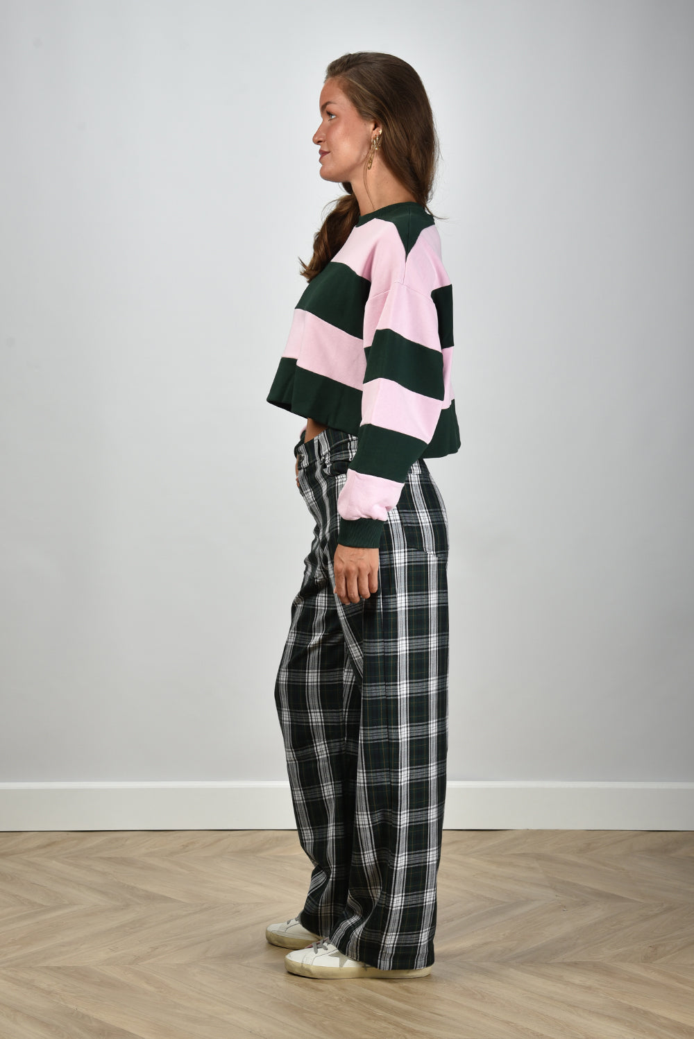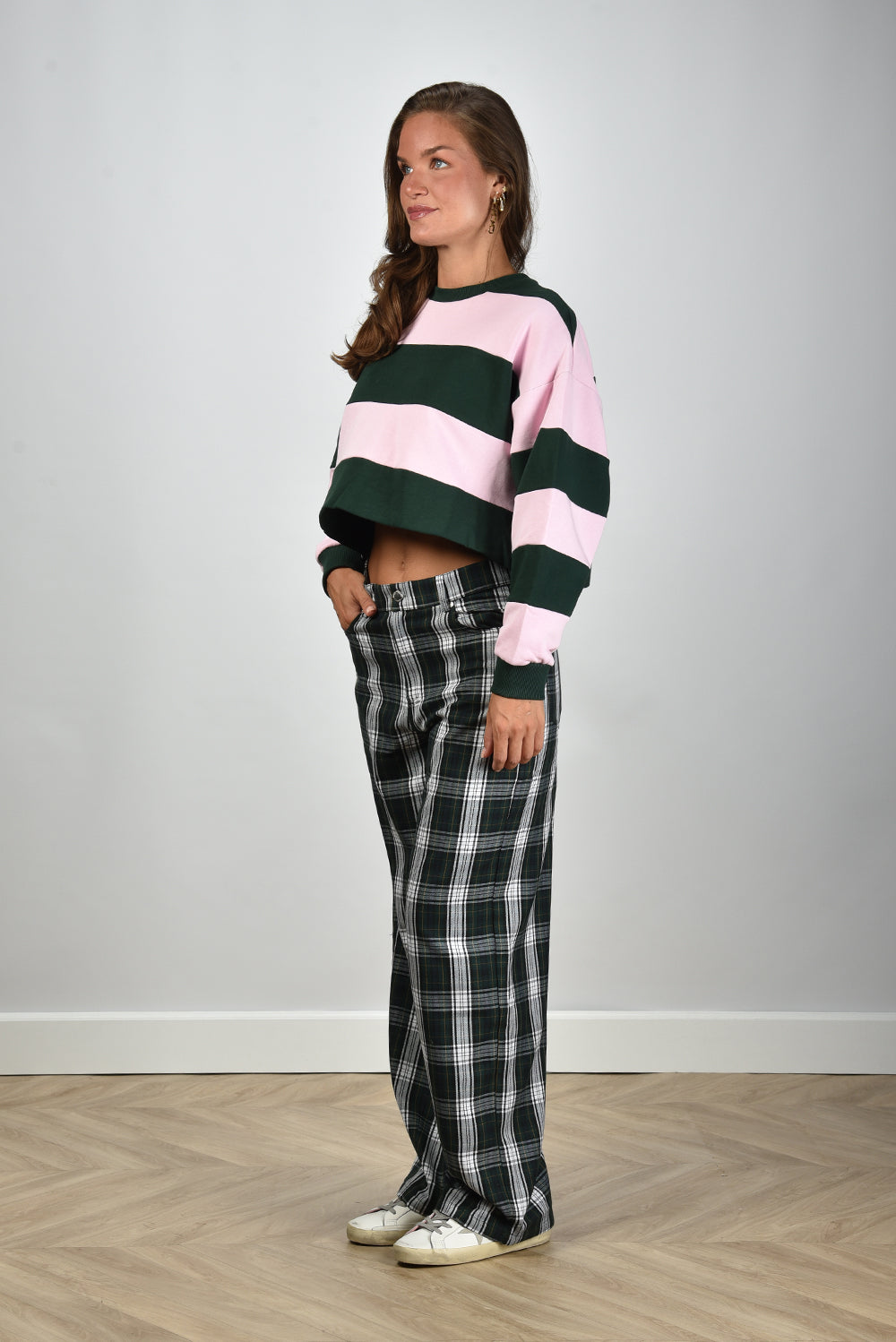 Our model Lise is 1,73m and Lise heeft maat 36/S/27. Deze sweater valt normaal op maat