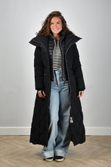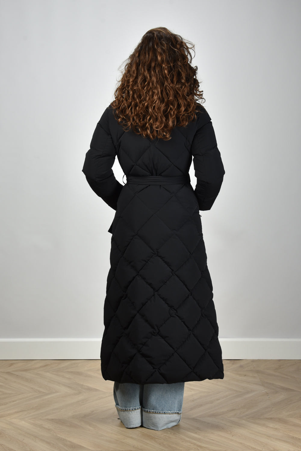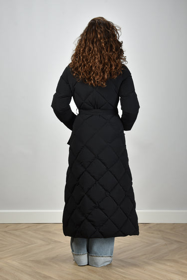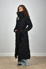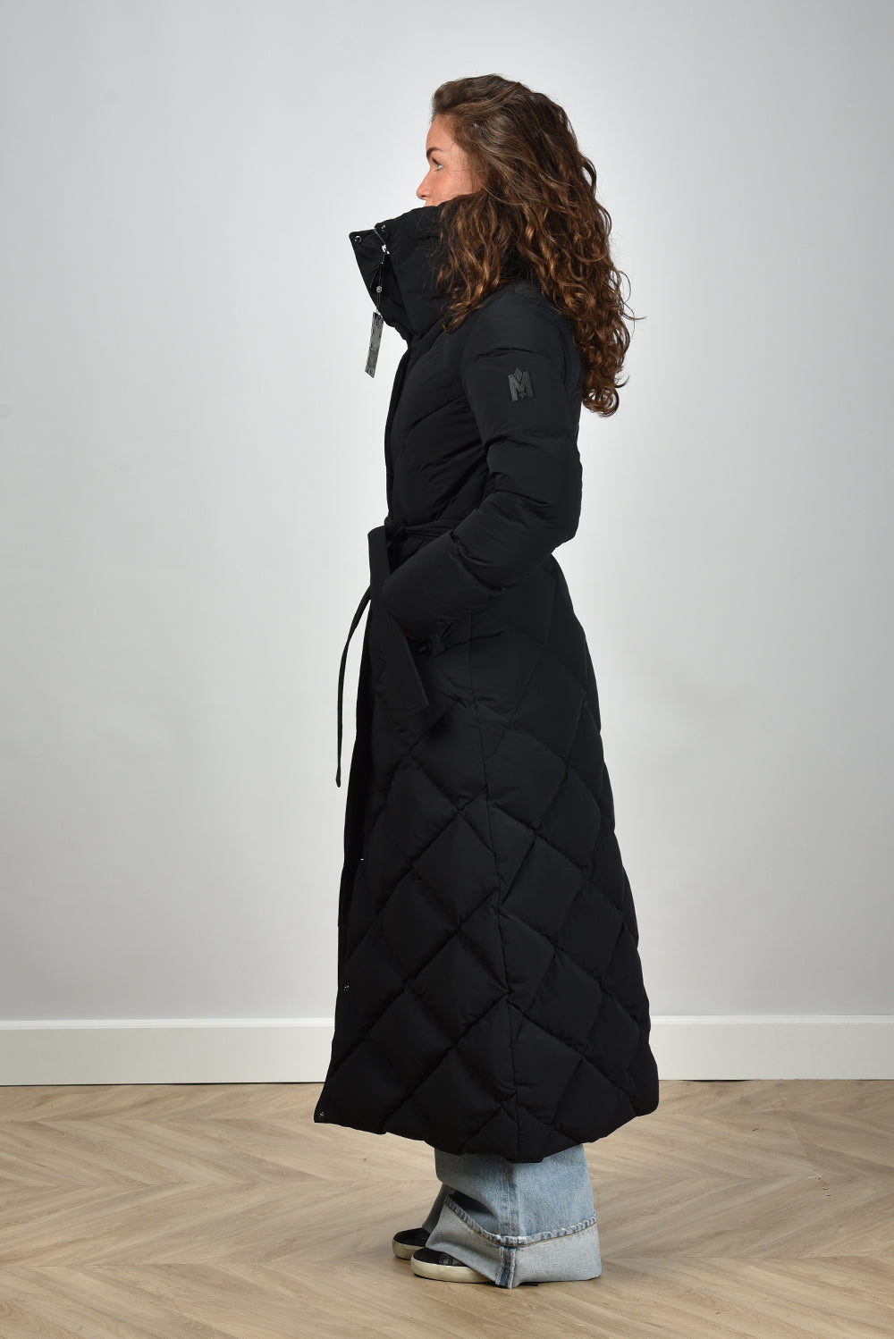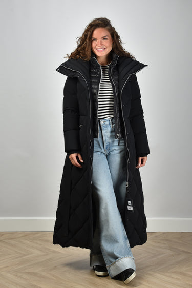 Dit is de jas LAURELLA van Mackage, een lange zwarte jas met een stevige rits en een hoog openvallende kraag die meteen de vorm bepaalt. Het rechte, enkellange silhouet geeft de jas een rustige lijn, terwijl het ruitvormige stikpatroon structuur en diepte toevoegt. De nylon met spandex maakt de buitenkant licht en soepel, prettig bij dagelijks lopen. De pasvorm valt normaal op maat. Zoals je van Mackage gewend bent, is het ontwerp strak uitgewerkt, met aandacht voor elke naad en het silhouet dat mooi langs het lichaam loopt. Een zwarte buitenlaag, door het merk black genoemd, maakt het geheel helder en standvastig.