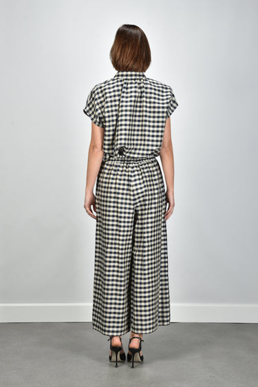 De broek Donare van Weekend Max Mara is een model dat direct de aandacht trekt door de lichte, losse val en de elegante wijde pijp. De stof van katoen en ramie heeft een subtiele structuur en voelt stevig maar luchtig. Het navy vichy motief, een klassiek zwart wit ruitpatroon, zorgt voor een frisse, moderne uitstraling. De pijplengte tot de enkel maakt de broek geschikt om te dragen met open sandalen zoals de Morobe sandalen Mimi 05 black. De Donare broek valt normaal op maat en heeft de ontspannen snit waar Weekend Max Mara om bekendstaat: nonchalant en verzorgd, met een Italiaanse flair die elk silhouet licht laat ogen.