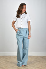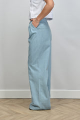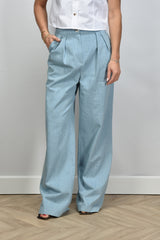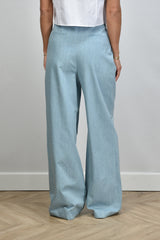 Here you can see the Sage & Ivy pants Randy in Denim Strass. These elegant pants, made of 100% cotton, offer a regular fit and are ideal for various occasions. Hand wash recommended to maintain quality. Model Lise wears size M with a height of 1.73m. Article number: Randy.