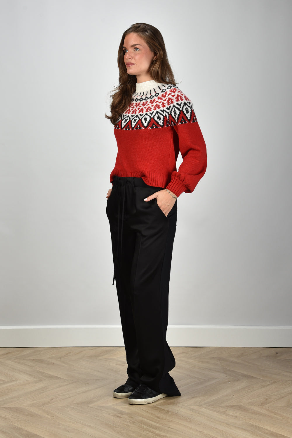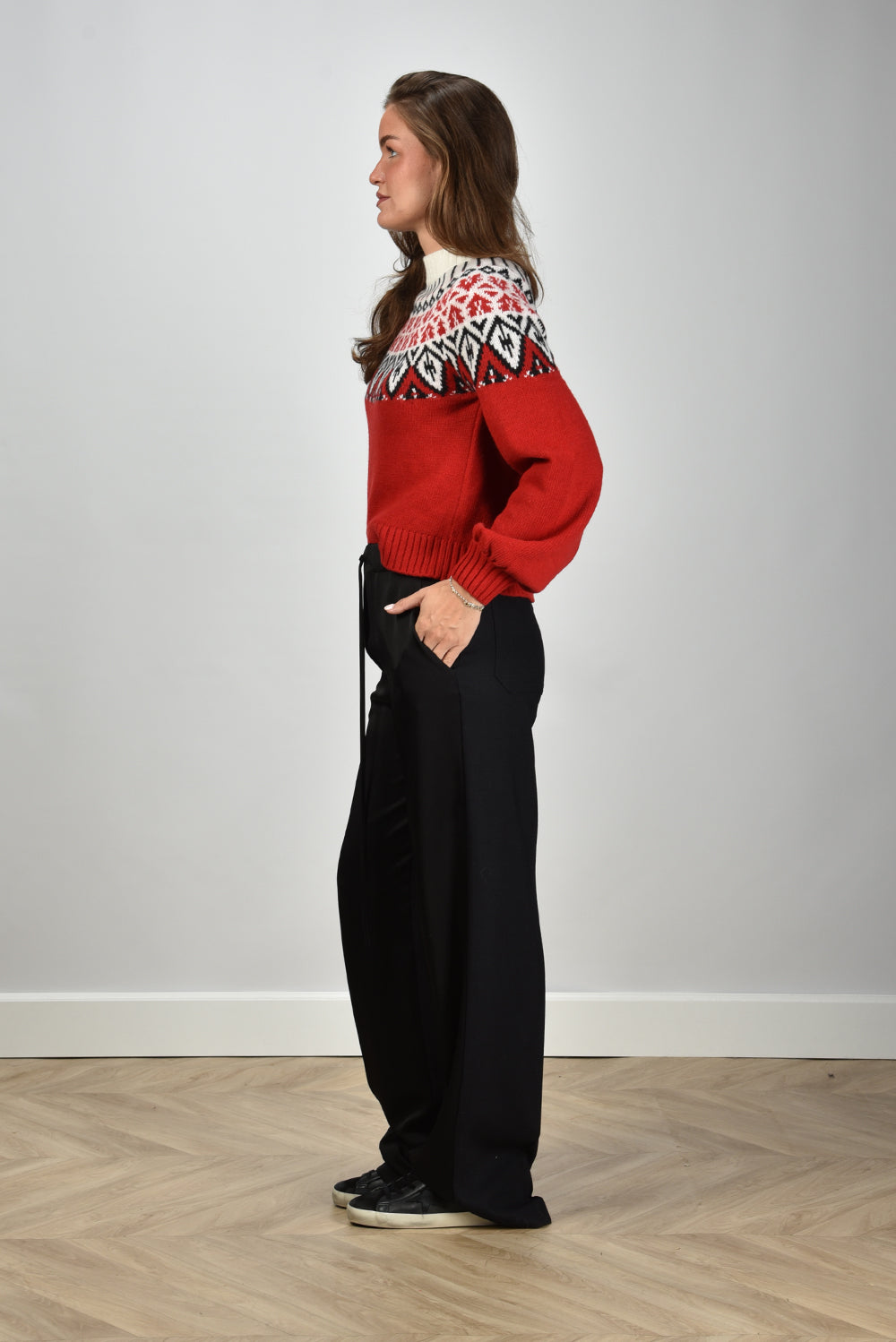 Our model Lise is 1,73m and Lise heeft maat 36/S/27. Dez trui valt normaal op maat