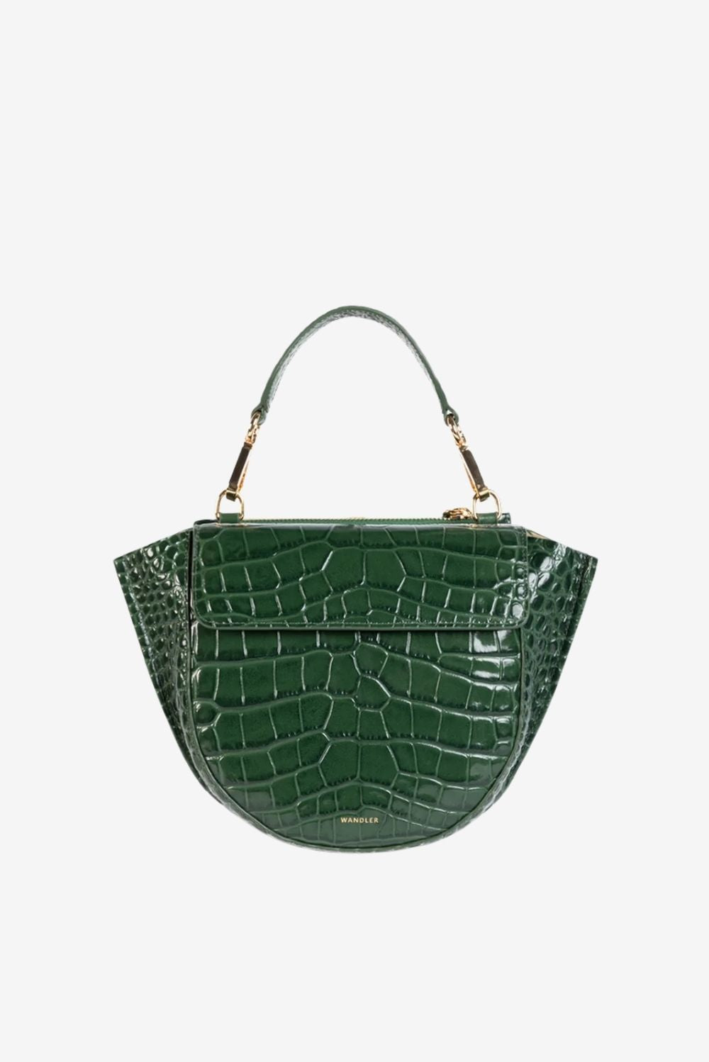 Here is the Wandler crossbody Hortensia Mini in Olive Croco. Crafted from high-quality calf leather, this bag offers an elegant and versatile style. With dimensions of 17.5 x 27 x 5 cm, it is ideal for everyday use. Item number: 24108-000025.2749-Olive Croco.